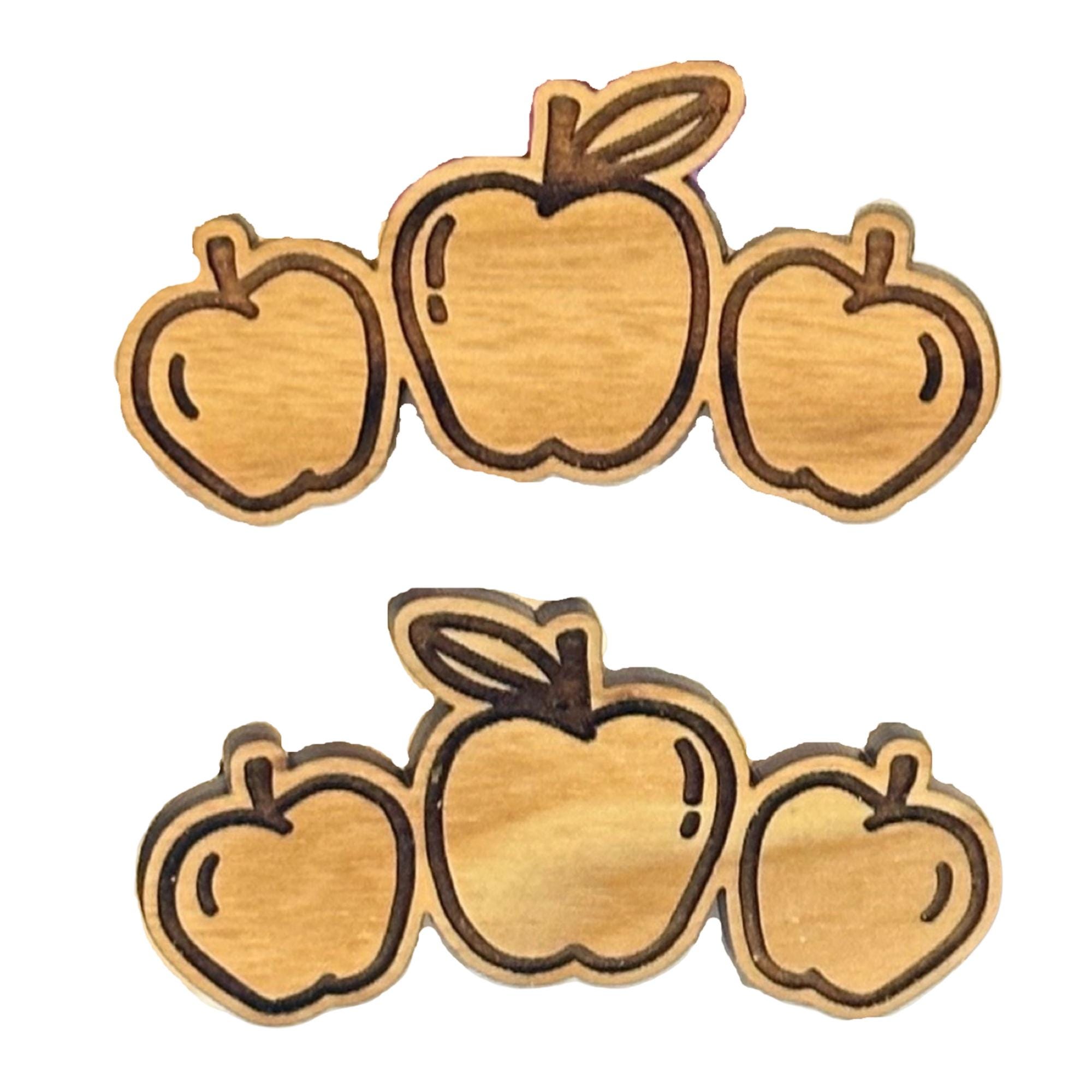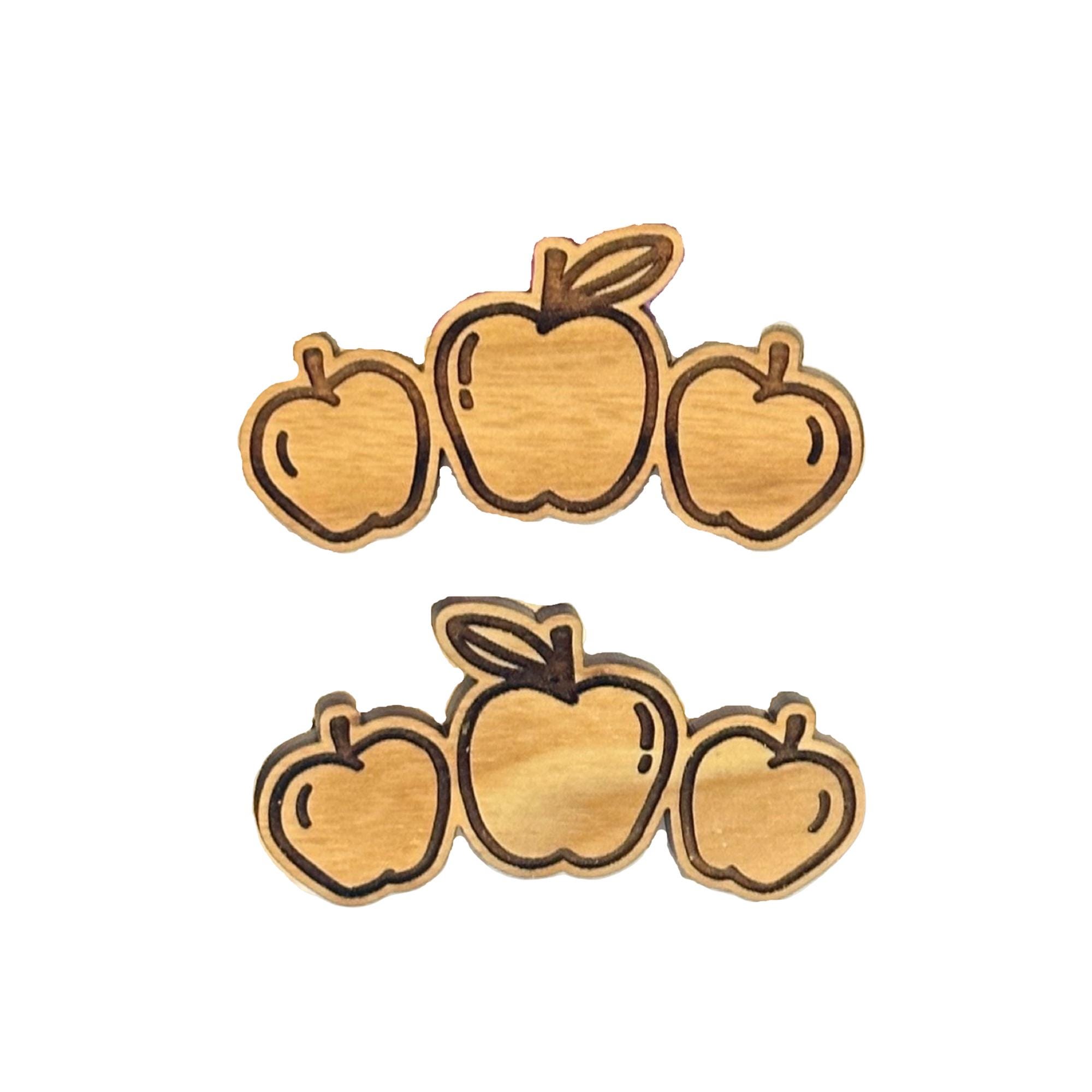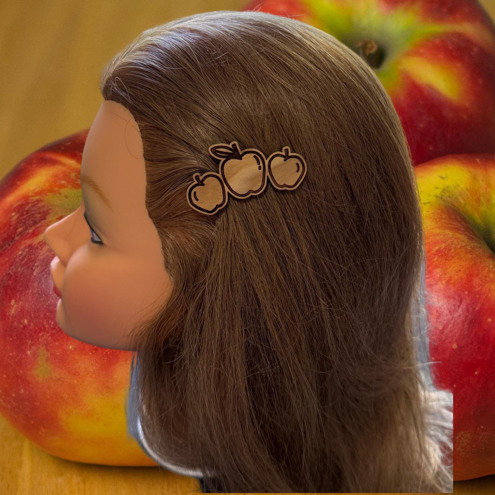 These are a pair of laser cut lightweight three apples wood hair barrettes. They are made from 1/8 in thick medium ash hardwood. They have an alligator clip on them. The clips are nickel plated metal. They are approx. 2” long.