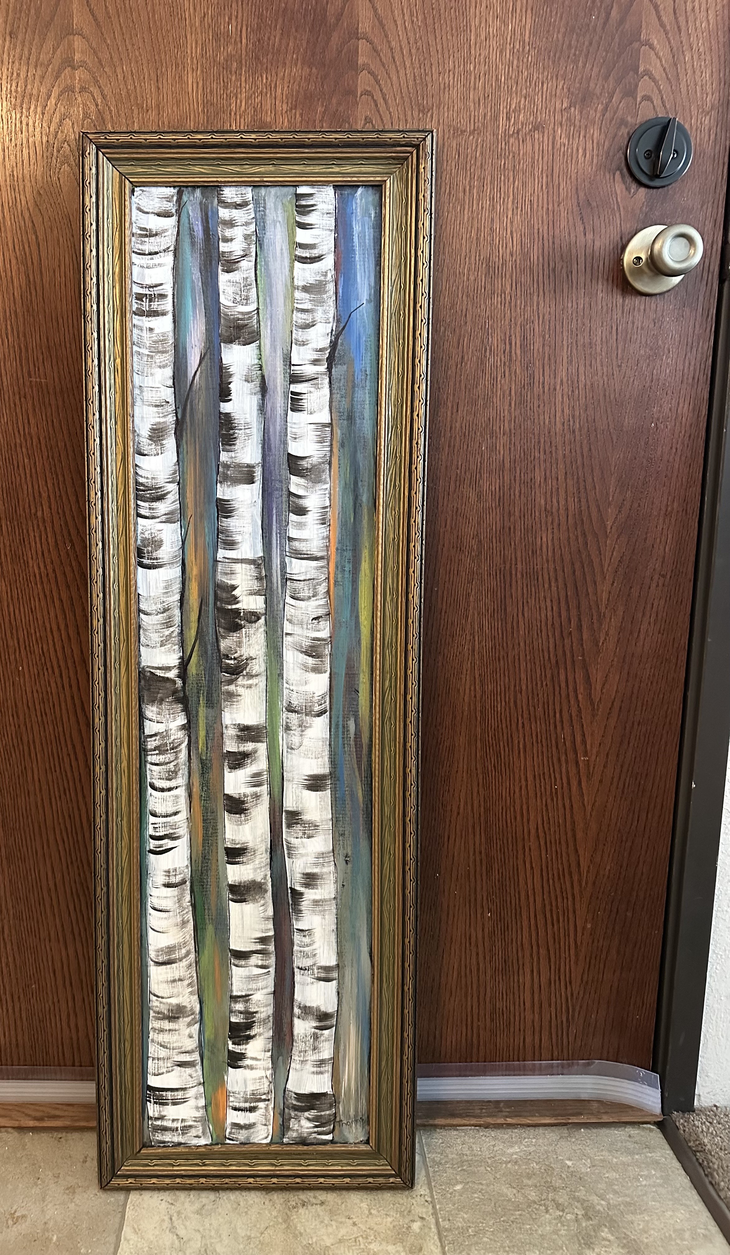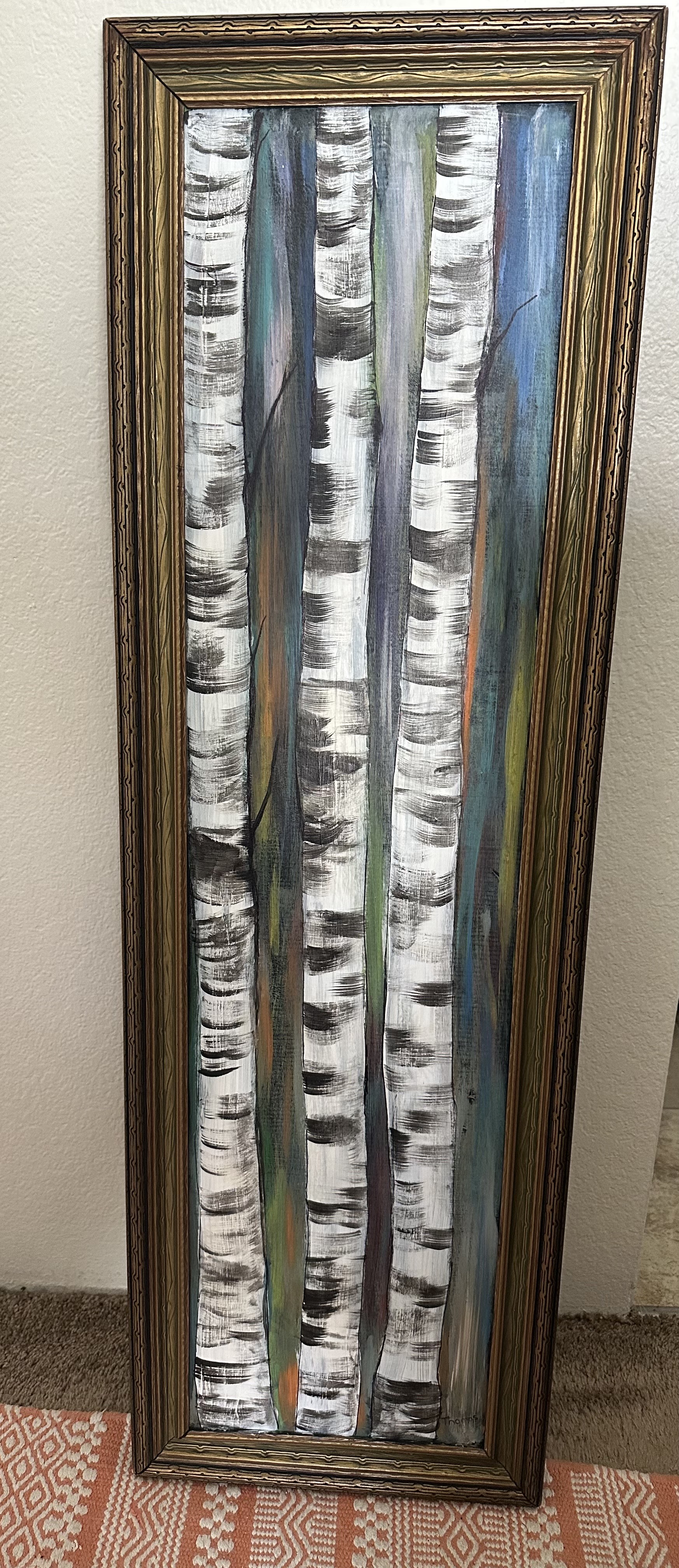 Bold and beautiful Birch trees stand together inside this funky retro frame. Measuring 43 x 14 inches, a unique shape, is ideal for a hallway of entry way or a stand alone in a room. Magical hues of color dance behind the aspen brining them to life right in your home. Enjoy the outdoors indoors with this fun and whimsical piece.