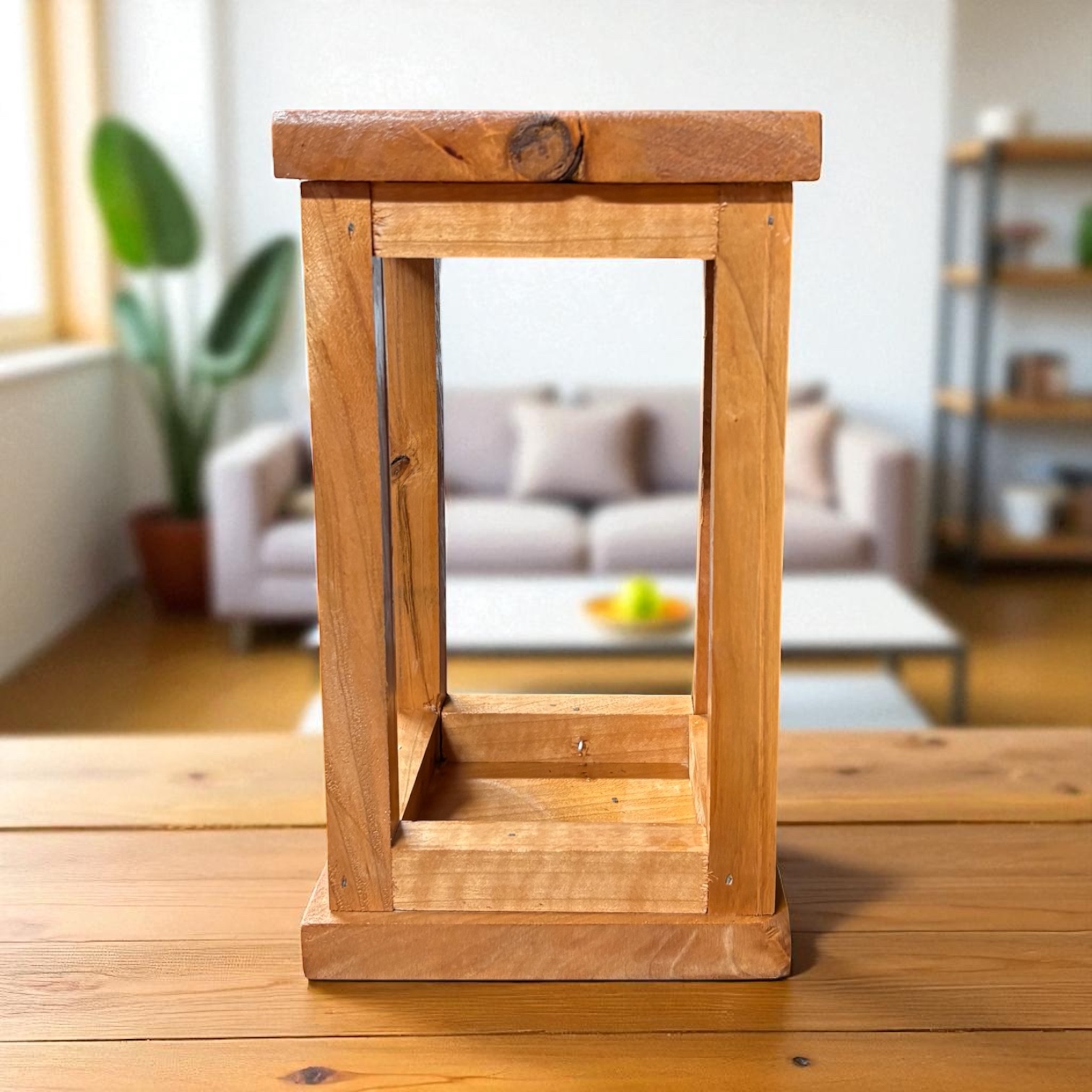 The heights of the candle holders are: 7.75 inches, 9.5 inches, and 13.25 inches. Each is 5.5 inches square. The wood has been finished with polyurethane.
