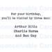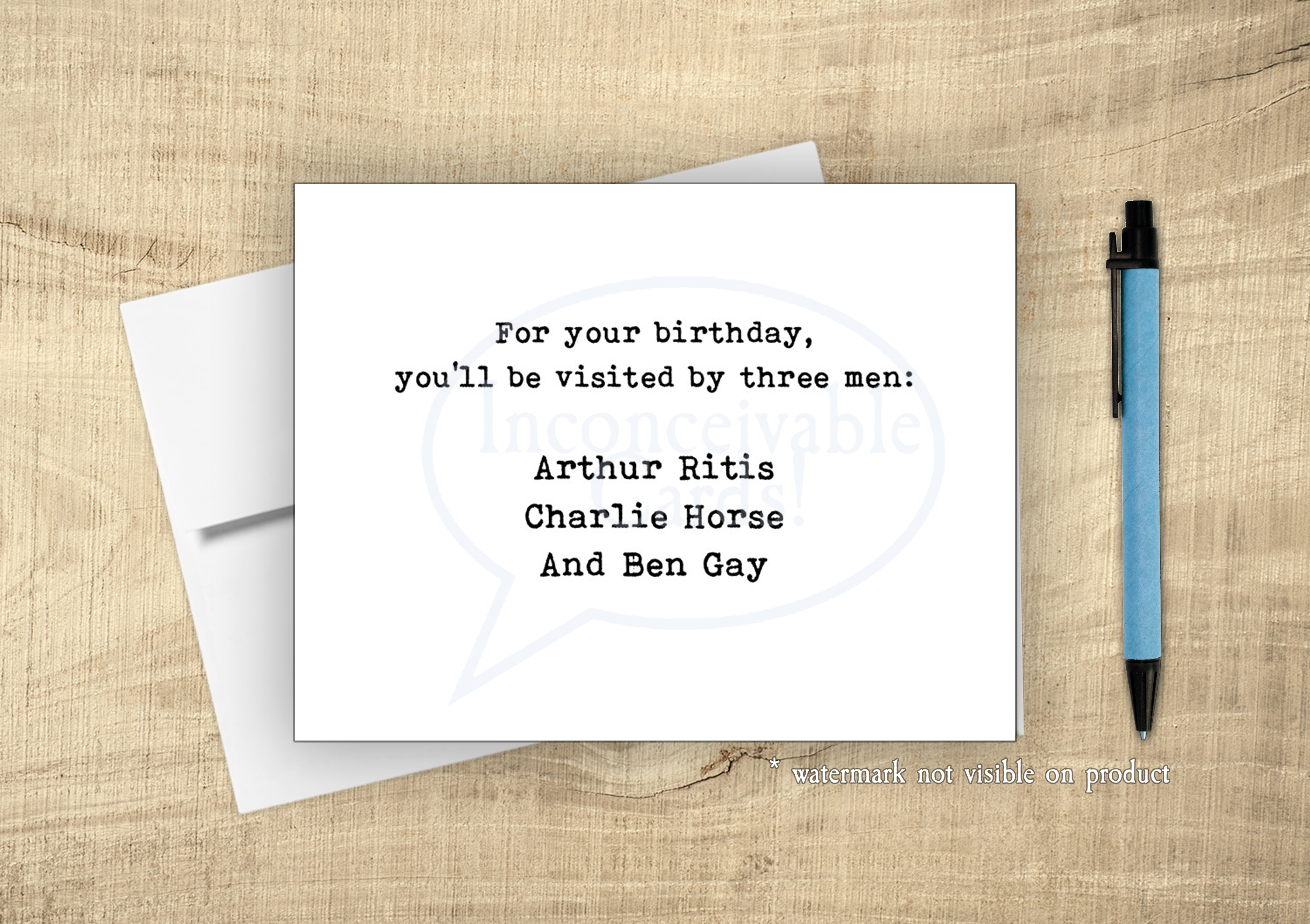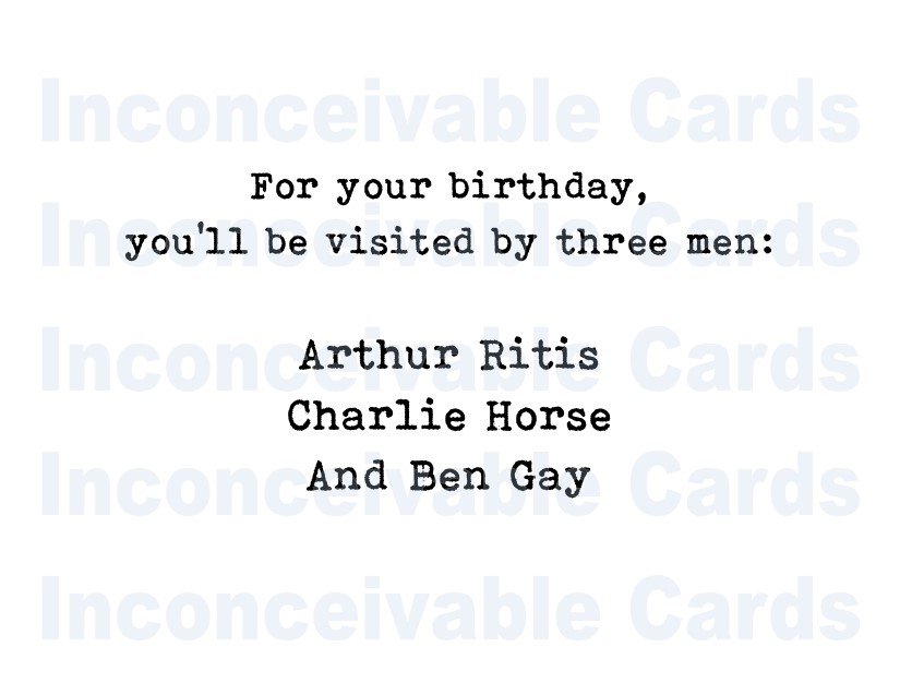 Front Text: For your birthday, you’ll be visited by three men: Arthur Ritis Charlie Horse And Ben Gay