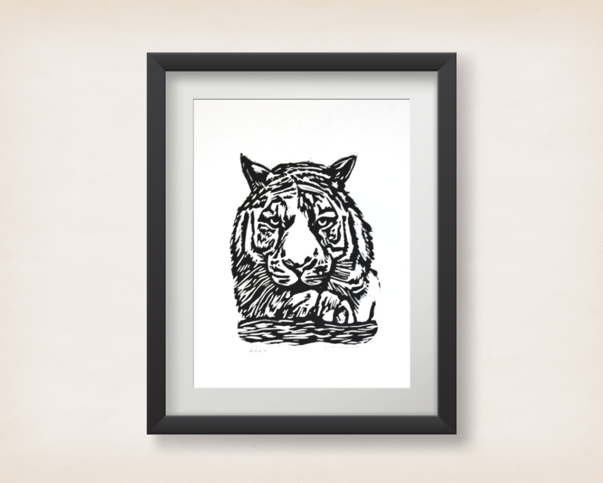 This Tiger linocut print was drawn onto a linoleum block by me and carefully carved using special carving tools, then after all the carving comes the fun part to print! I use quality paper and archival oil-based printing ink for all my linocut prints. I also have a hand press that I print with that gives me nice control over the pressure for each print. This print is truly unique!
