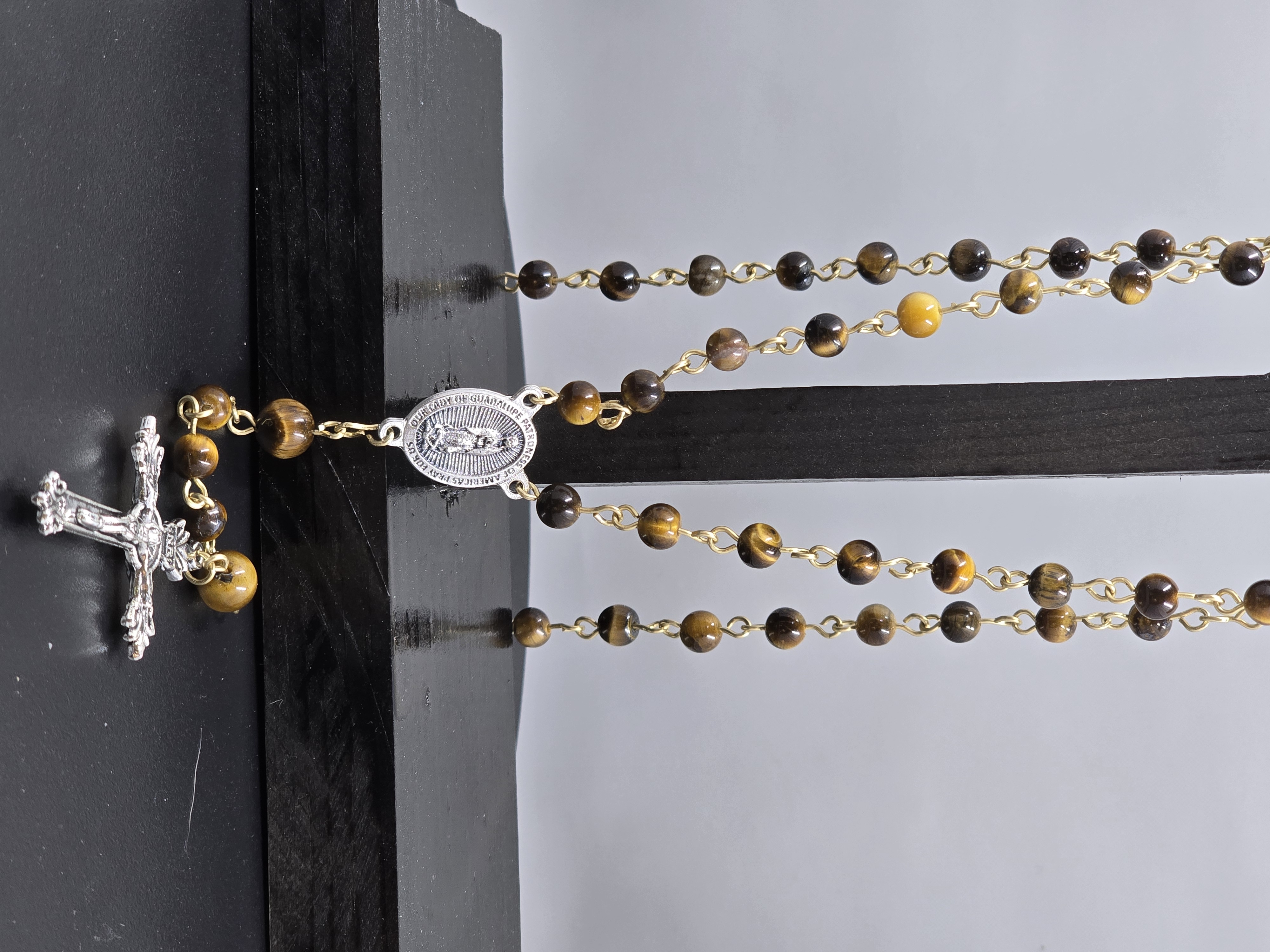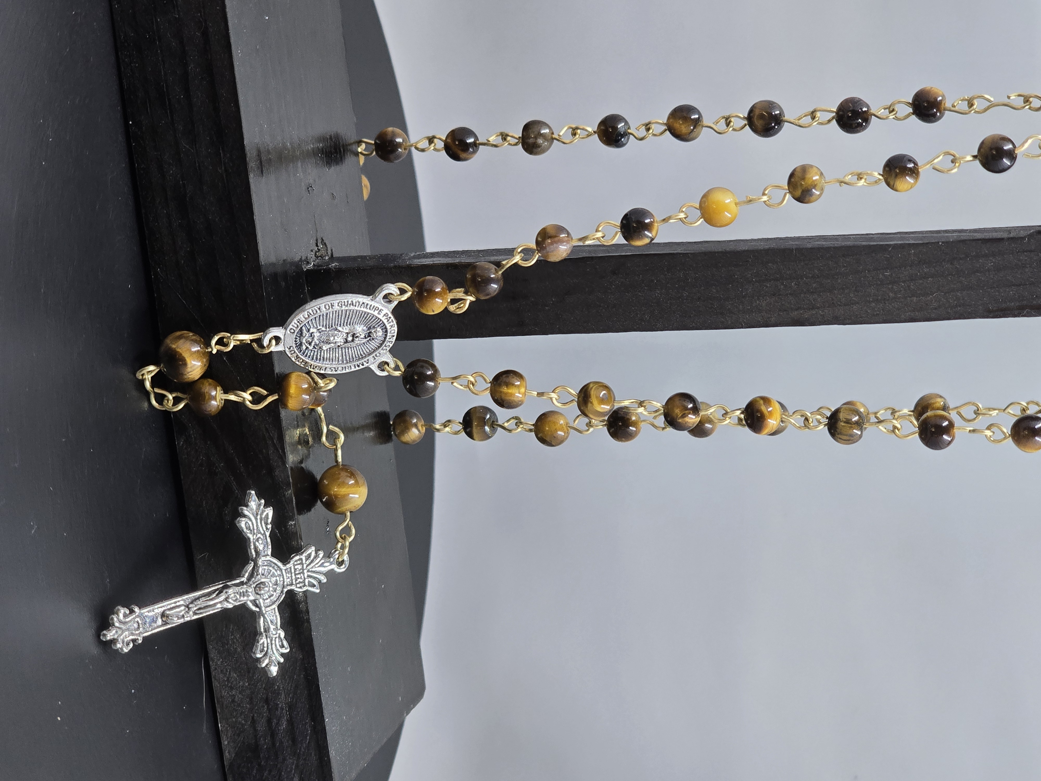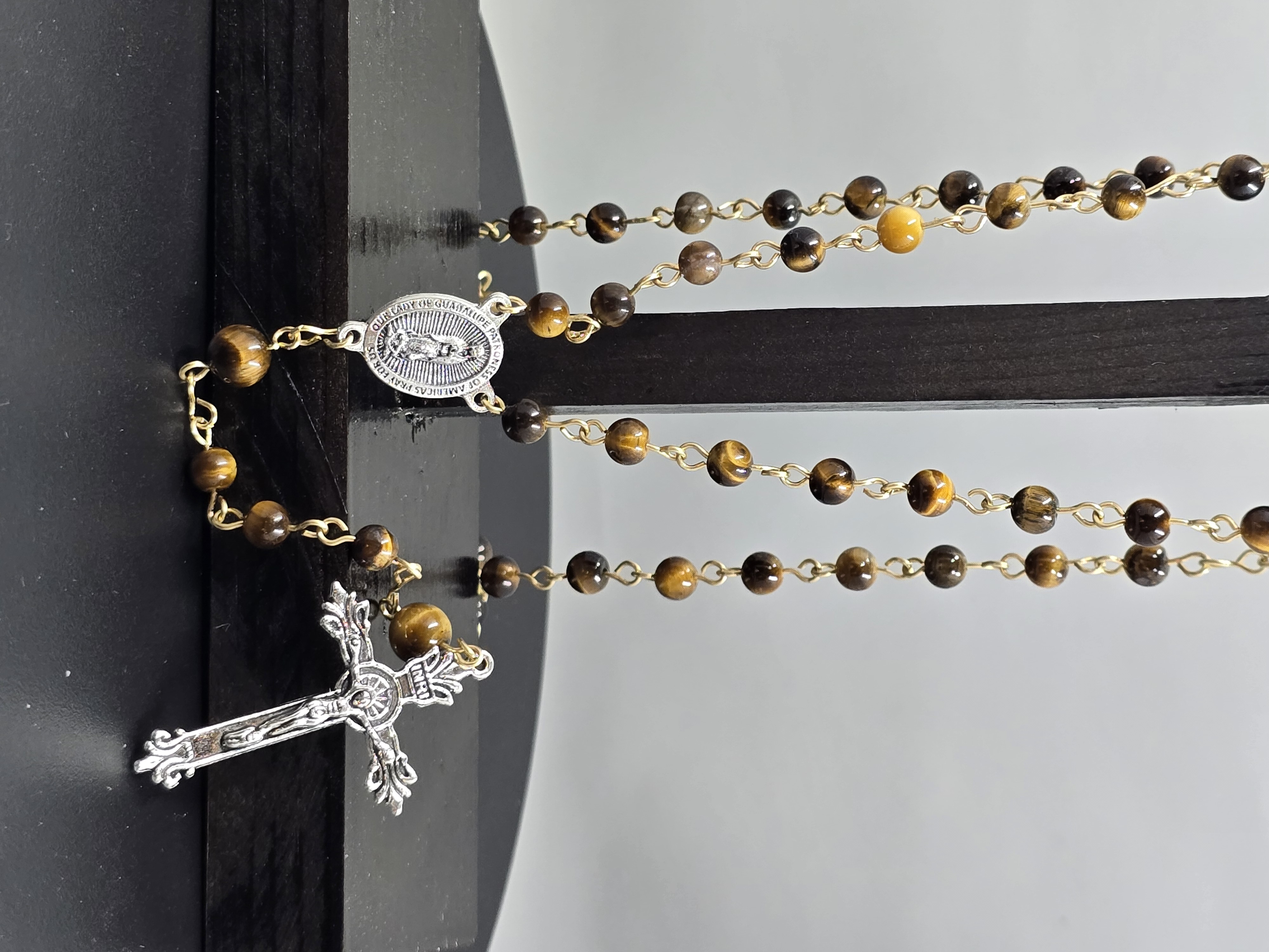 Who doesn't love a little tiger's eye? This beautiful Rosary is made from natural tiger's eye beads and brass wire. This eye catching Rosary is sure to get the attention of anyone who sees it, whether you are praying in church or hanging it from your rear- view mirror for the local law enforcement.