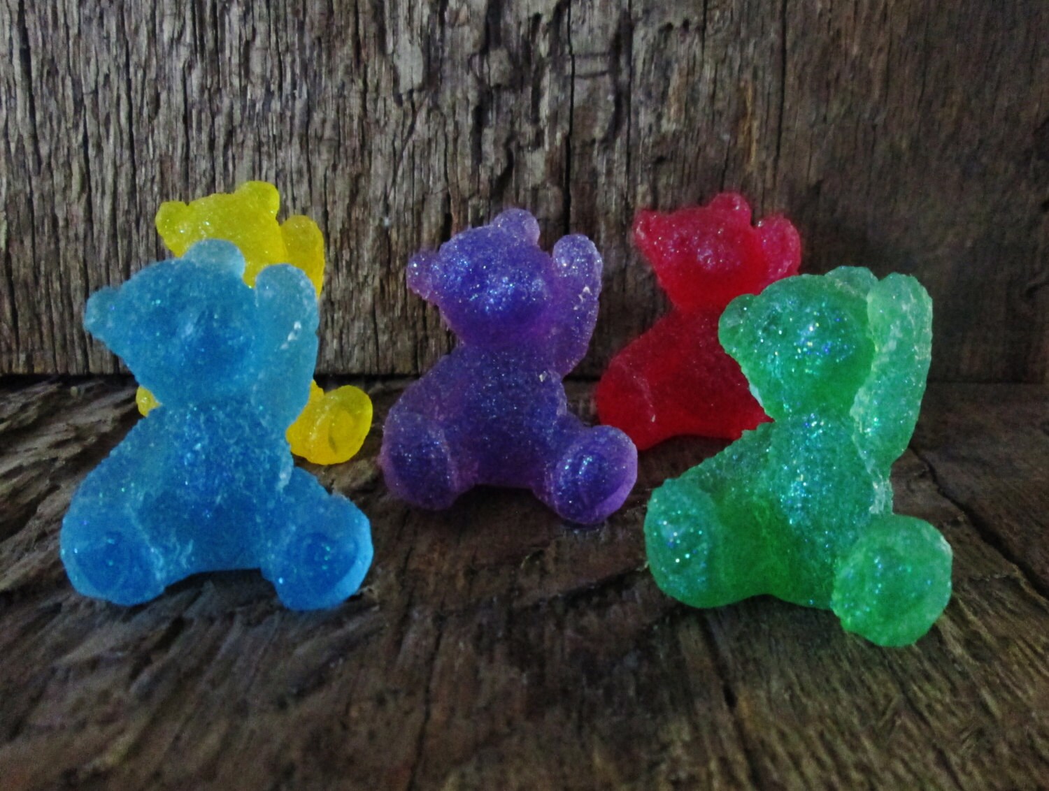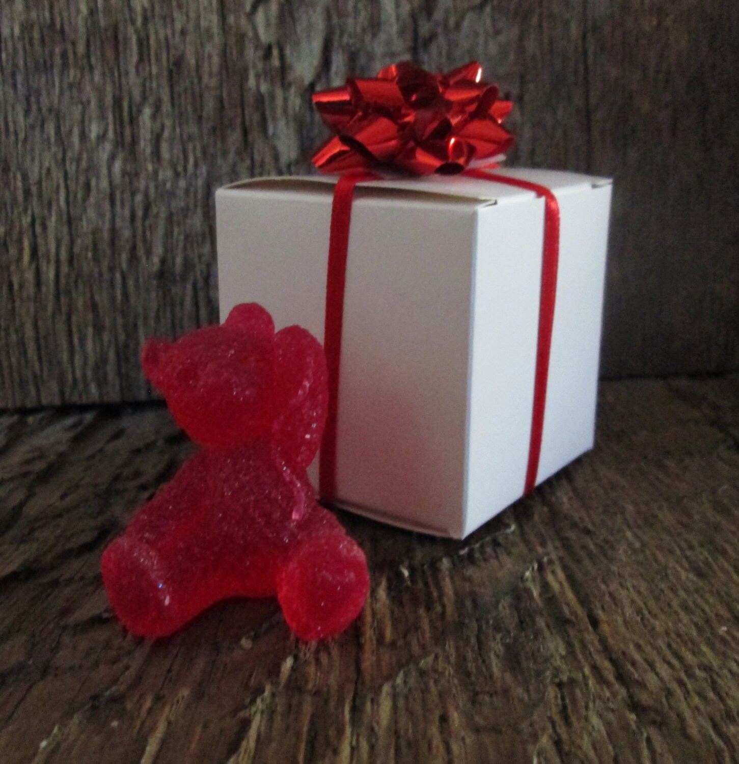 Teeny tiny sparkling glycerin teddy bear soap is nestled in a small gift box tied with a ribbon. Perfect for stocking stuffers, party favors, gift exchange. Each bear is 1 3/4 inches tall and weighs .6 ounce. Ribbon and bow color is random depending on availability.