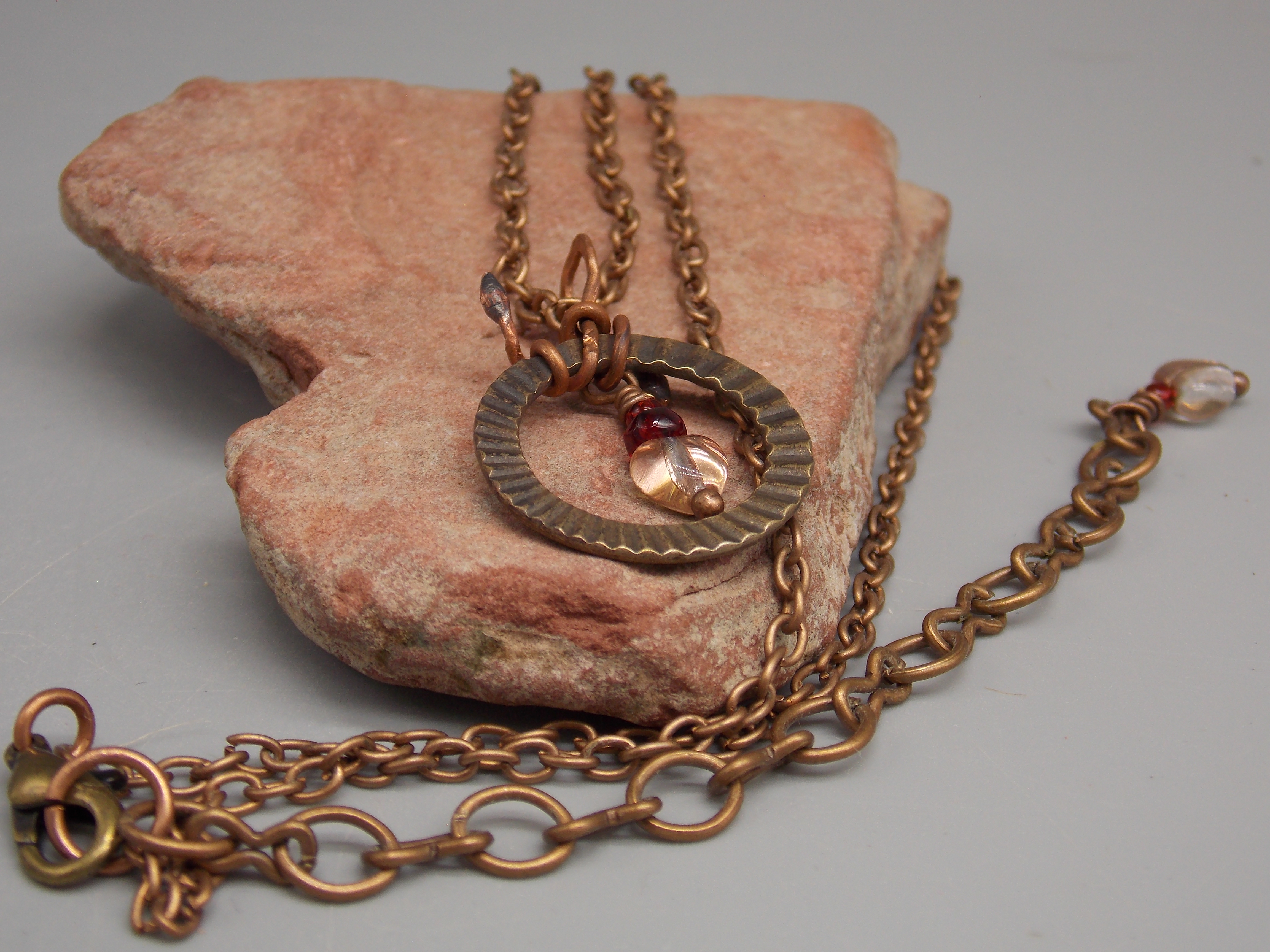 Torched and hammered copper wire. Textured and torched brass circle. Gold/pink Glass Heart, Red glass bead. Antiqued copper chain and extension chain. The necklace is adjustable to 21 inches. The pendant is 1 1/4 inches long