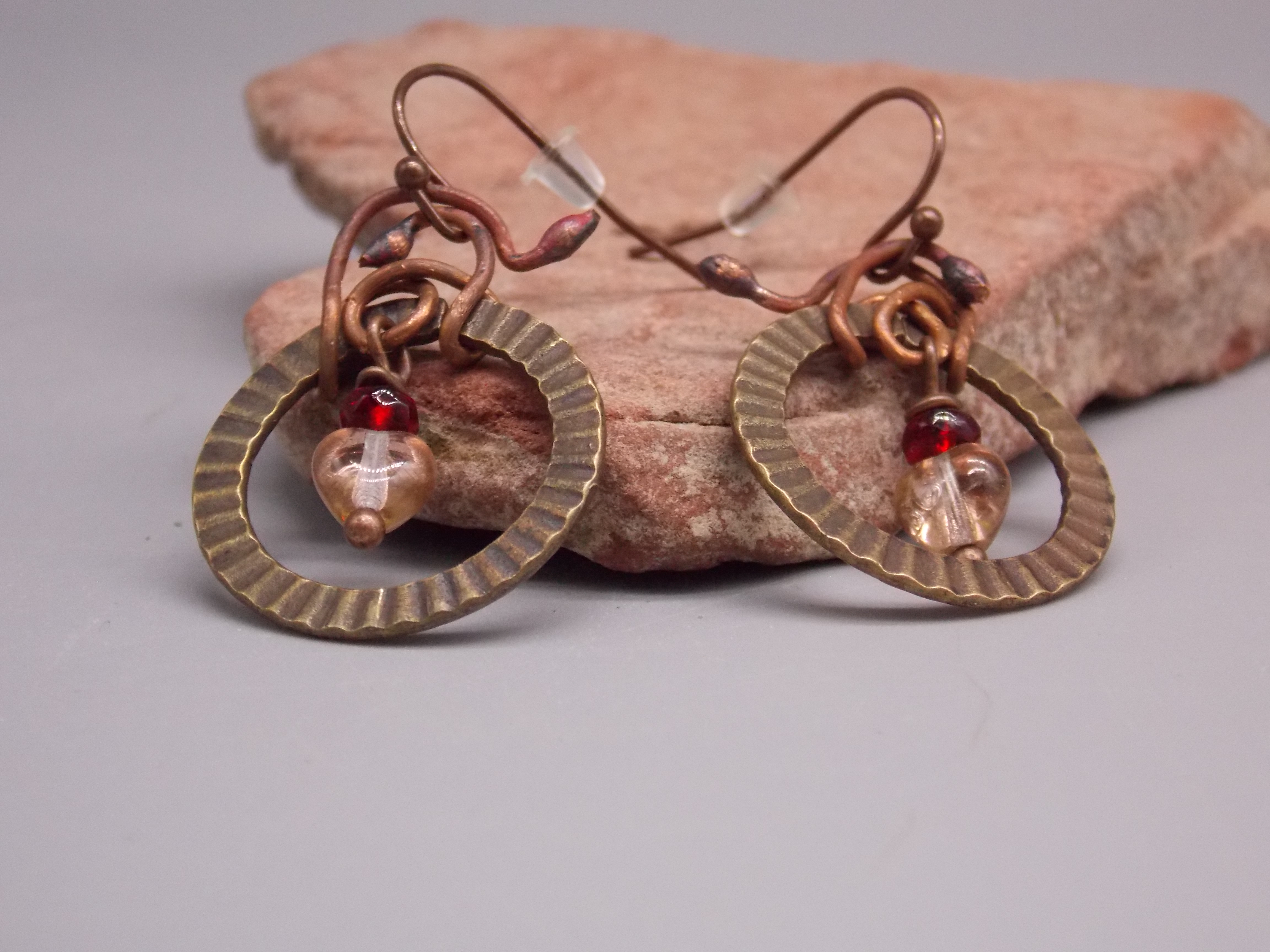 Torched and Hammered copper wire. Textured and hammered brass circle. Gold/pink glass hearts, Red glass beads. Earrings are 1.5 inches long