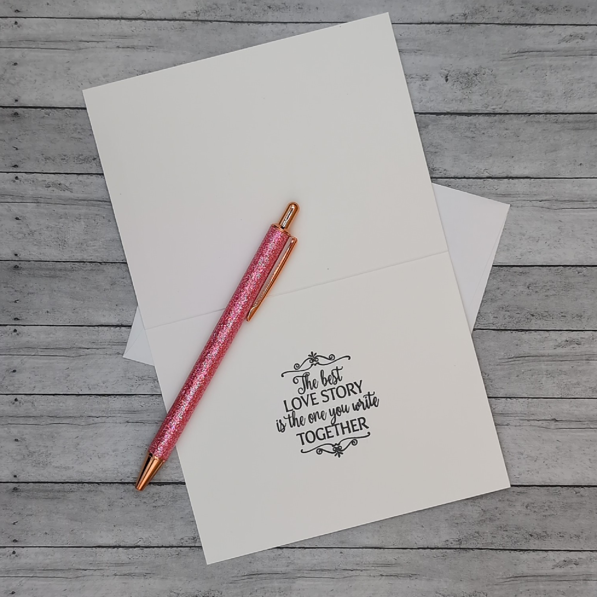 This romantic handcrafted card is a tribute to lasting love. With soft pink tones, perched birds, and elegant script, it features the heartfelt message: “The best LOVE STORY is the one you write TOGETHER.” Ideal for weddings, anniversaries, engagements, or bridal showers, it’s blank inside for your personal note. A keepsake-worthy design for celebrating the journey of two hearts becoming one.