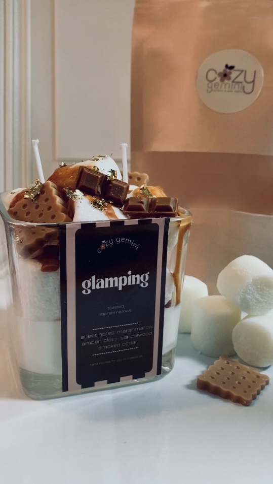 ✨ Glamping Dessert Candle (10oz) Hand-poured all natural soy is luxuriously scented with golden, gooey Toasted Marshmallow- this candle is pure indulgence. It’s topped with a generous helping of ultra-realistic wax marshmallows, a rich fudge wax drizzle, and finished with an elegant gold flakes all hand-crafted for maximum visual (and aromatic) impact. Double wicked for a clean burn, though let’s be honest — this one might be too cute to light.