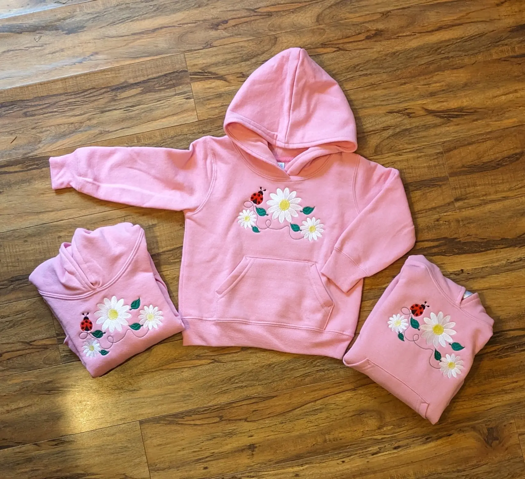 Your toddler will look adorable in this hoodie! It’s made from a soft cotton/poly blend and features an adorable embroidered design of white daisies and a playful ladybug on the front.