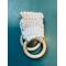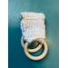 This kitchen towel holder is made of 100% acrylic yarn.   It is designed to go over a drawer pull or oven door handle.  The towel is then placed through the two wooden rings to hold the towel firmly in place.   These have been a life changer for me!  No more bending down and picking up the towel off the floor constantly!