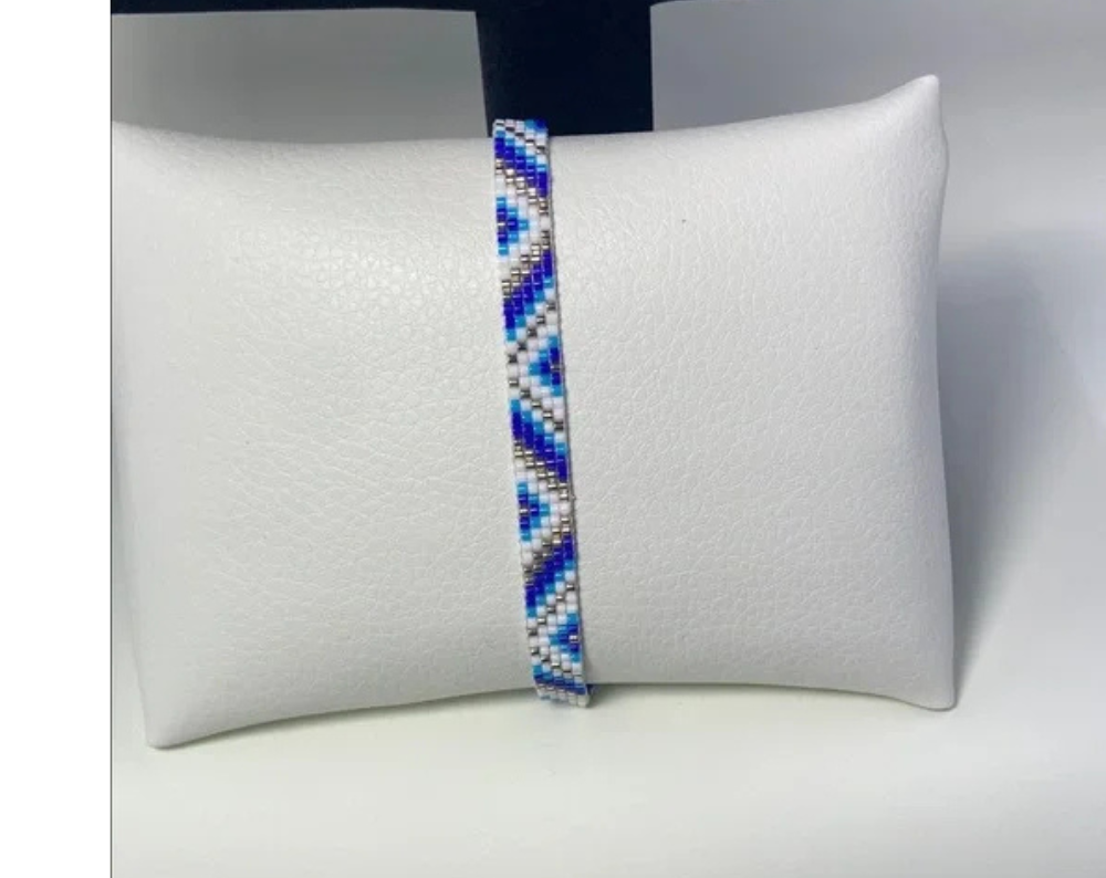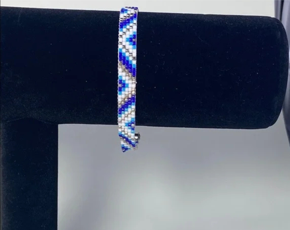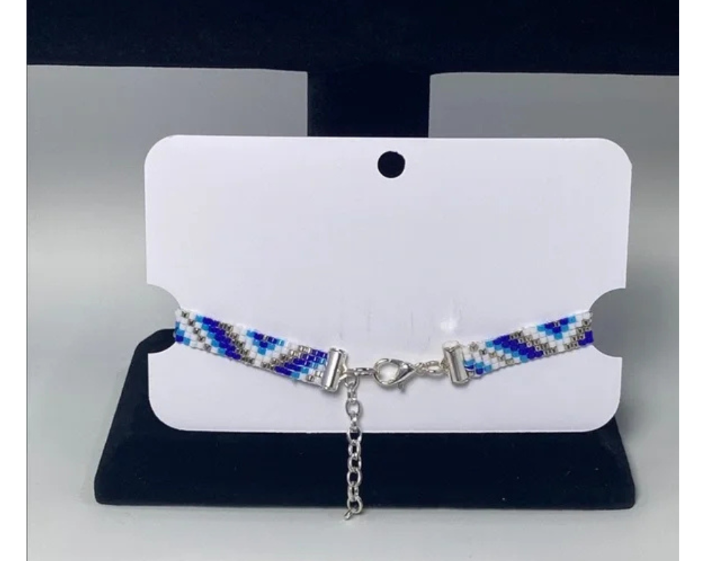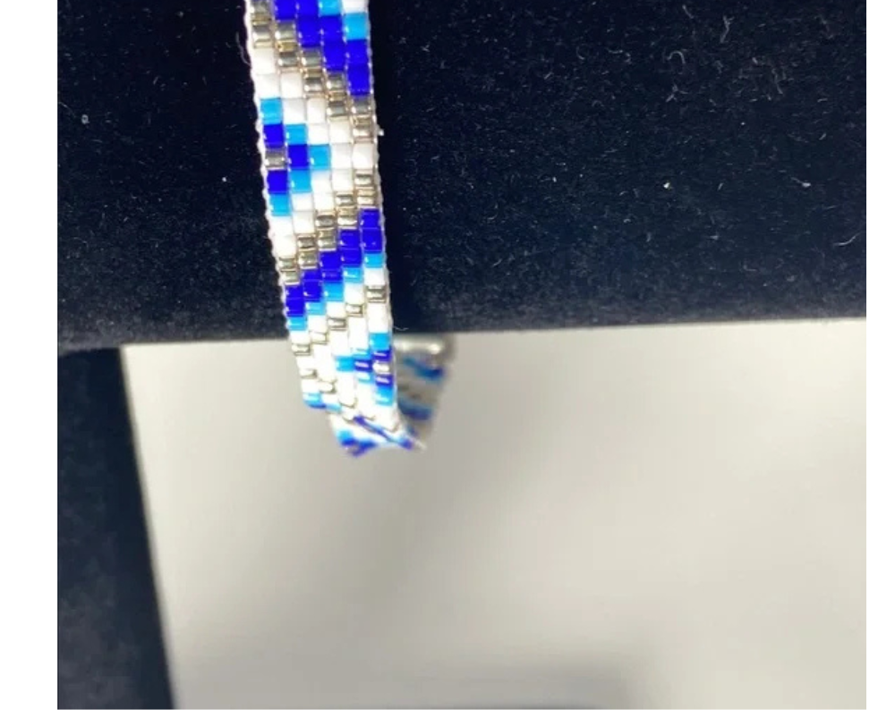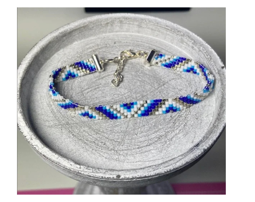 Elegant handcrafted bracelet with intricate blue and white beadwork. Ideal for any style.