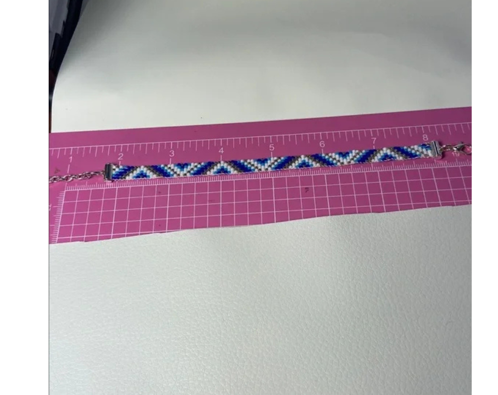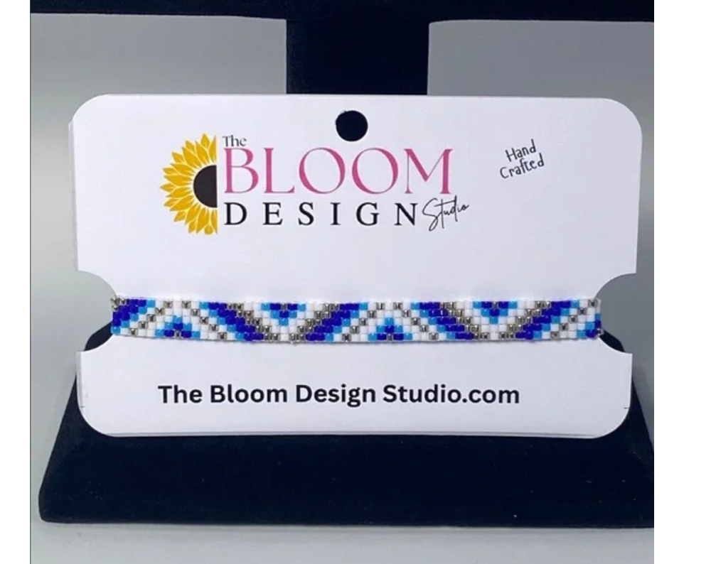 Each of our handcrafted loom-beaded bracelets begins its journey with a detailed design pattern, thoughtfully created to ensure a stunning final product. The process starts by setting up a specialized jewelry loom, which serves as the foundation for weaving. Using high-quality Japanese glass Miyuki Delica seed beads in size 11/0, known for their uniformity and vibrant colors, we meticulously string each bead to follow the intricate pattern.