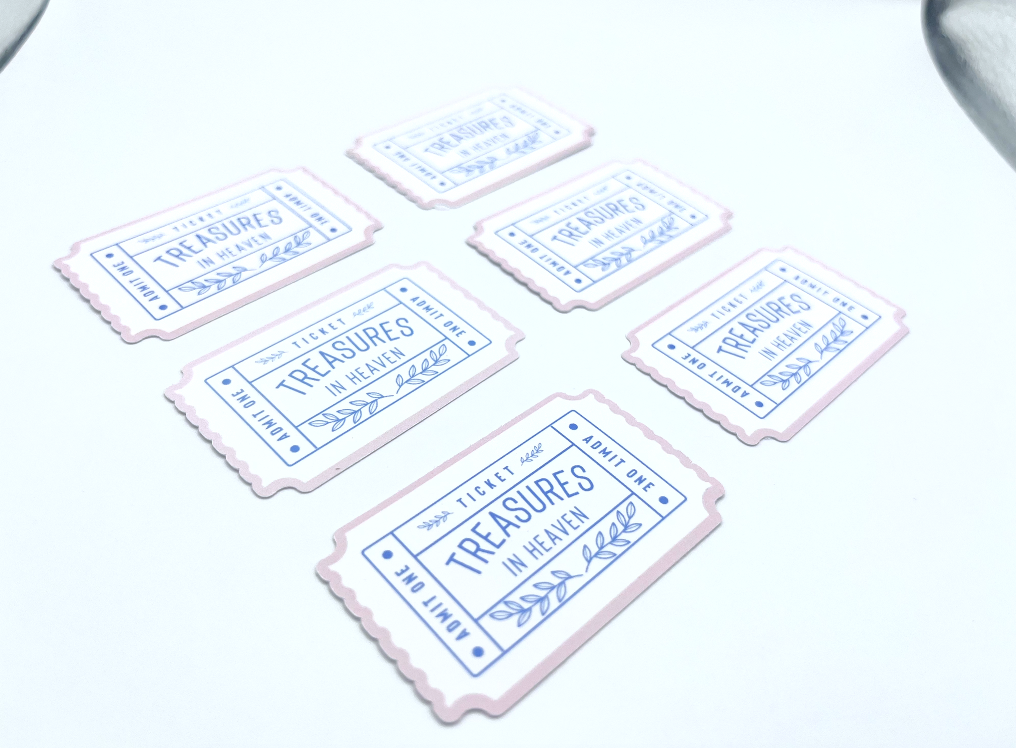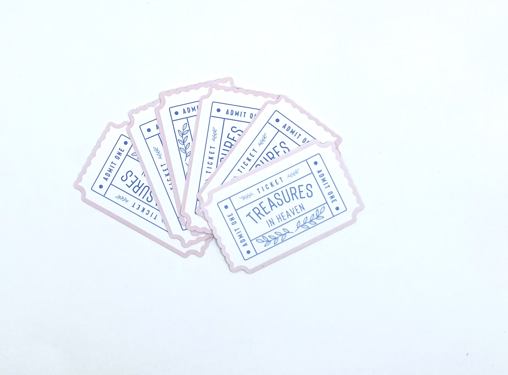 Store your treasures where they last forever. The Treasures in Heaven Ticket Sticker is a gentle, everyday reminder of what truly matters. These Christian Stickers have distinctive ticket design and matte finish, it encourages you to set your heart on eternal things — not the temporary ones.