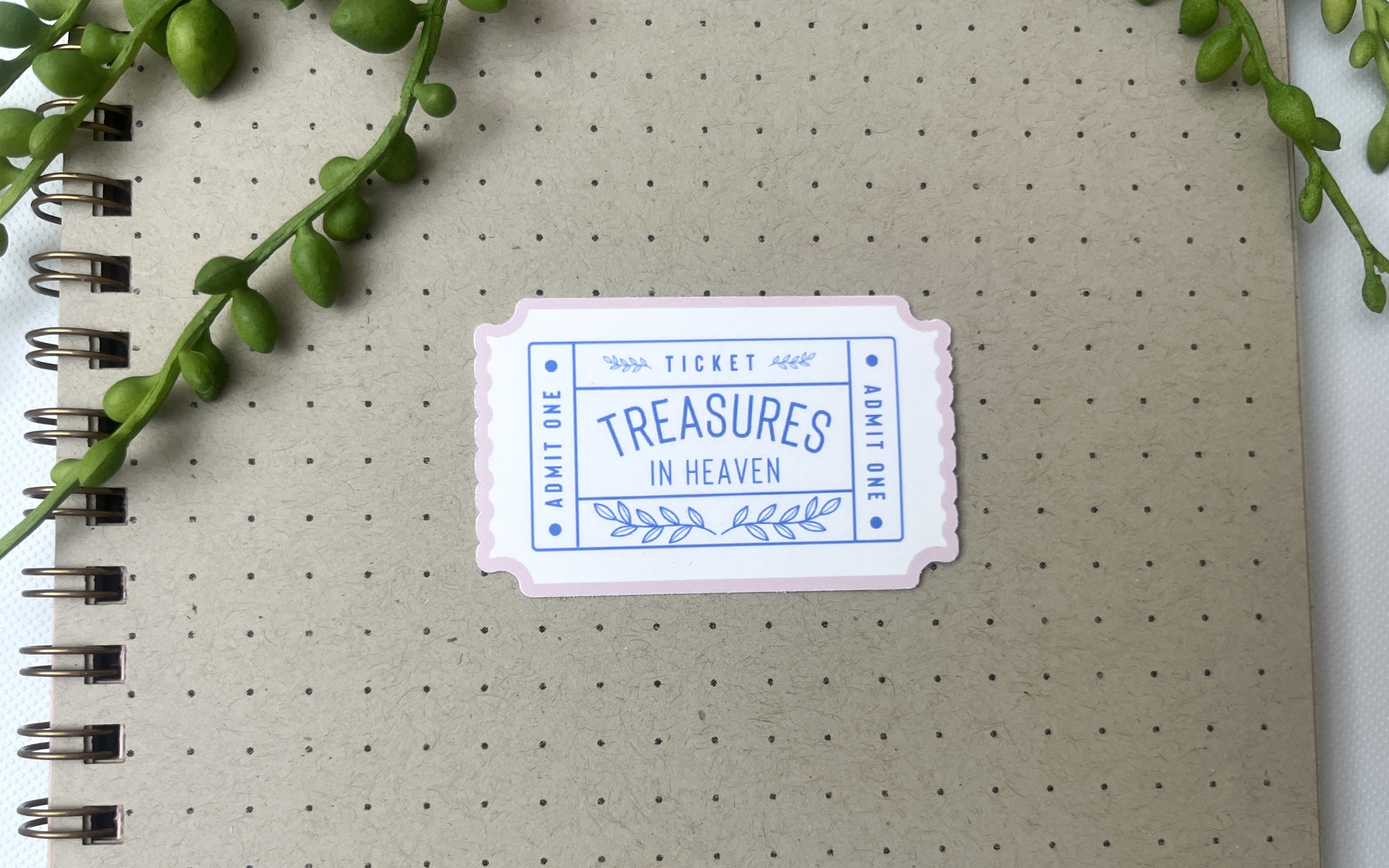Treasures in Heaven Ticket Sticker – Matte Christian Verse Art | Faith Encouragement & Verse Art Gift