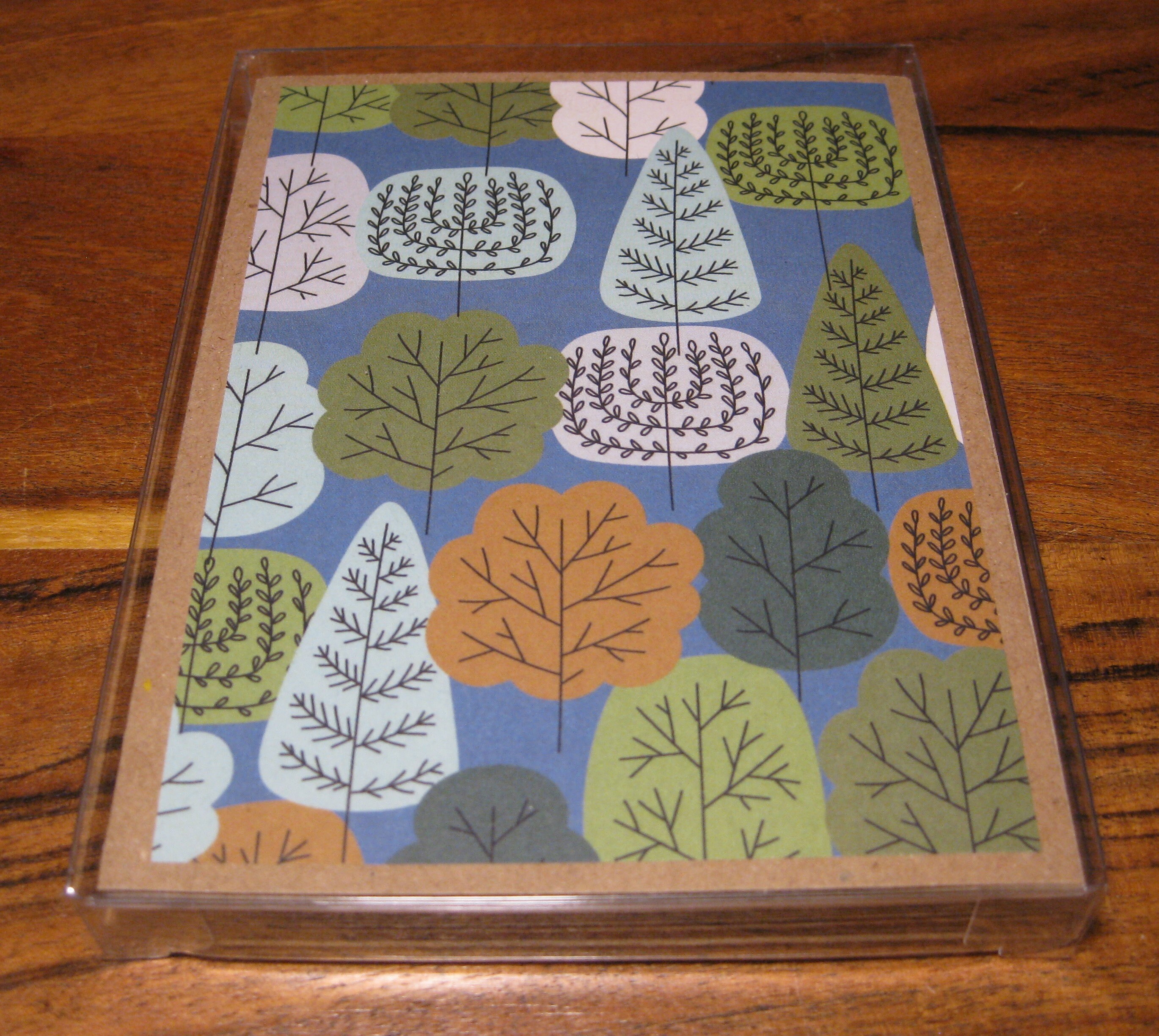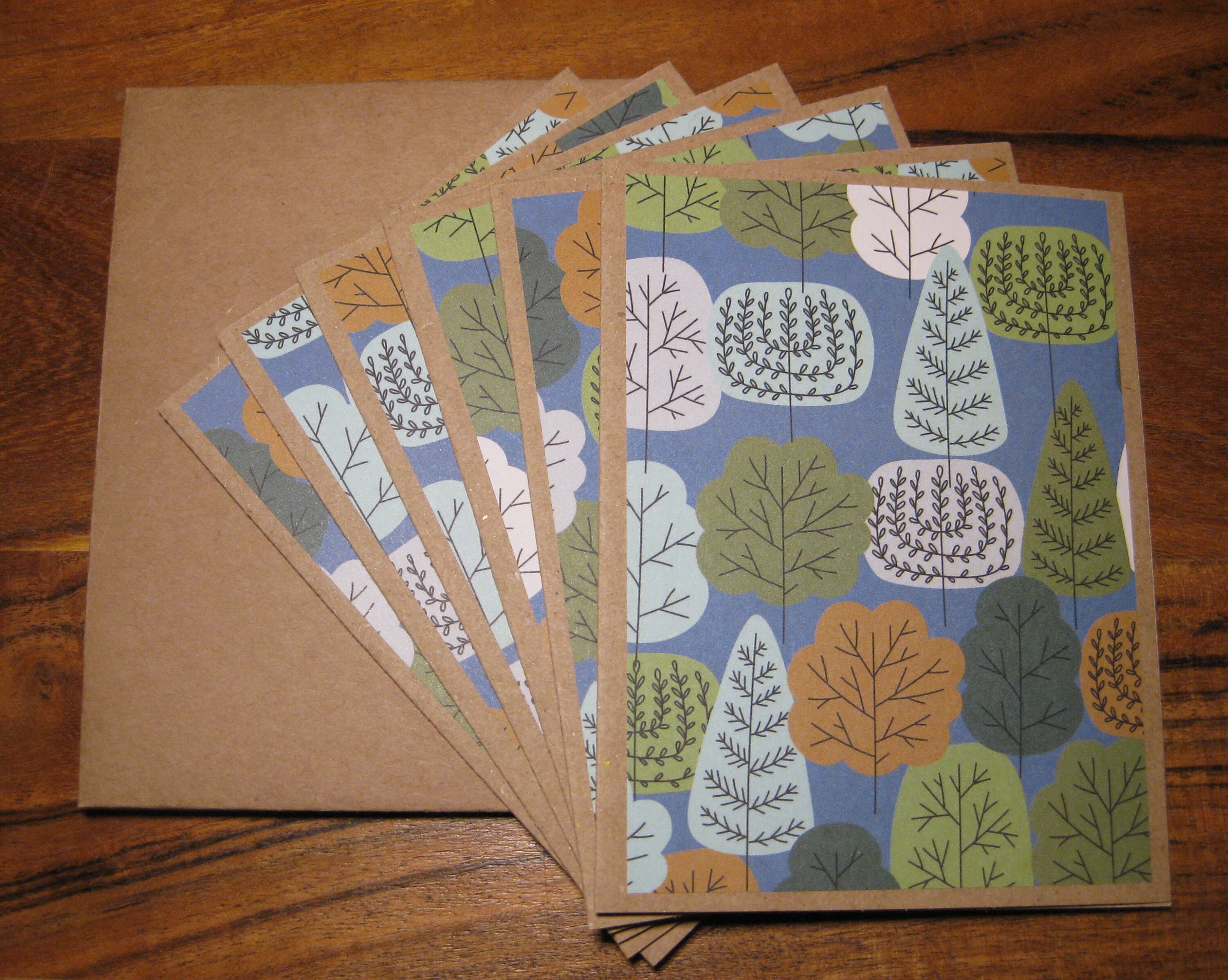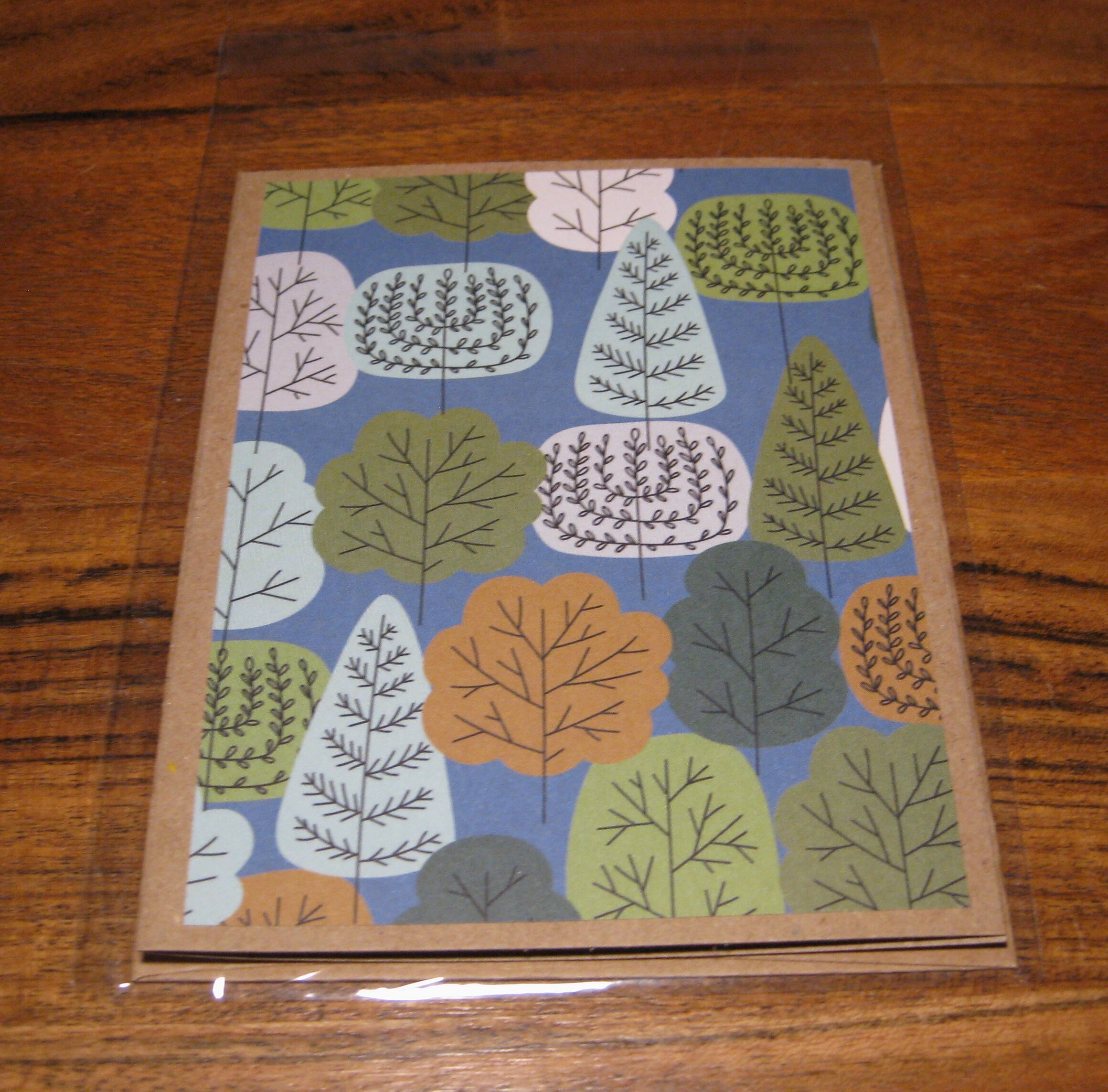 6 Tree notecards on kraft cardstock with 6 kraft envelopes. Details: Variety of trees on a slate blue background mounted on kraft cardstock