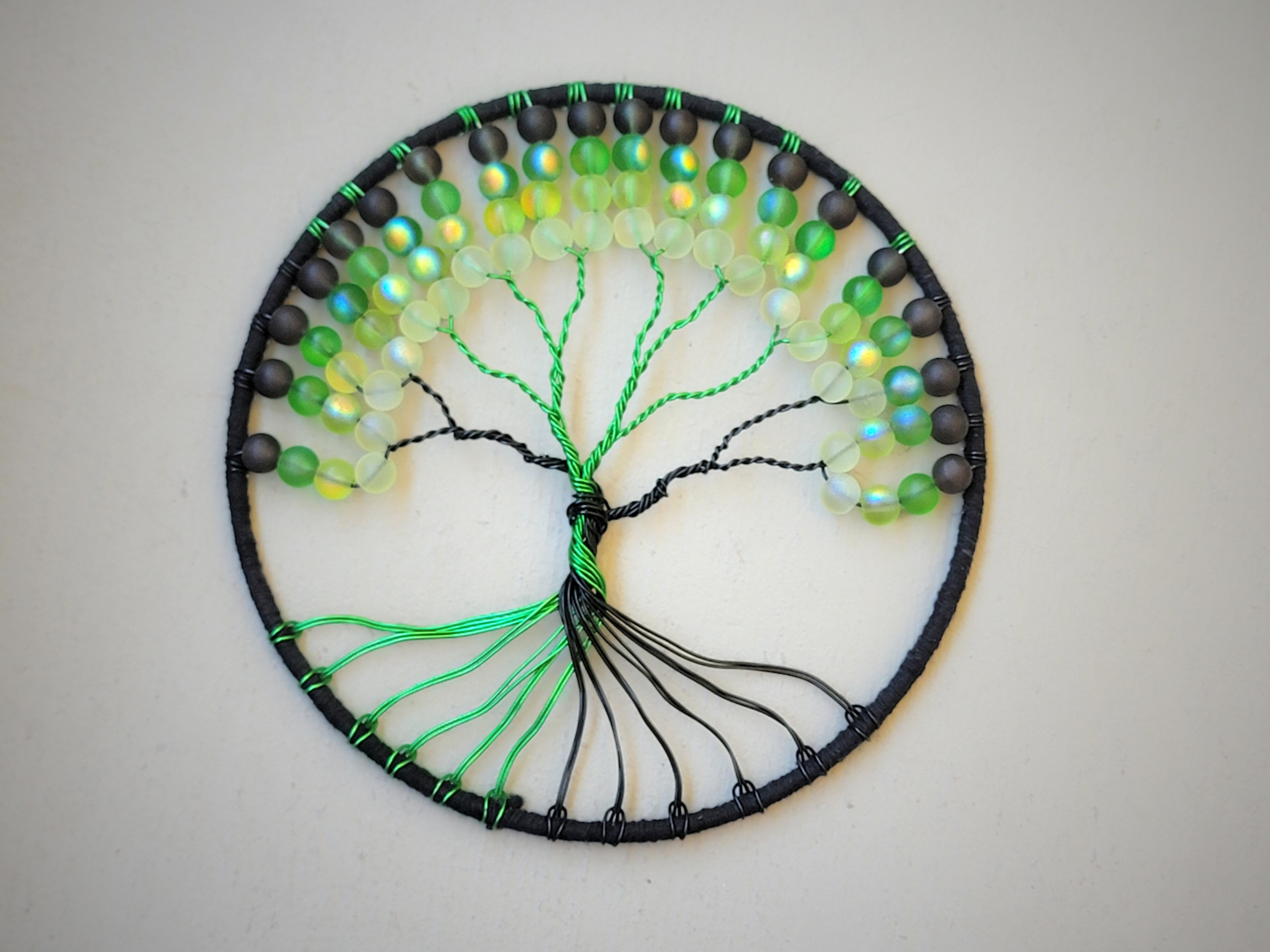 This 6-inch Tree of Life features black wire roots and trunk wrapped in black yarn, accented with glowing green and matte beads for a bold, Halloween-inspired look. A unique suncatcher or wall piece to bring a touch of spooky charm to your space.