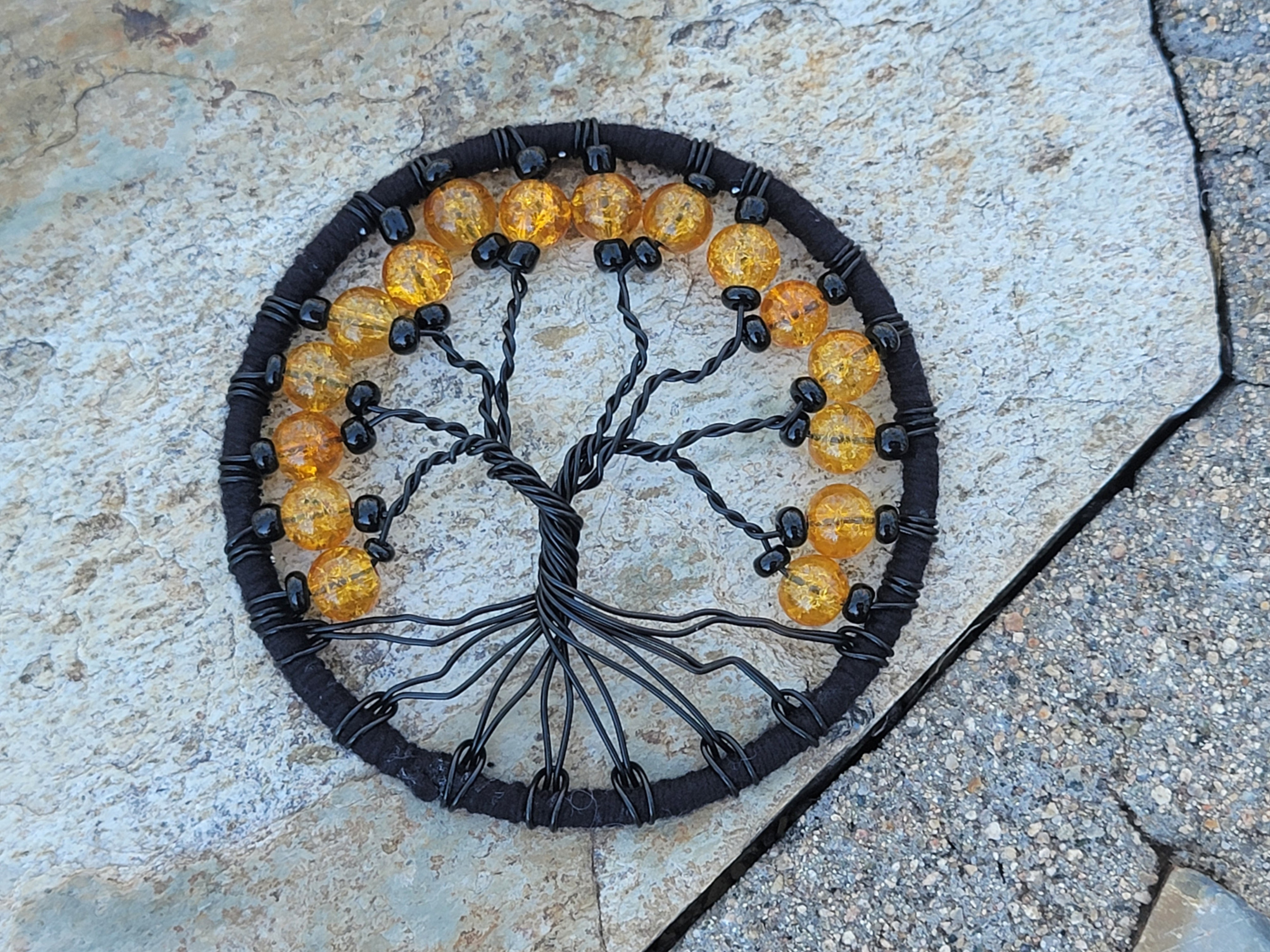 A spooky little beauty for your Halloween décor! This 3-inch Tree of Life features a black yarn-wrapped hoop, twisted black wire branches, black seed bead accents, and glowing orange crackle beads that give it a festive pop. Perfect for adding a touch of Halloween magic to windows, altars, or small spaces.