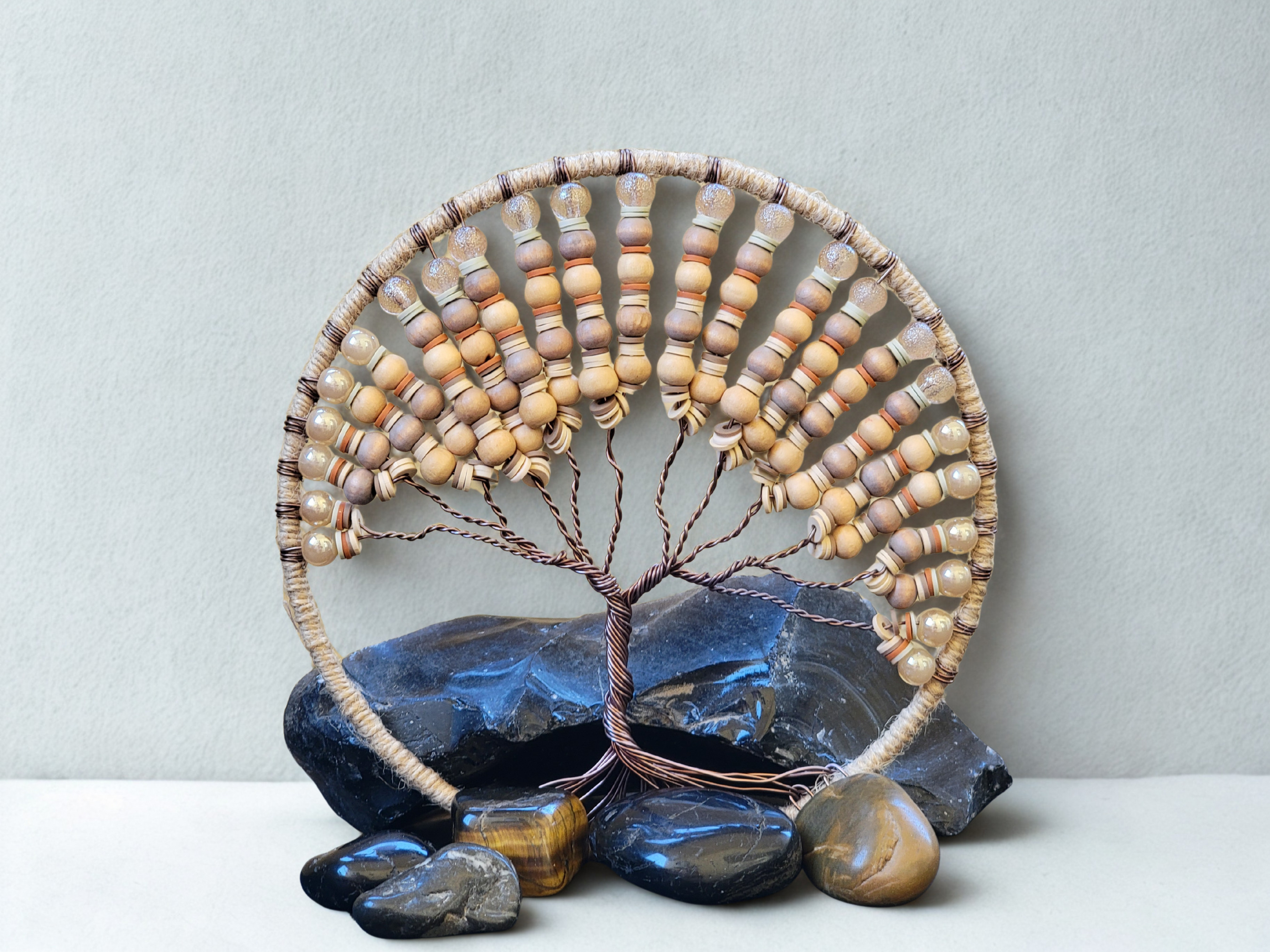 This 6 inch handcrafted Tree of Life wall hanging is made with warm earth-toned wooden beads, shimmering accents, and a twisted brown wire trunk. The natural colors and organic design make it a beautiful addition to boho, rustic, or spiritual-inspired spaces. A unique piece of art that brings balance, grounding energy, and earthy charm to your home or a thoughtful handmade gift for someone special.