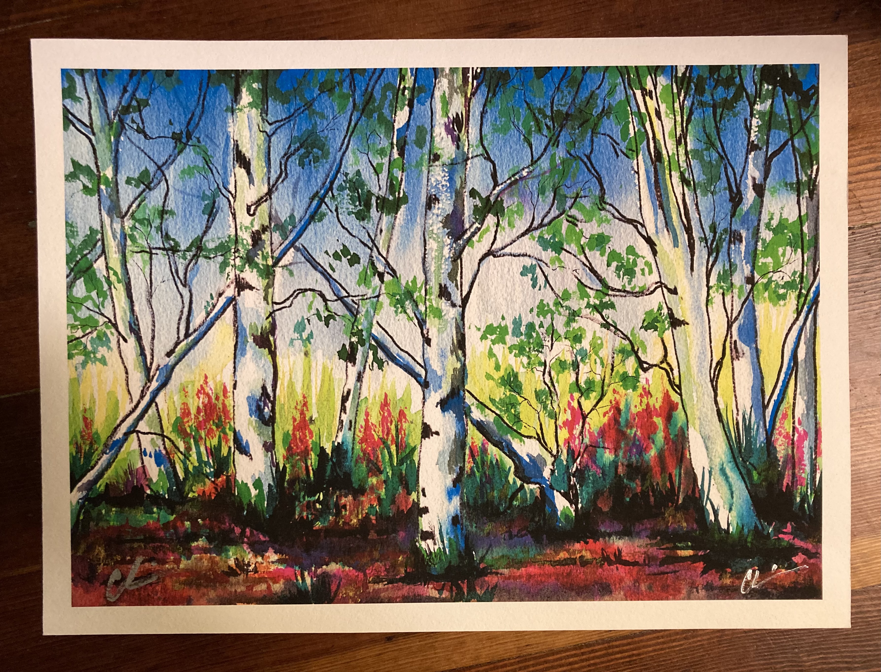 “In The Woods” is a signed and numbered limited edition of 100 giclée print on watercolor paper. Image size is 9.75” x 13.75” with a 1/2” white border surrounding it.