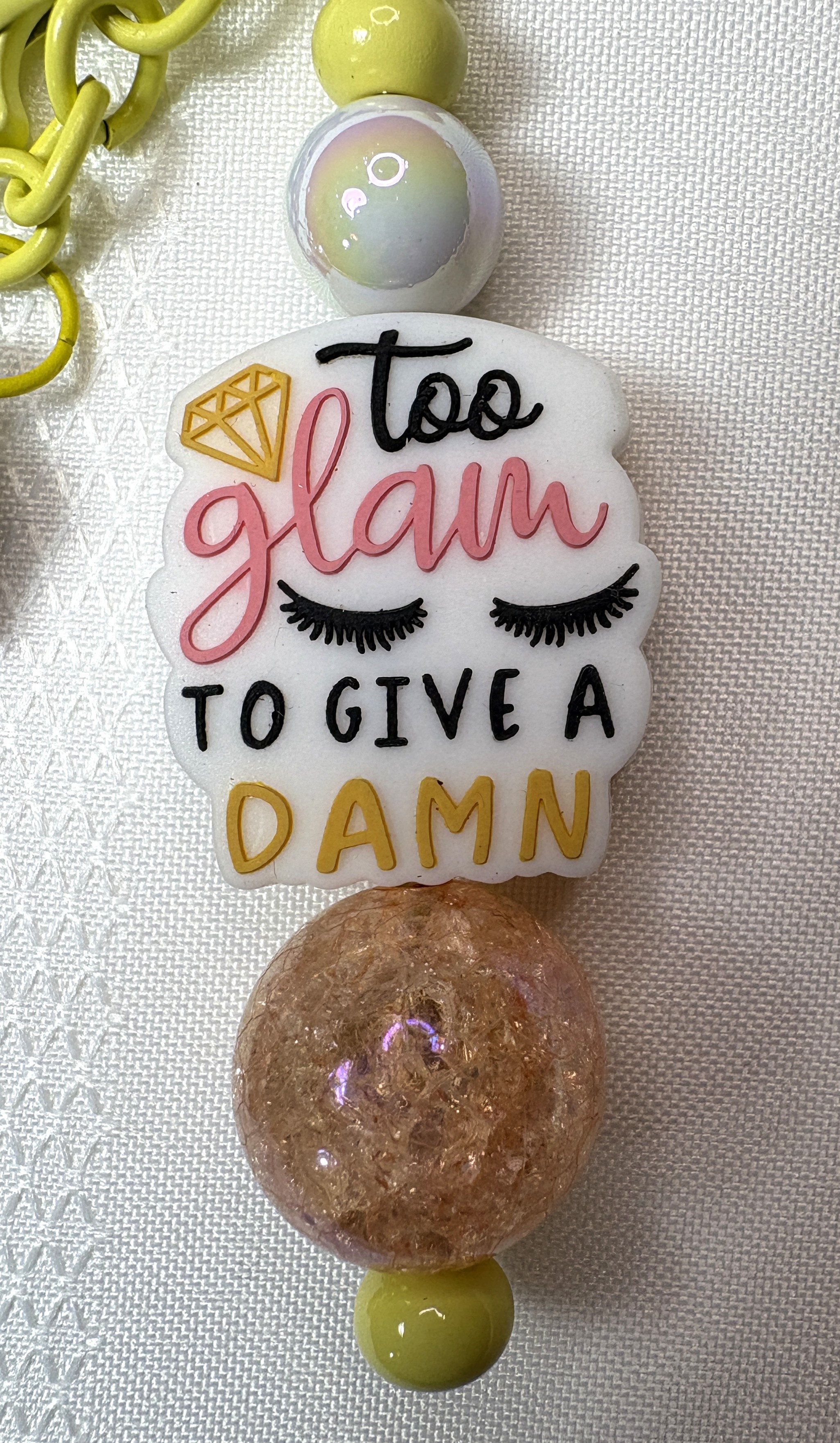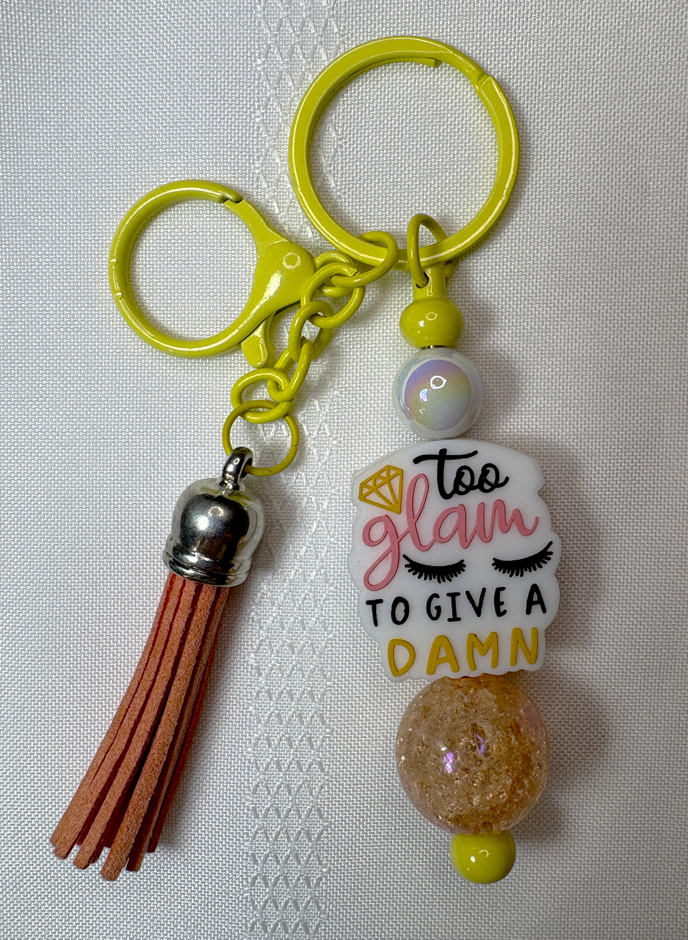 Introducing our Trendy 6-inch Yellow Keychain, featuring vibrant acrylic beads and a standout focal bead that boldly declares, "Too Glam To Give a Damn." This stylish accessory is completed with a charming matching peach tassel, making it the perfect addition to your bag or a fabulous gift for someone special!