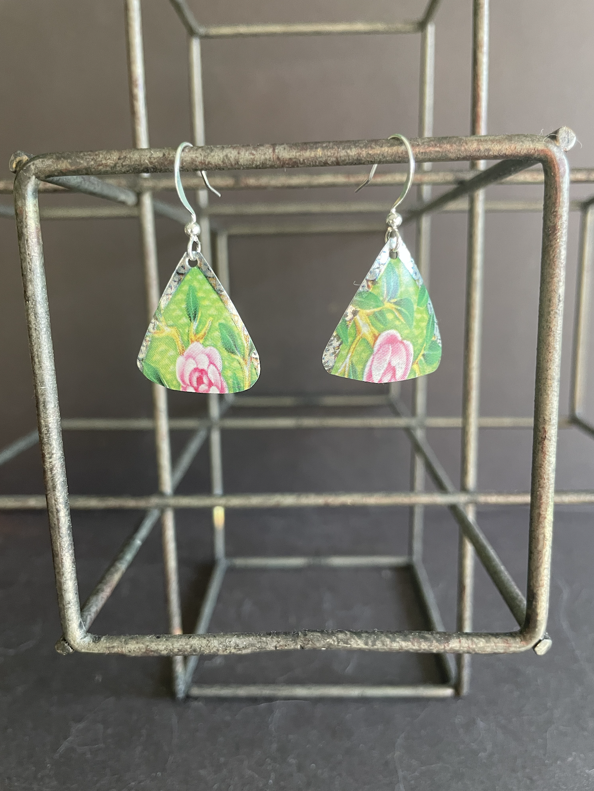 Tins are very light making them ideal for earrings as they don't weigh down your ears as the day goes on. Did you know the proper term for working with tin is "tinkering"? That made me really happy. I literally tinker in my art studio! I use old cookie tins, tea tins, and the like, break them down, and hand cut them into shapes and hand-hammer them into the 3-D shape I want them to be, finish and polish them, before putting them together like any other jewelry.