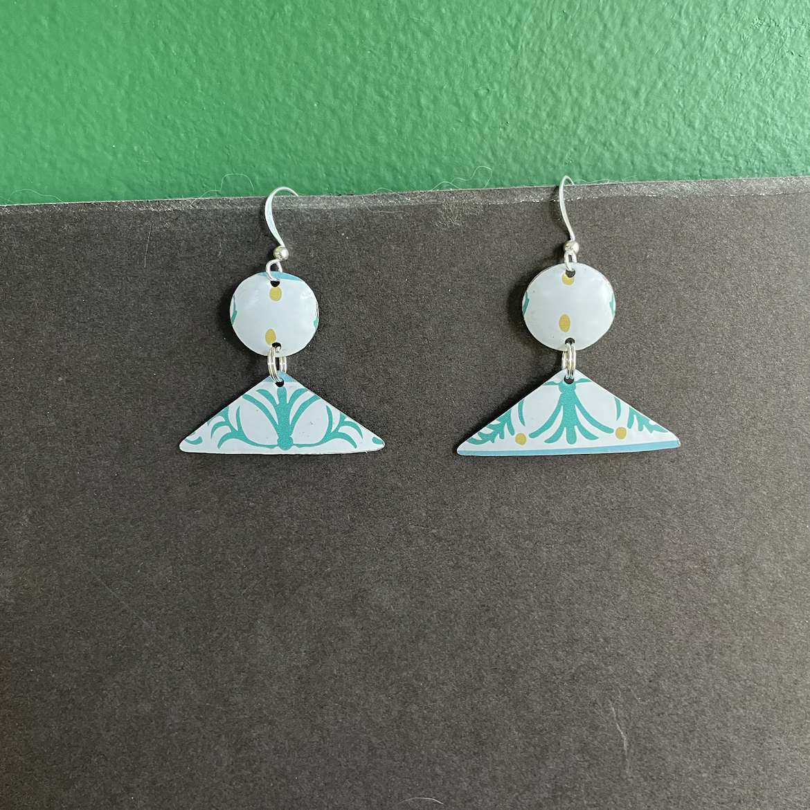 Triangular and teal designs for the eclectic in all of us. The earring findings are silver-plate and have no nickel. They come with a rubber stopper on the back so they won't fall out of your ears.