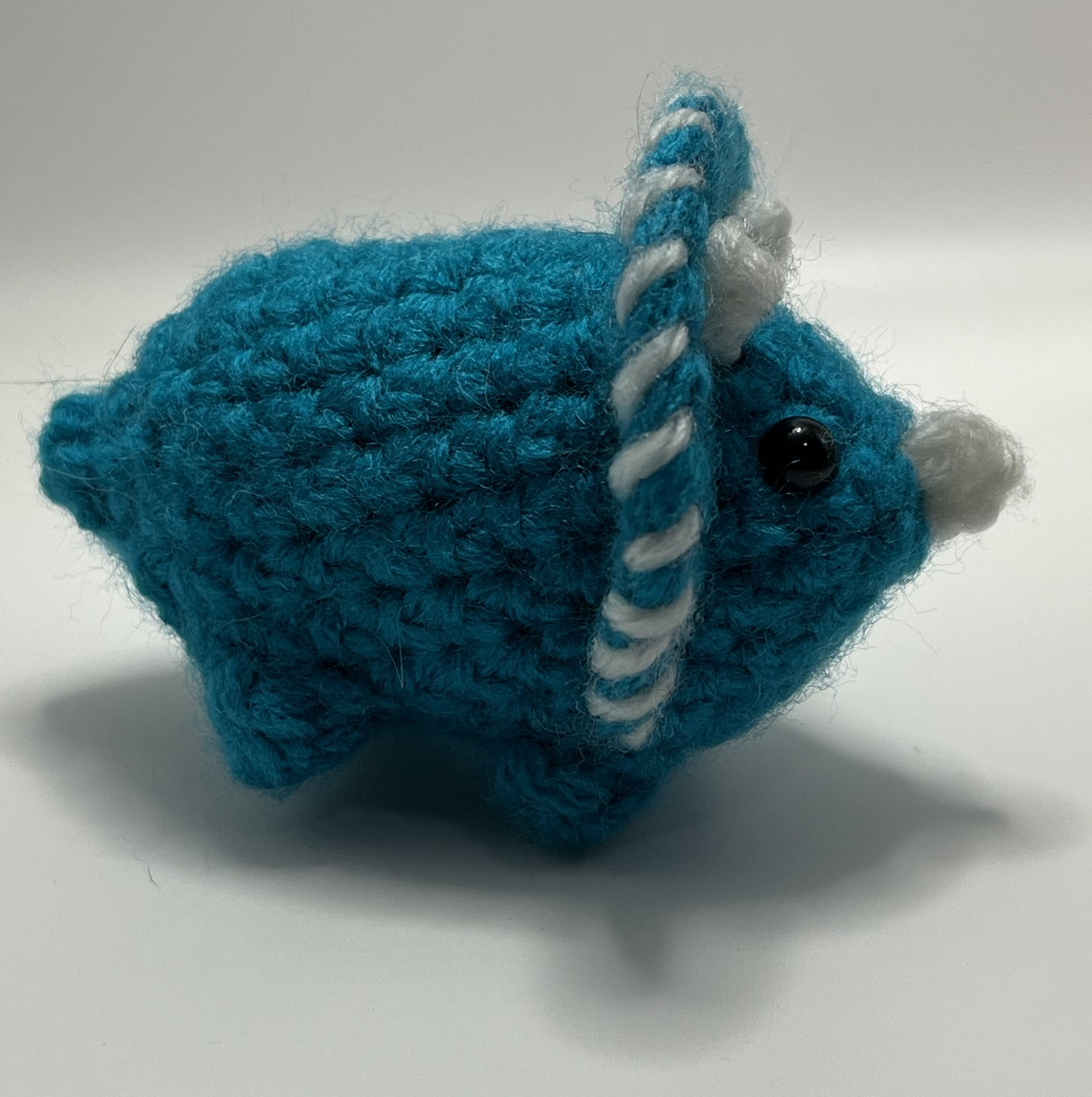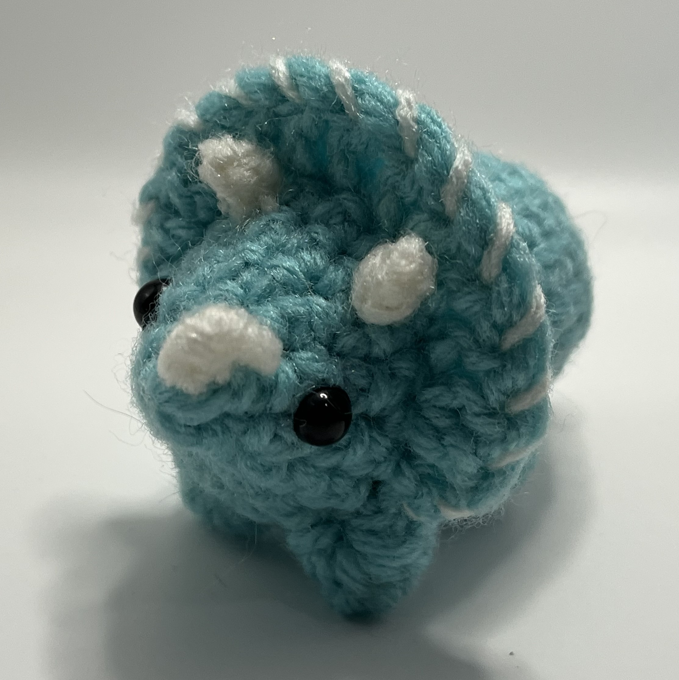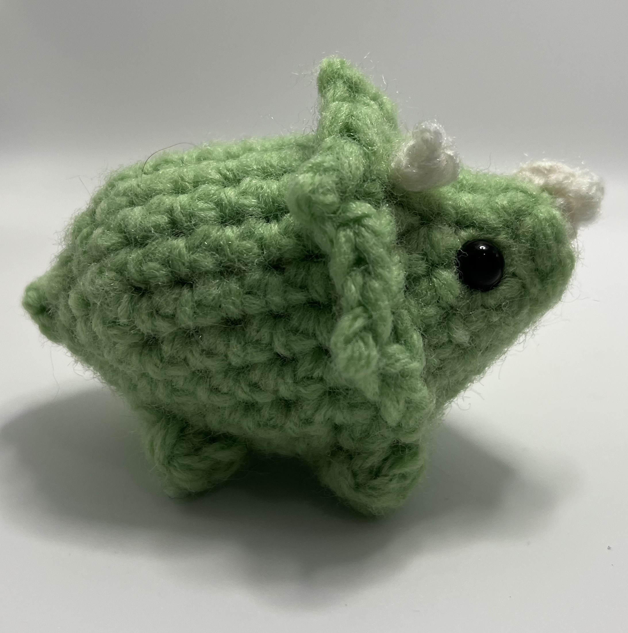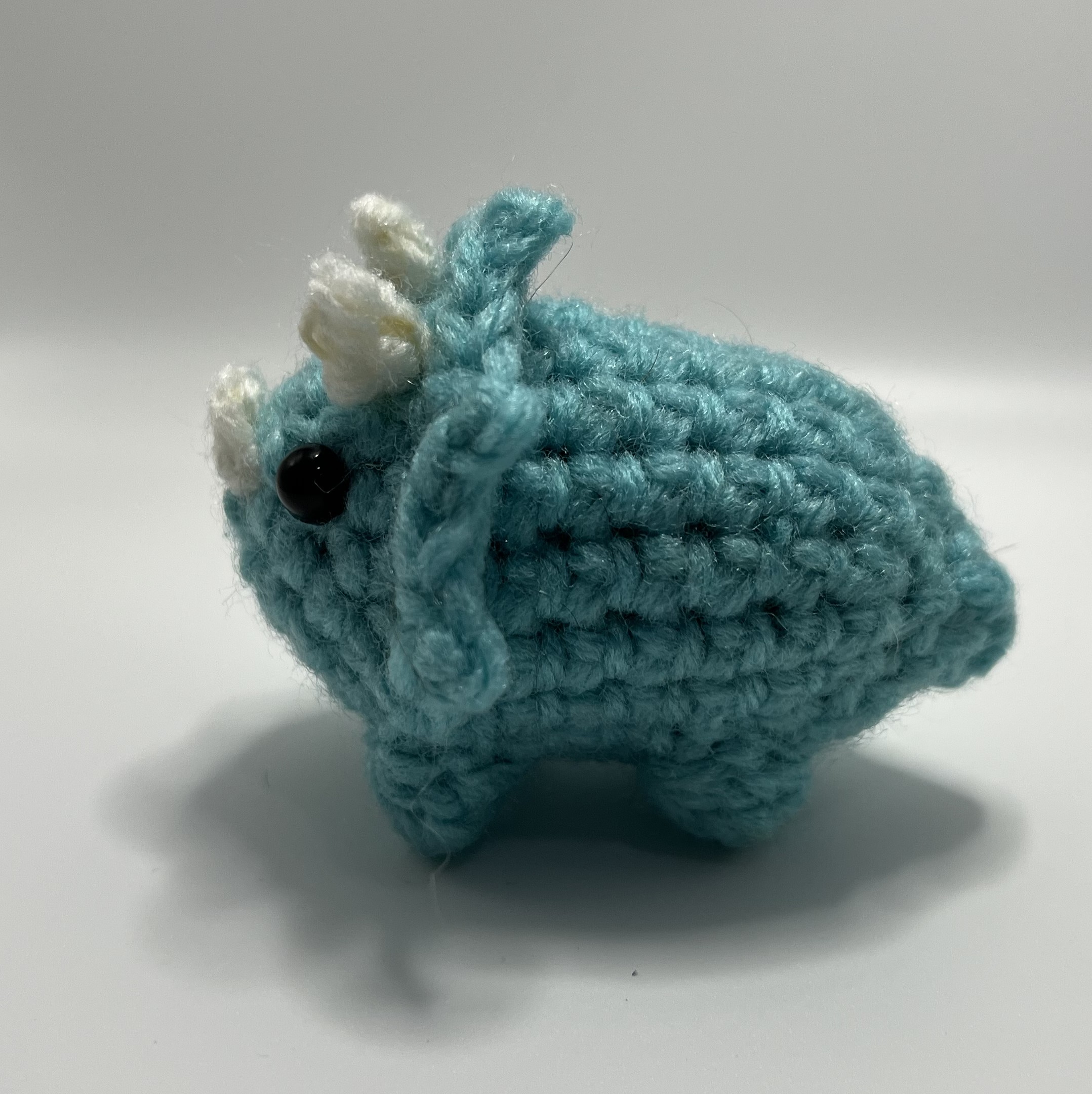 This little triceratops packs a punch of cuteness! Made of acrylic yarn with plastic safety eyes and stuffed to hold shape. It measures about 3.5 inches long, 2.5 inches wide, 2 inches tall. What you see pictured is immediately available but can be made to order in any color combination in about a week.