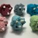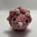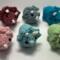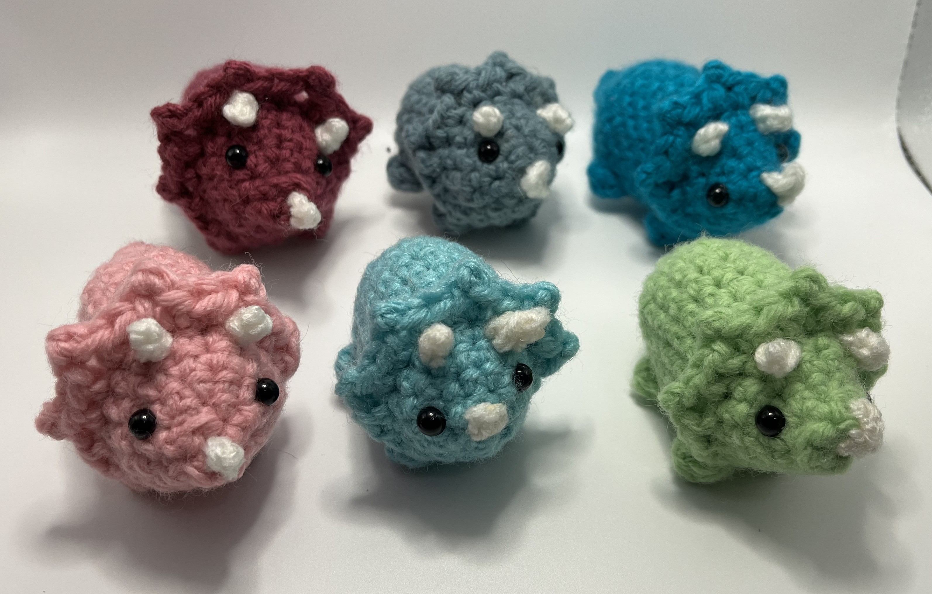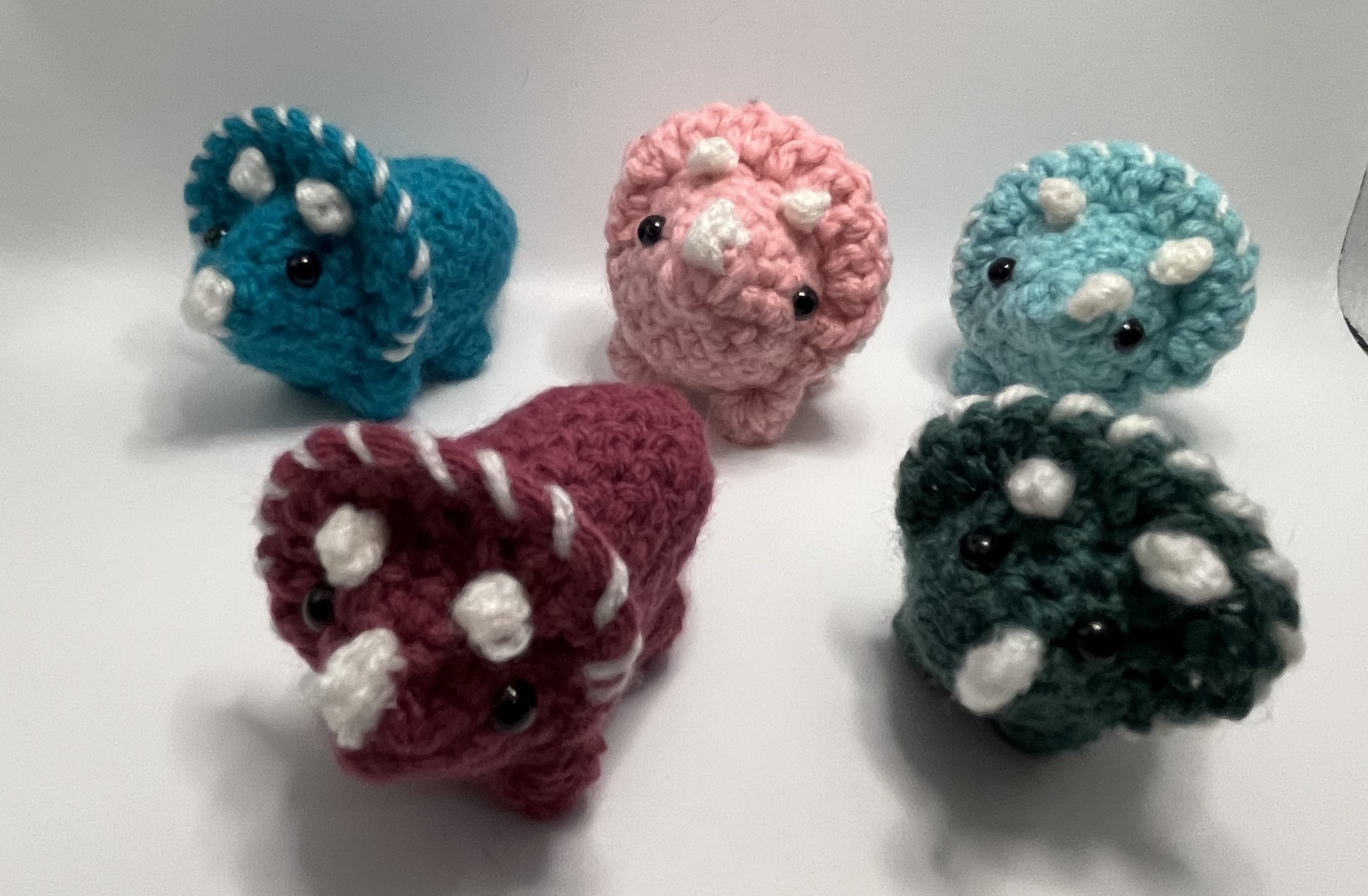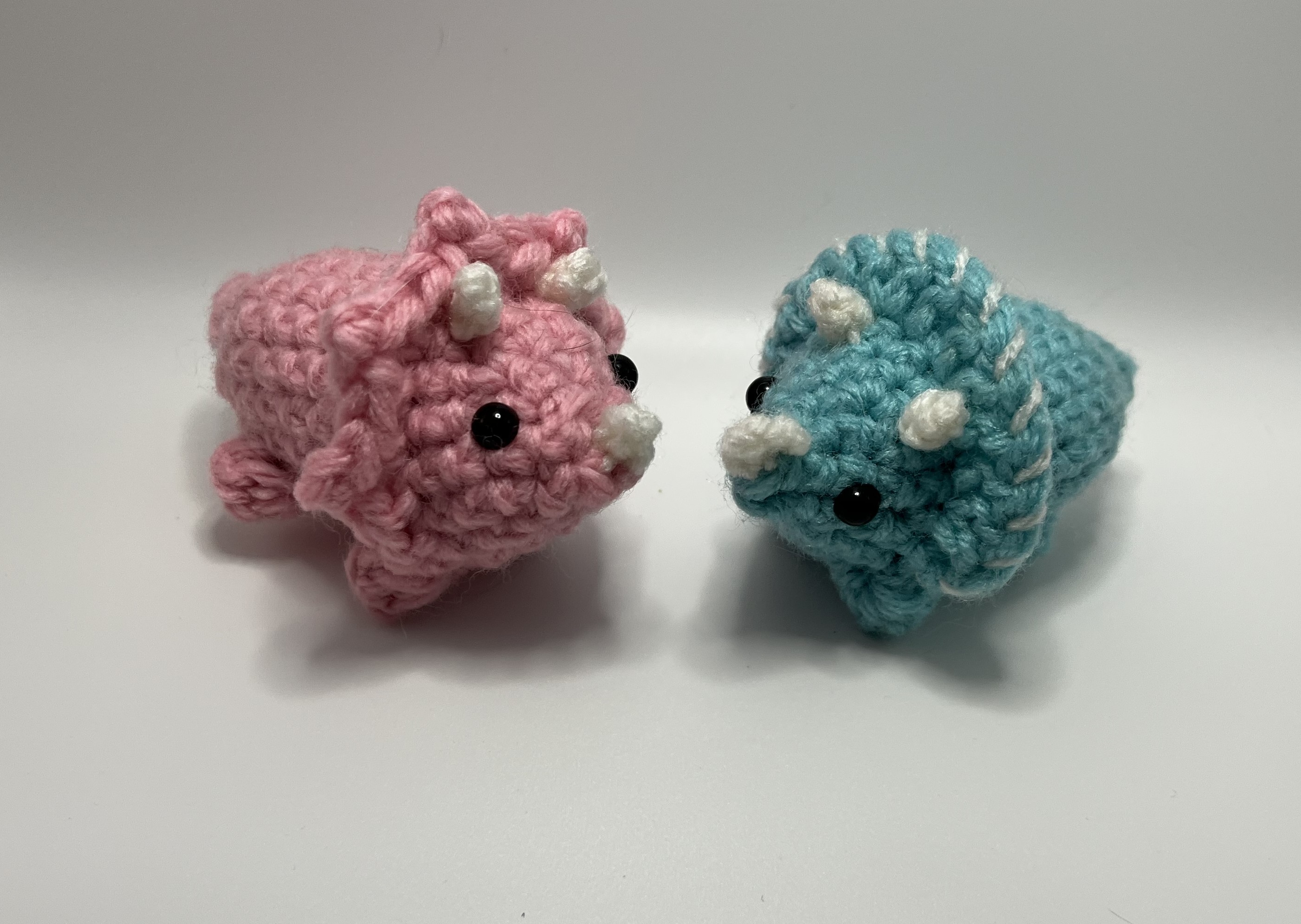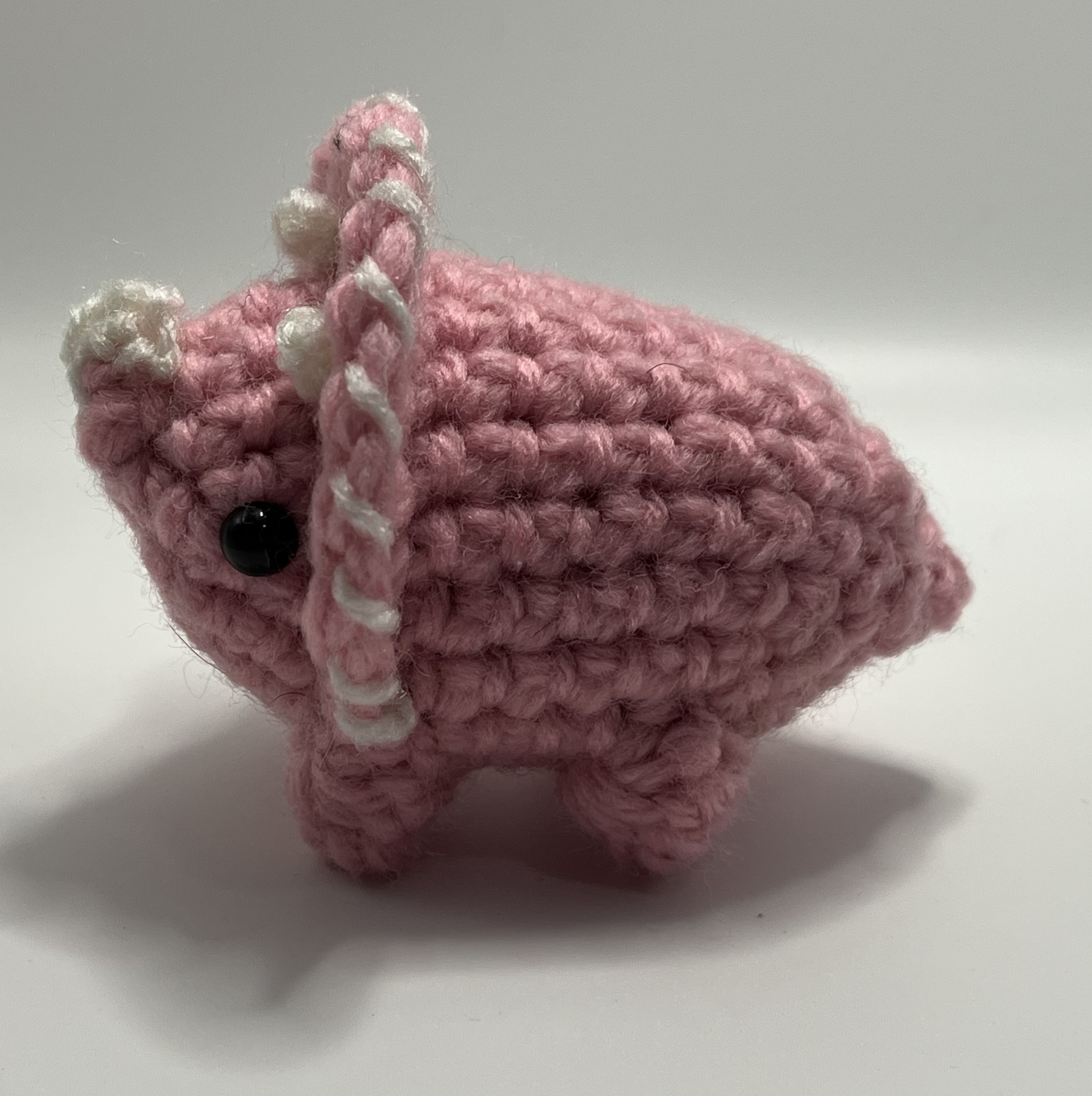 This little triceratops packs a punch of cuteness! Made of acrylic yarn with plastic safety eyes and stuffed to hold shape. It measures about 3.5 inches long, 2.5 inches wide, 2 inches tall. What you see pictured is immediately available but can be made to order in any color combination in about a week.