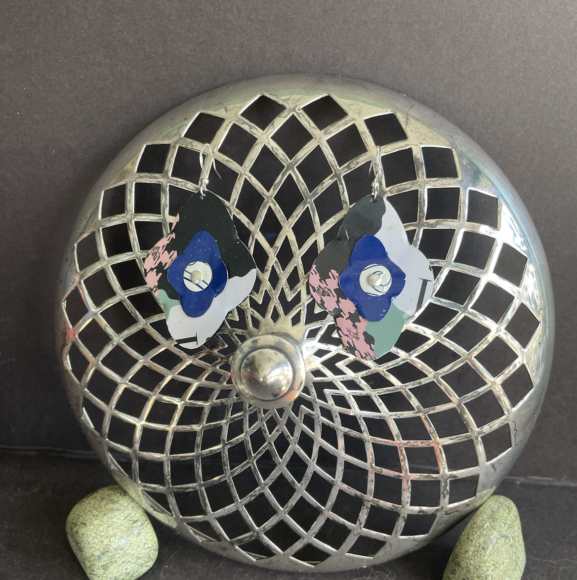 Tins are very light making them ideal for earrings as they don't weigh down your ears as the day goes on. Did you know the proper term for working with tin is "tinkering"? That made me really happy. I literally tinker in my art studio! I use old cookie tins, tea tins, and the like, break them down, and hand cut them into shapes and hand-hammer them into the 3-D shape I want them to be, finish and polish them, before putting them together like any other jewelry.