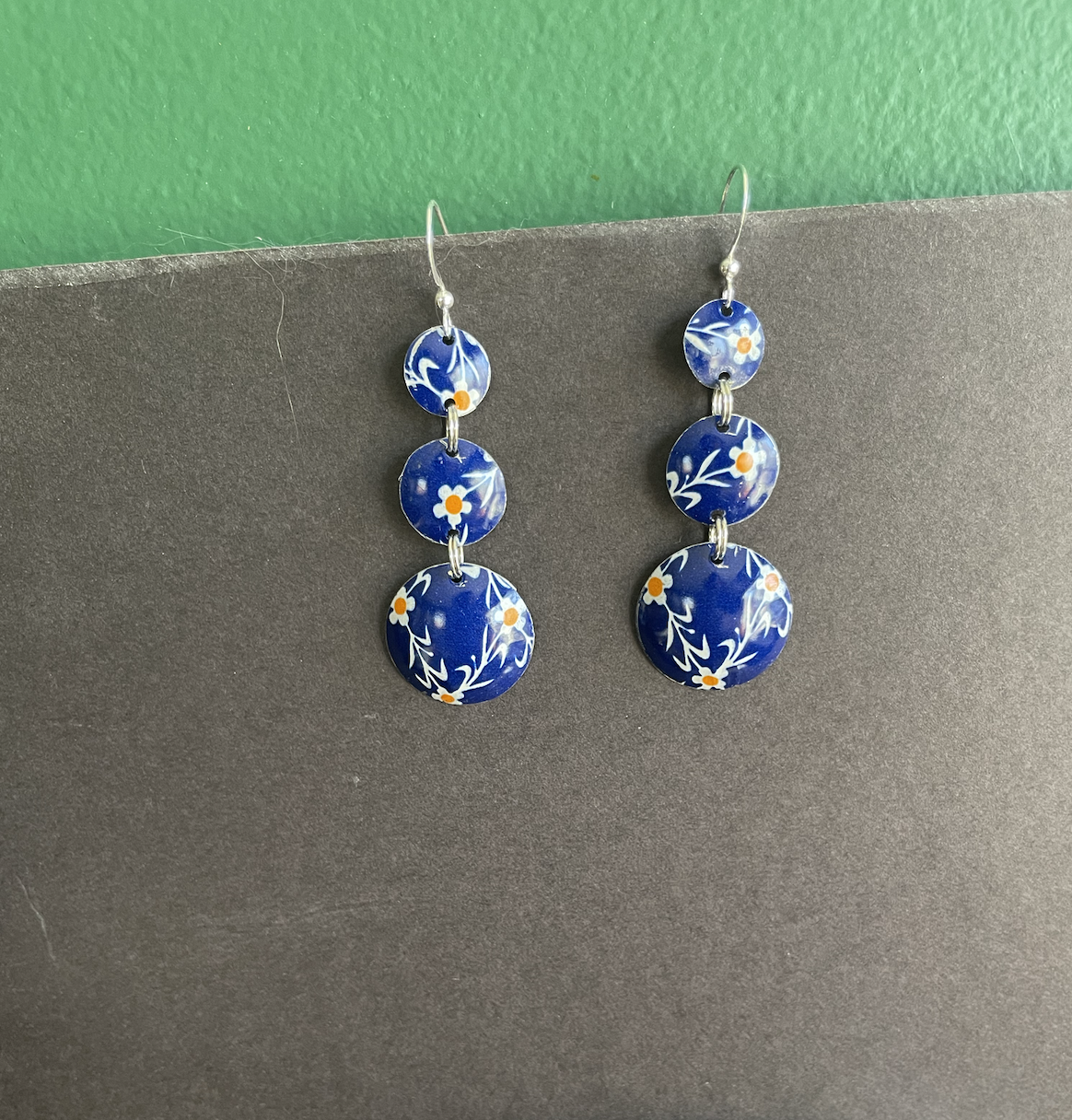 Tins are very light making them ideal for earrings as they don't weigh down your ears as the day goes on. Did you know the proper term for working with tin is "tinkering"? That made me really happy. I literally tinker in my art studio! I use old cookie tins, tea tins, and the like, break them down, and hand cut them into shapes and hand-hammer them into the 3-D shape I want them to be, finish and polish them, before putting them together like any other jewelry.
