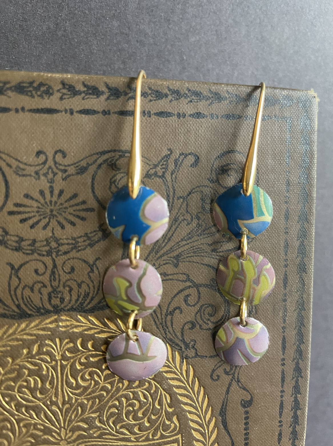 Tins are very light making them ideal for earrings as they don't weigh down your ears as the day goes on. Did you know the proper term for working with tin is "tinkering"? That made me really happy. I literally tinker in my art studio! I use old cookie tins, tea tins, and the like, break them down, and hand cut them into shapes and hand-hammer them into the 3-D shape I want them to be, finish and polish them, before putting them together like any other jewelry.