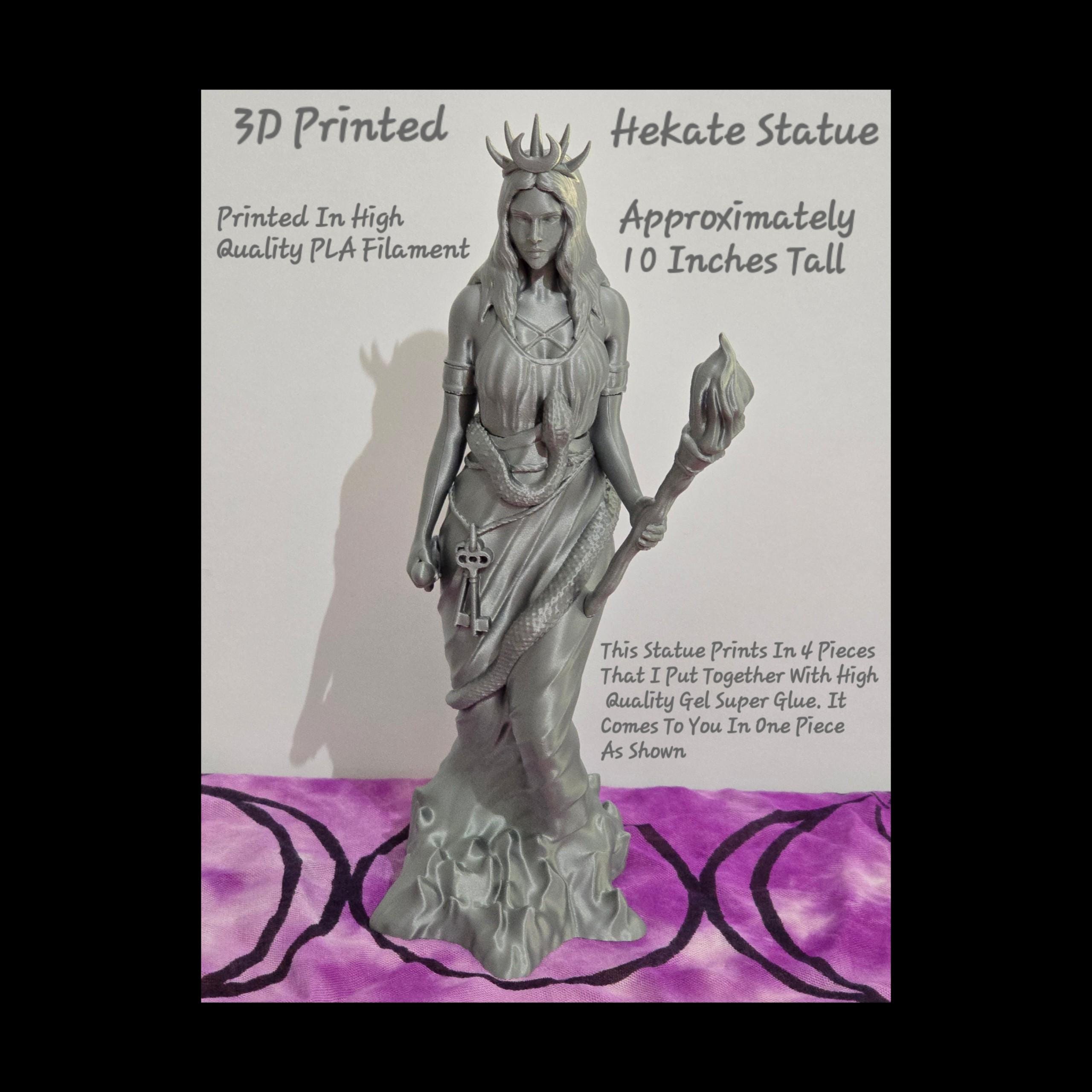 This listing is for One 3D Printed Triple Goddess Hekate/Hecate Statue in the color Silver. The Statues are not painted, they are Printed in High Quality PLA so you don't have to worry about paint chipping, peeling, or rubbing off! This Statue Prints In 4 separate Pieces That I Put Together With High Quality Gel Super Glue. The Statue comes to you in One Piece As Shown in the photos! Please note that colors may differ slightly from how it appears on your screen due to varying monitor/Phone settings. The Statue is approximately 10 Inches Tall. If you hold the Statue close to your face you can see VERY MINIMAL lines produced by the 3D Printer. At a normal distance they aren't noticeable. The lines are minimal in appearance because I have a high end 3D Printer! These Statues are perfect for Your Alter, as an offering to Hekate/Hecate, and also make great gifts!