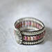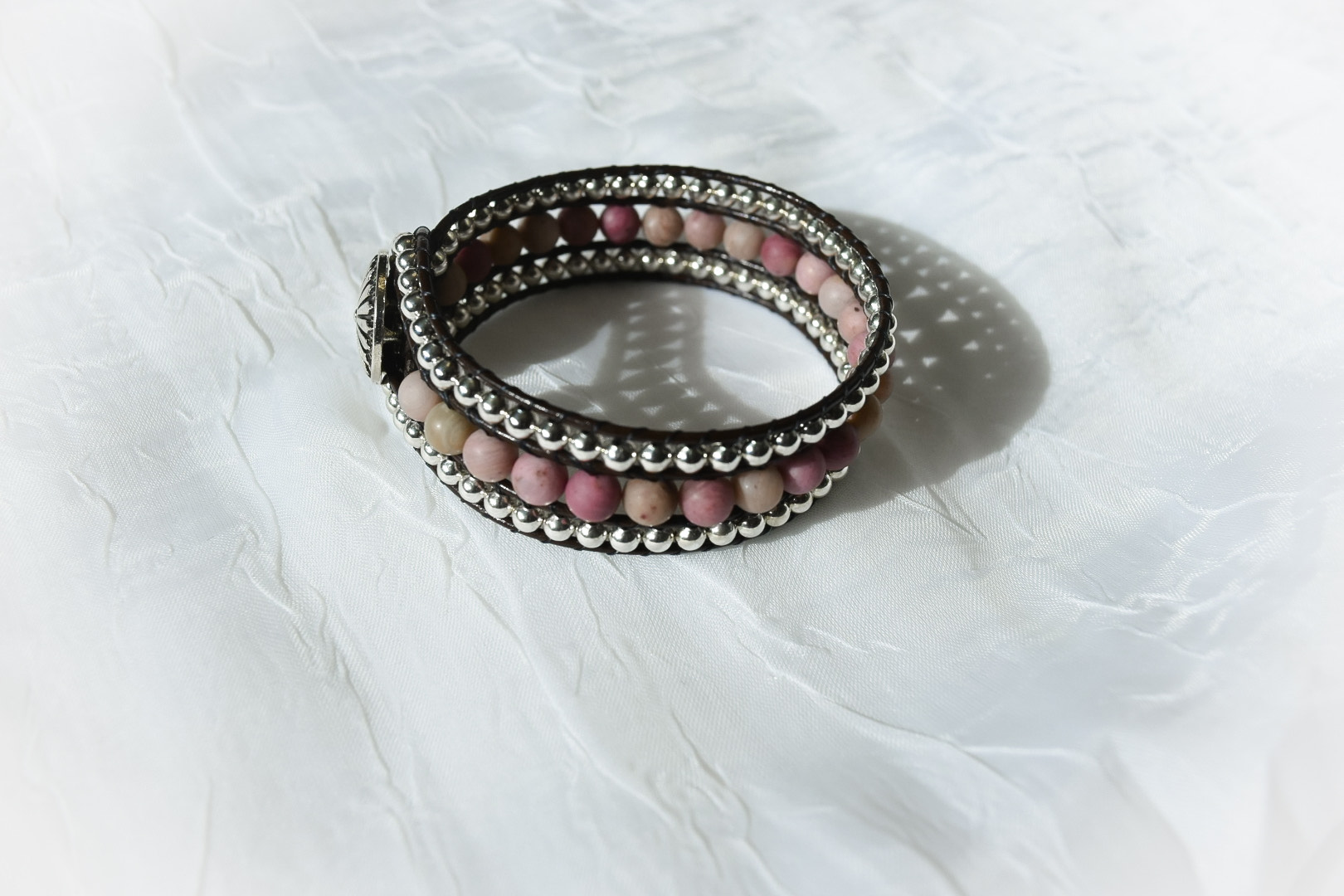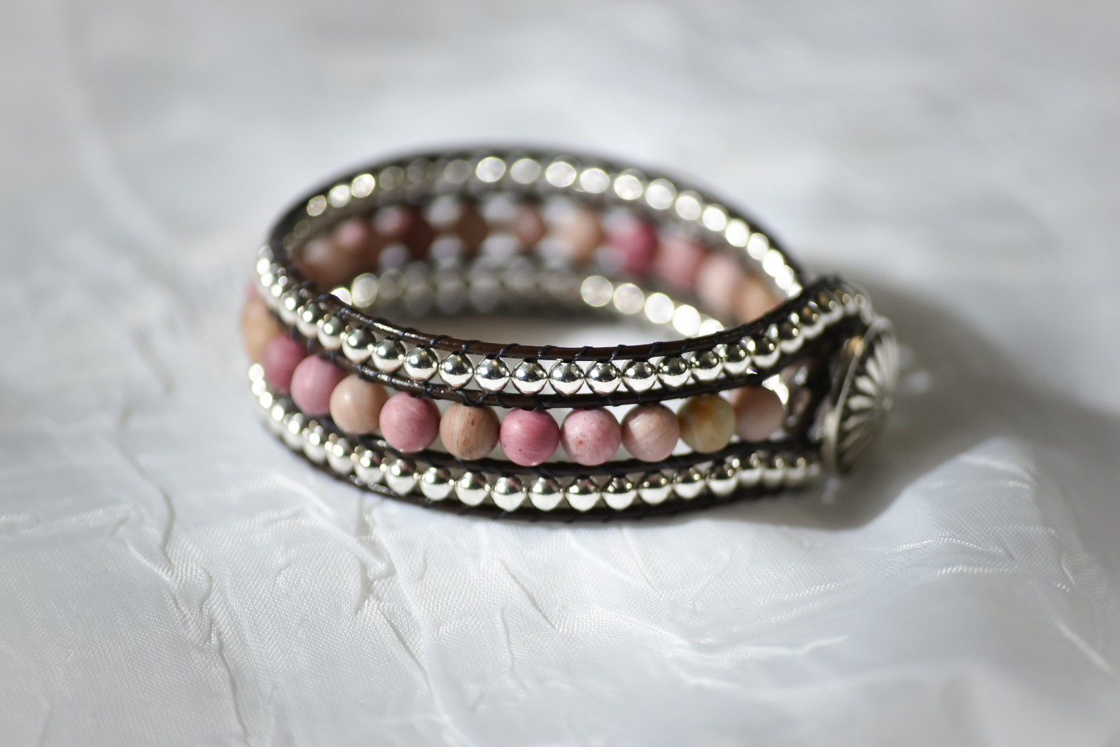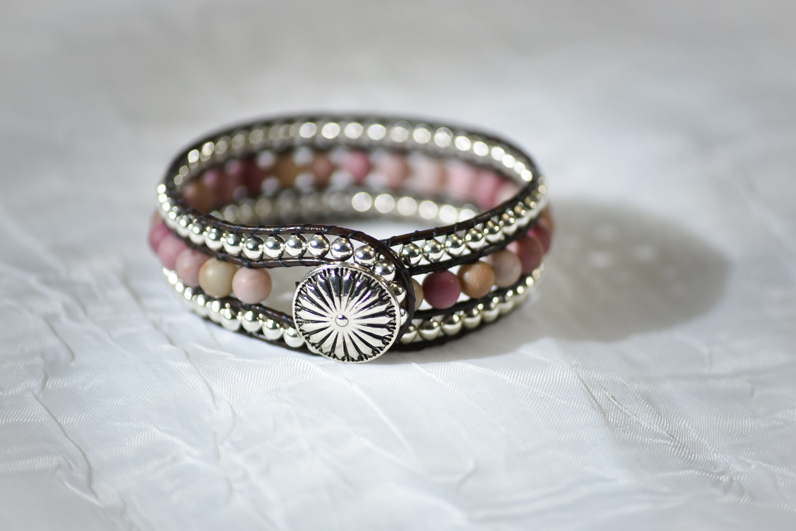 Triple leather cuff bracelet with matte wood rhodonite, silver tone beads and silver tone button closure