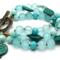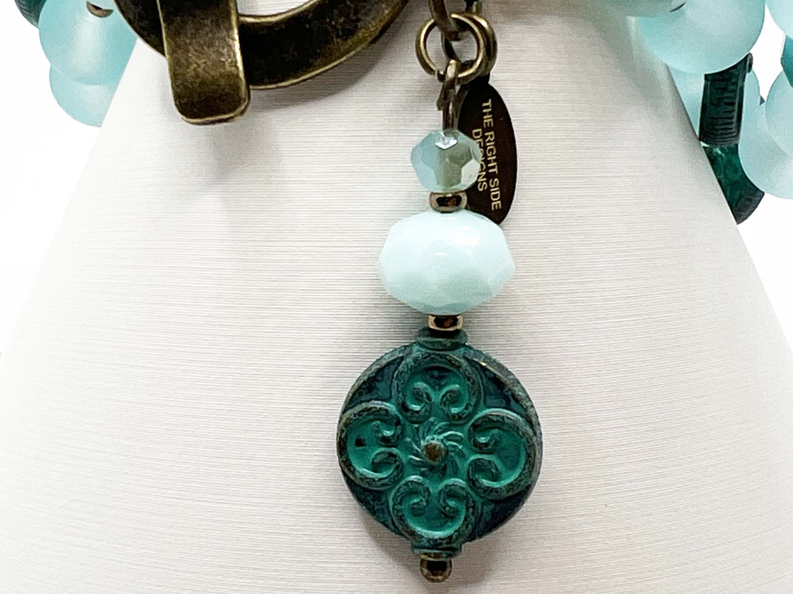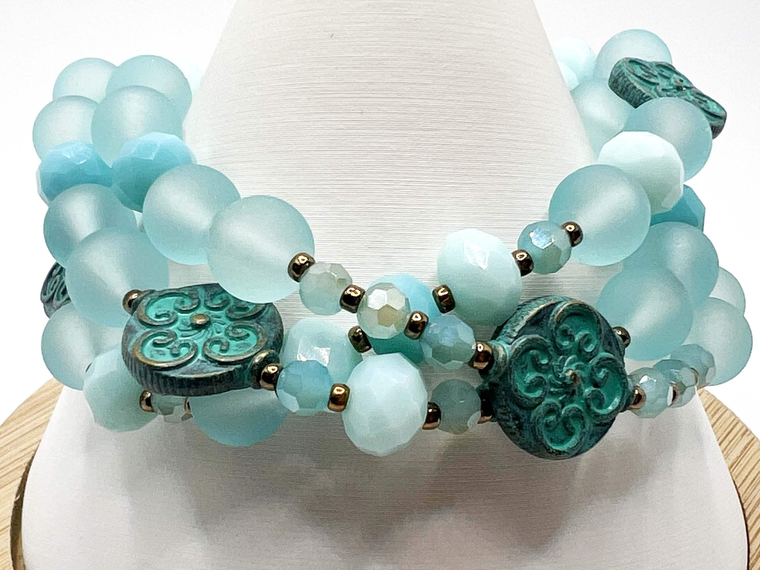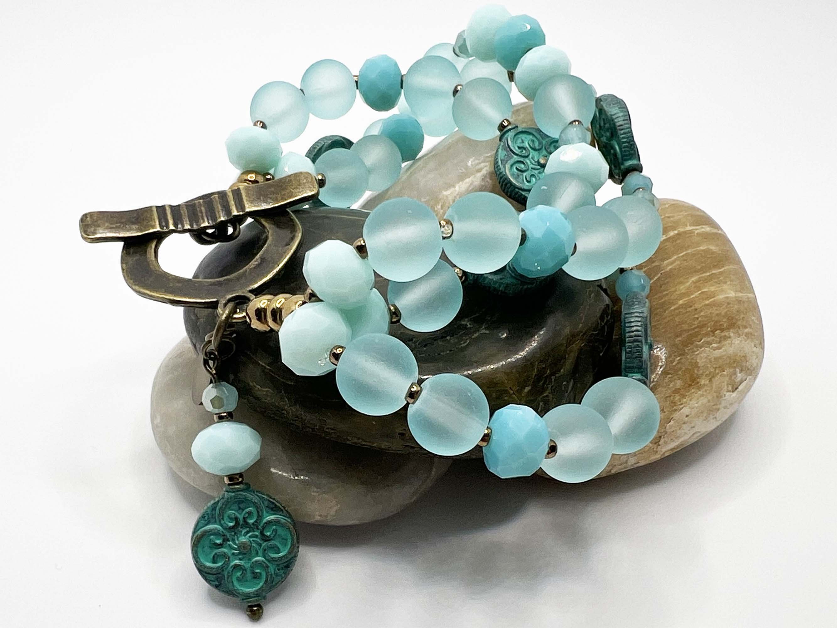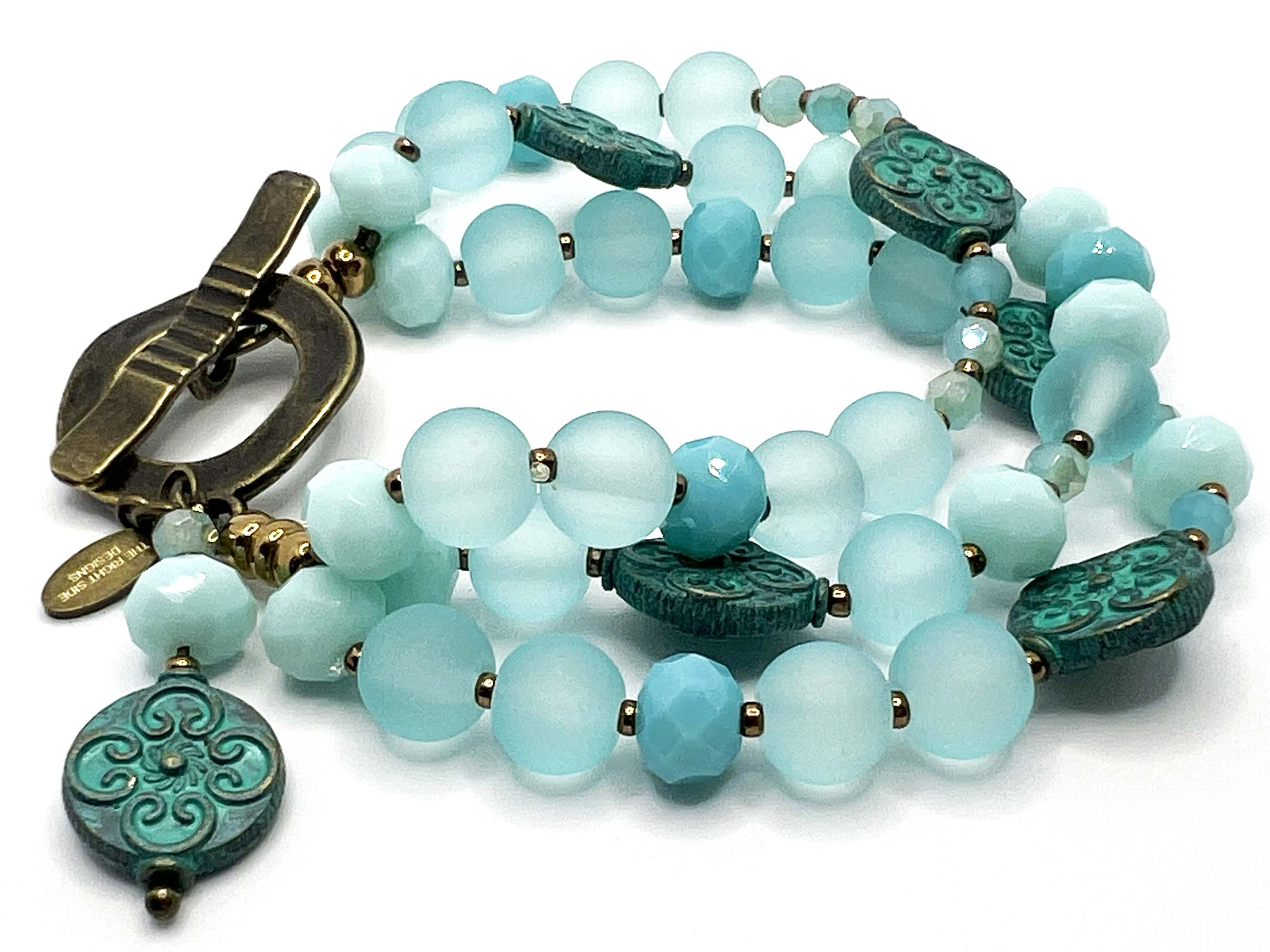 Elegant and soothing, this handcrafted three-strand bracelet showcases beautiful aqua tones complemented by warm bronze accents.
