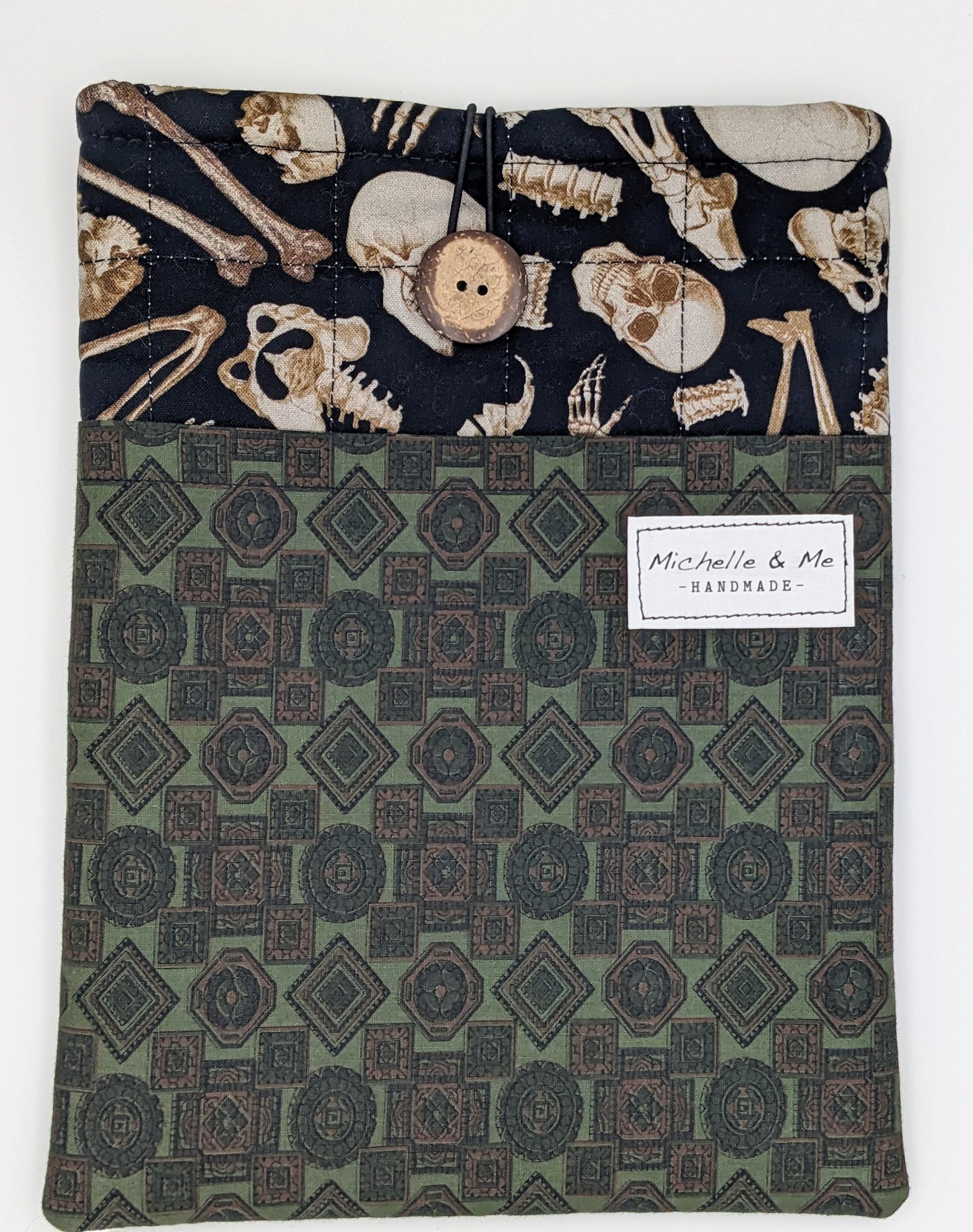 Perfect gift for the true crime reader among you. Anatomical human skeleton cotton fabric on front and back with dark green old-house-looking-wallpaper cotton fabric for the pocket. The lining is of a black and tan check cotton. Elastic and coconut shell button closure.
