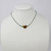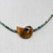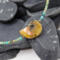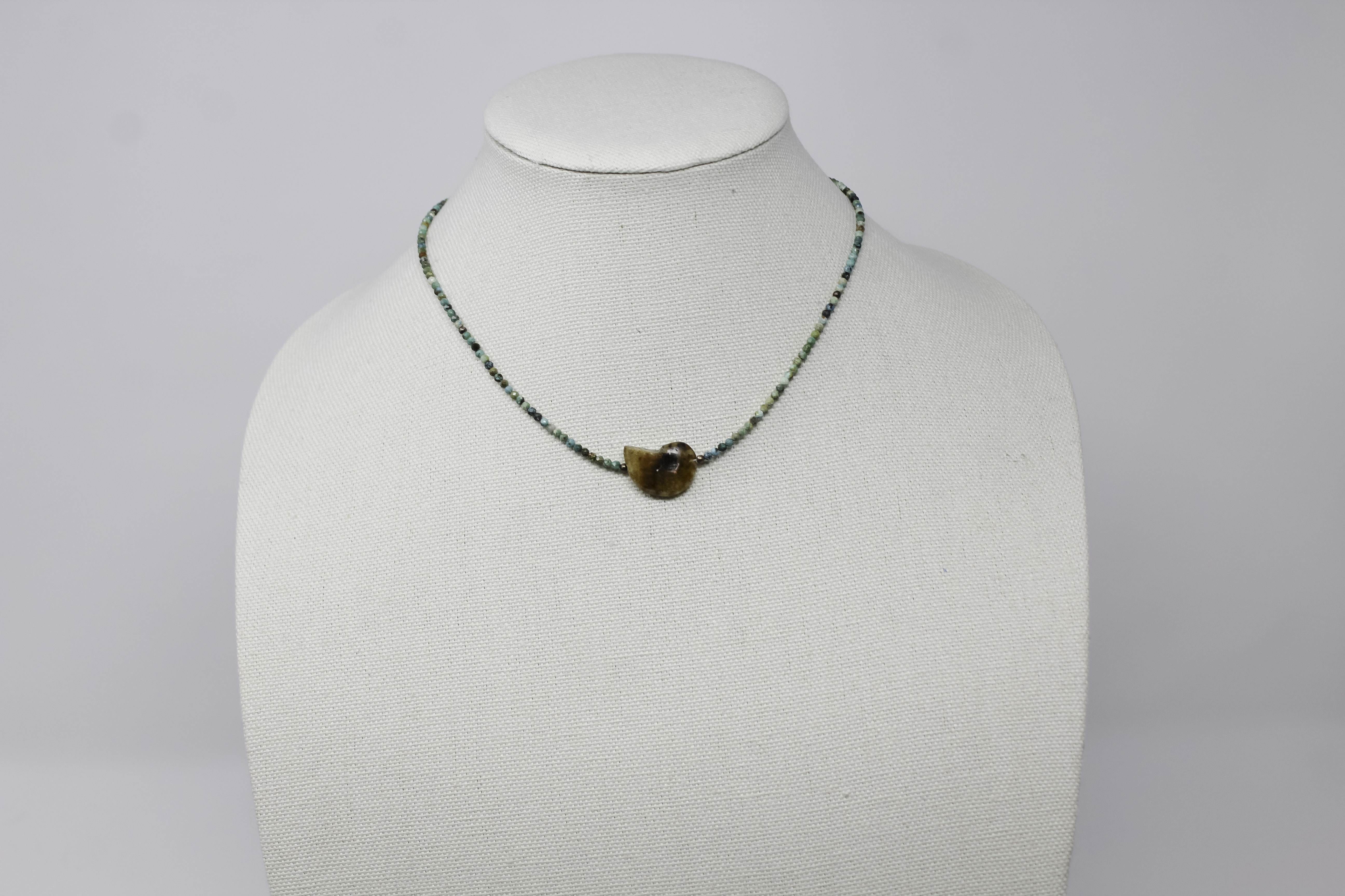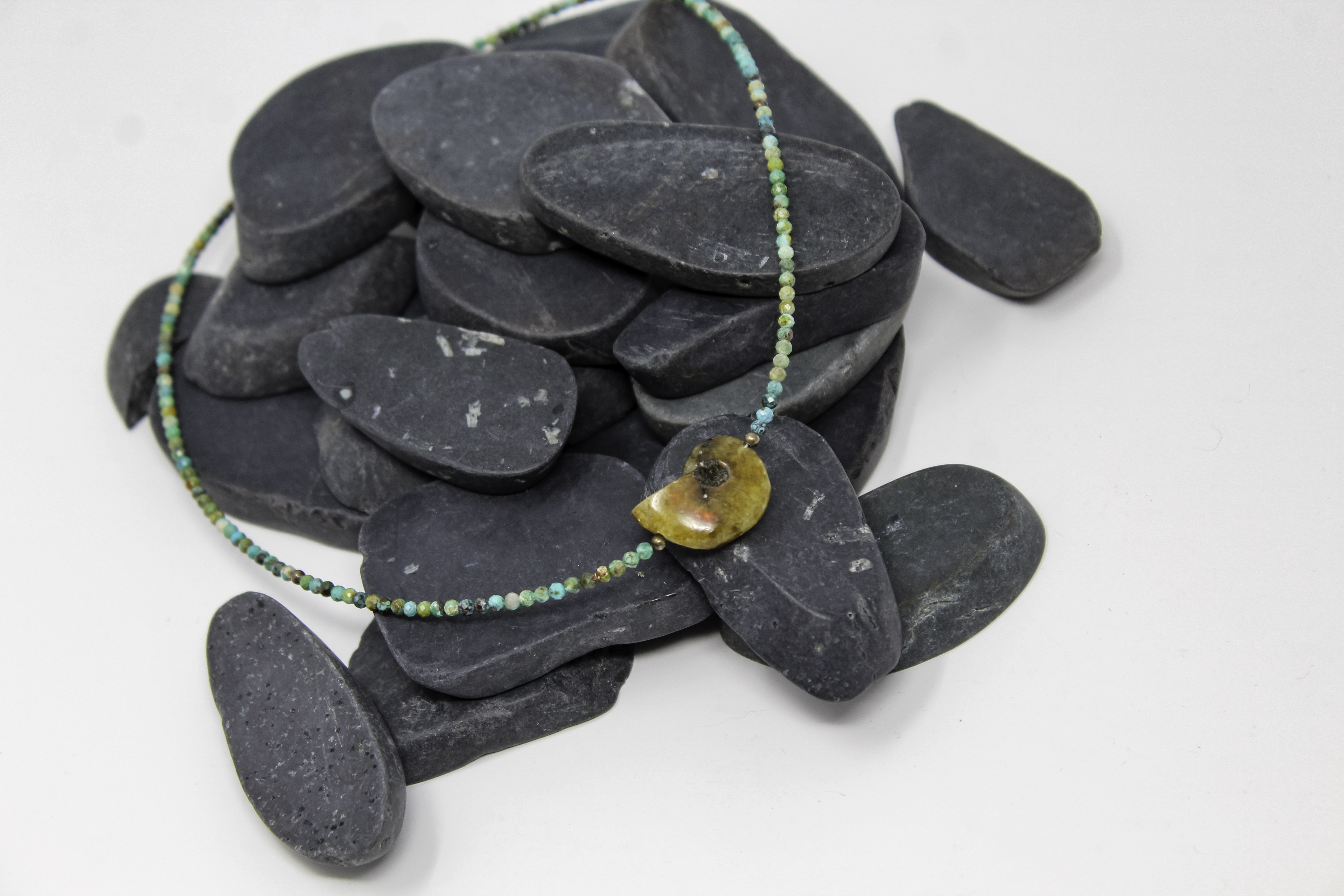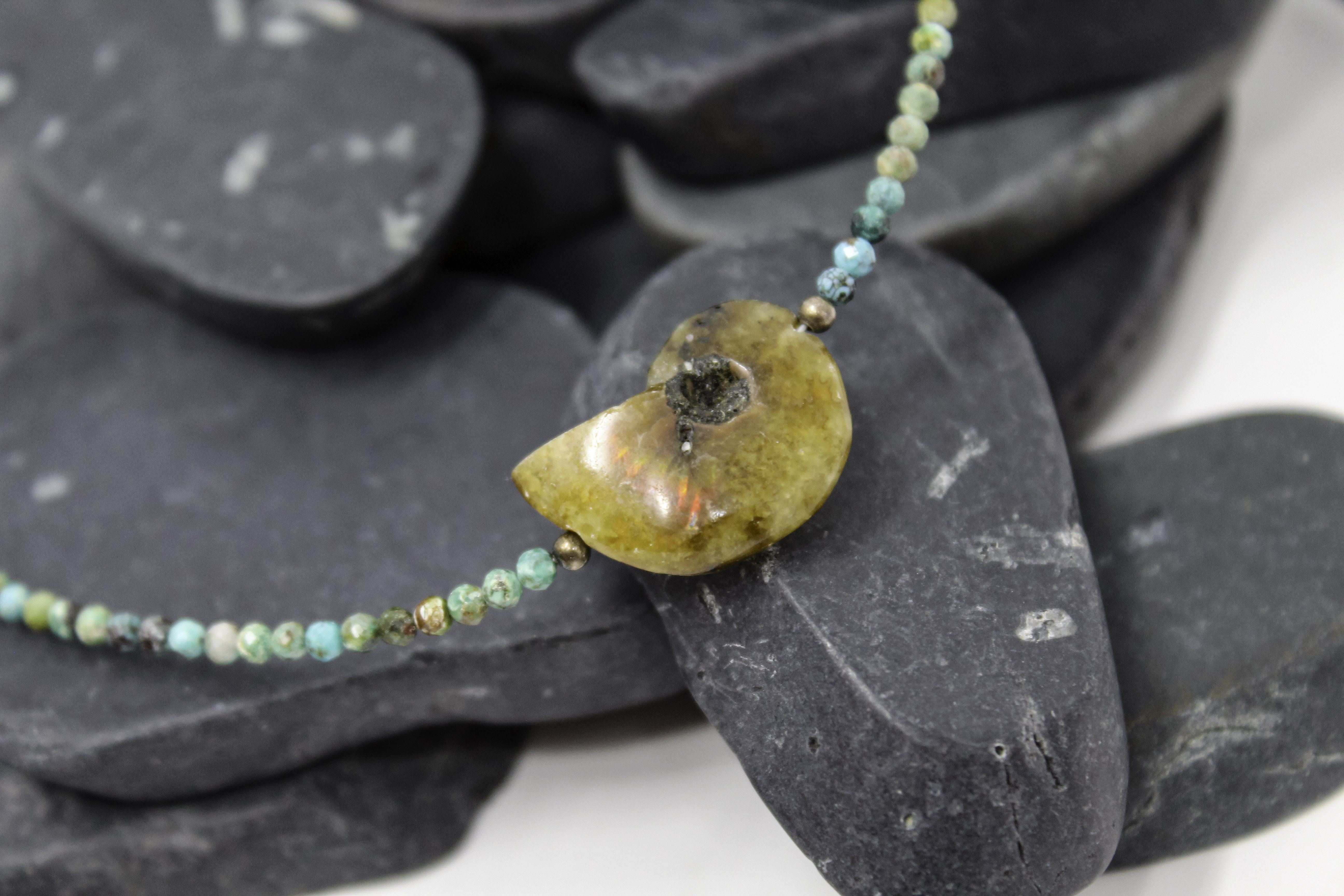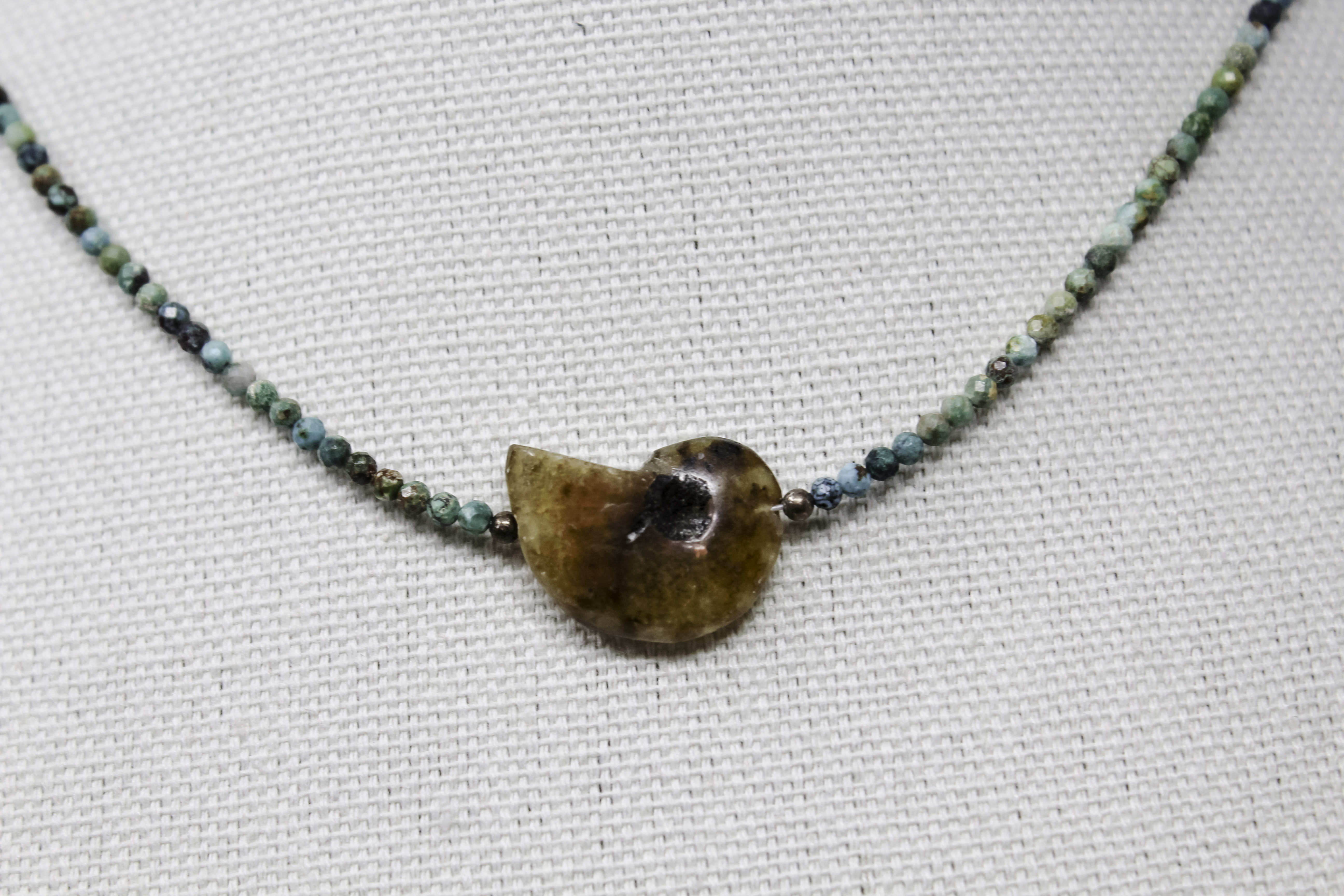 This necklace gives off little mermaid vibes. Micro-faceted turquoise beads feature a fossilized ammonite shell. Necklace measures 17 inches in length.