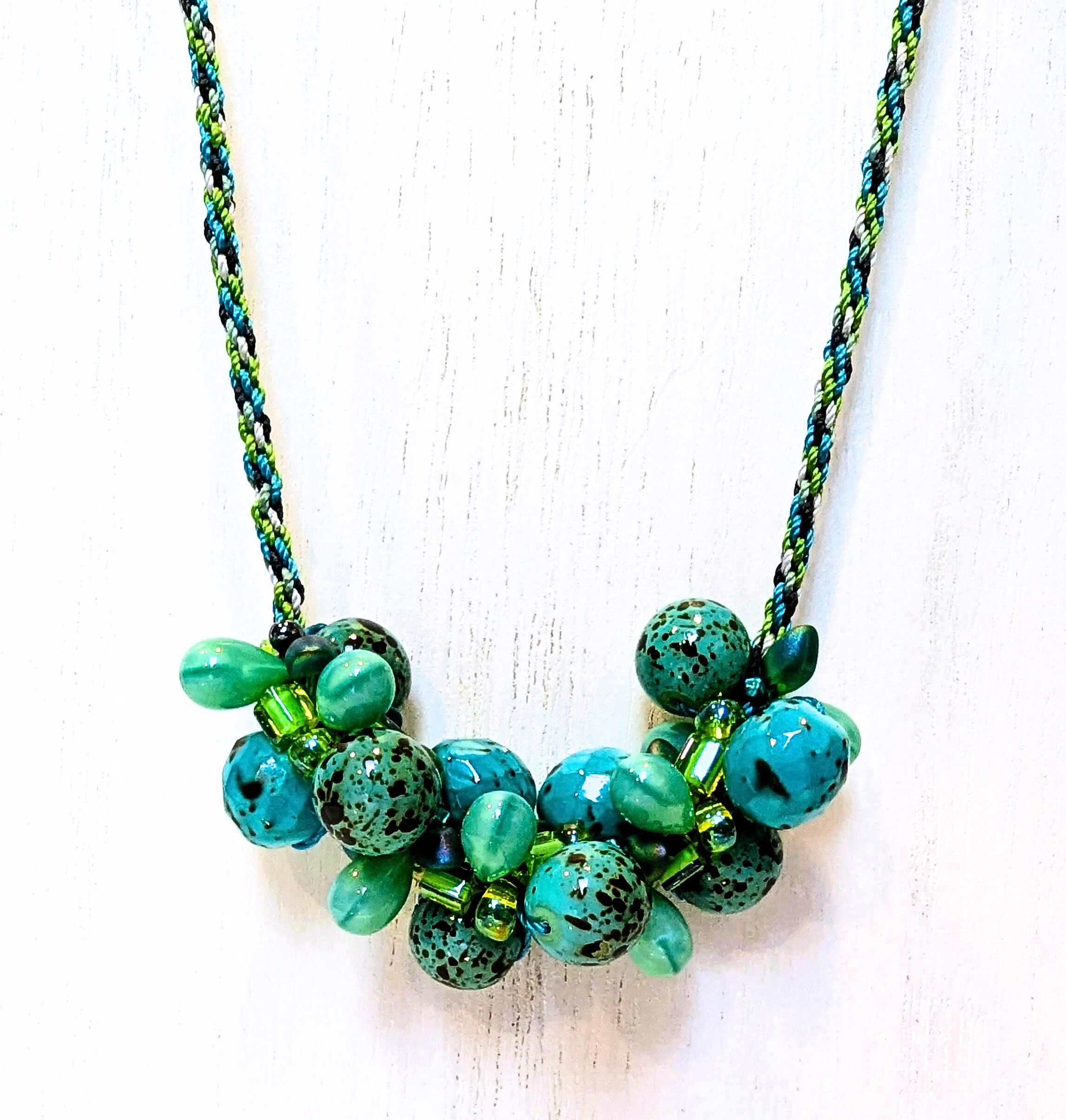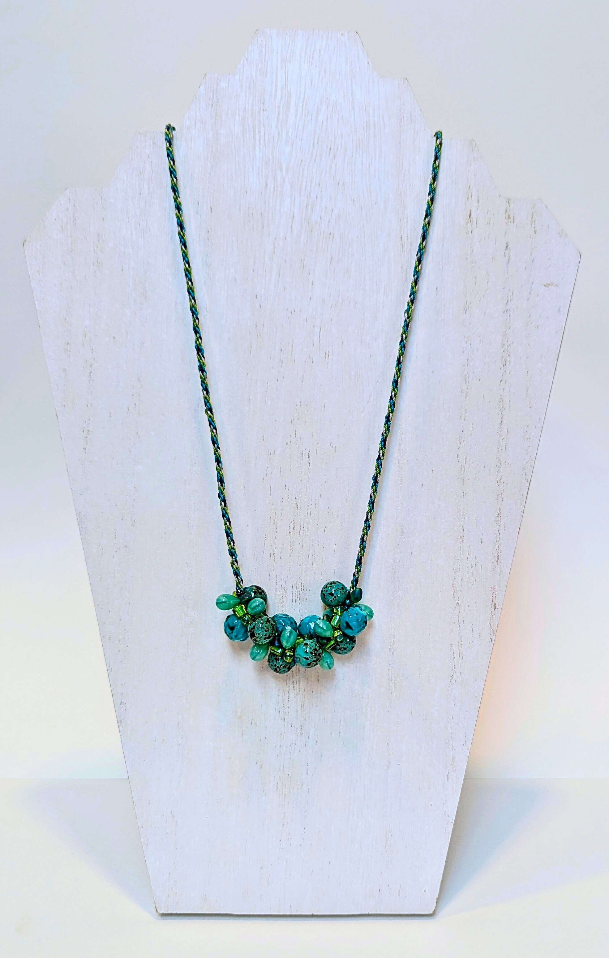 This one-of-a-kind Kumihimo braided necklace weaves together color, texture, and craftsmanship in perfect harmony. At the center, a beaded focal section combines round and faceted ceramic beads, shimmering teardrops, sleek squares, and tiny seed beads in rich shades of turquoise, green, and black—like a mosaic of ocean and forest hues. The braid flows into a hand-wrapped copper clasp, adding a warm, artisanal touch. Measuring approximately 24", this piece makes a statement without weighing you down—substantial in style, yet light and comfortable for all-day wear.