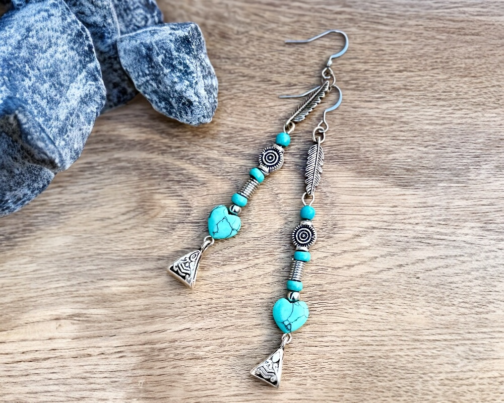 These handmade one-of-a-kind long earrings are lightweight and easy to wear. They dangle 3 inches from the silver-plated earring wire. The wire is nickel free and lead free.