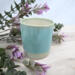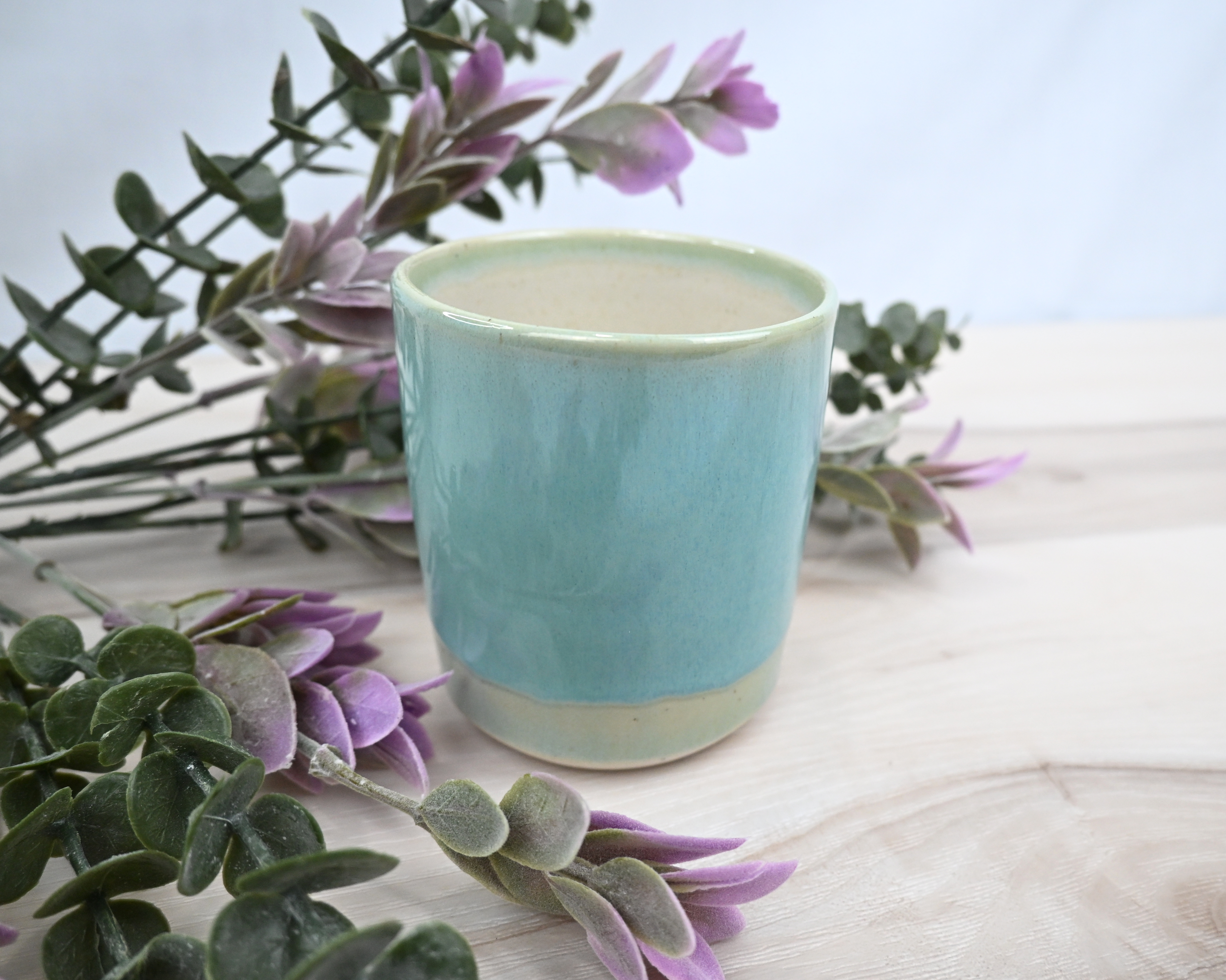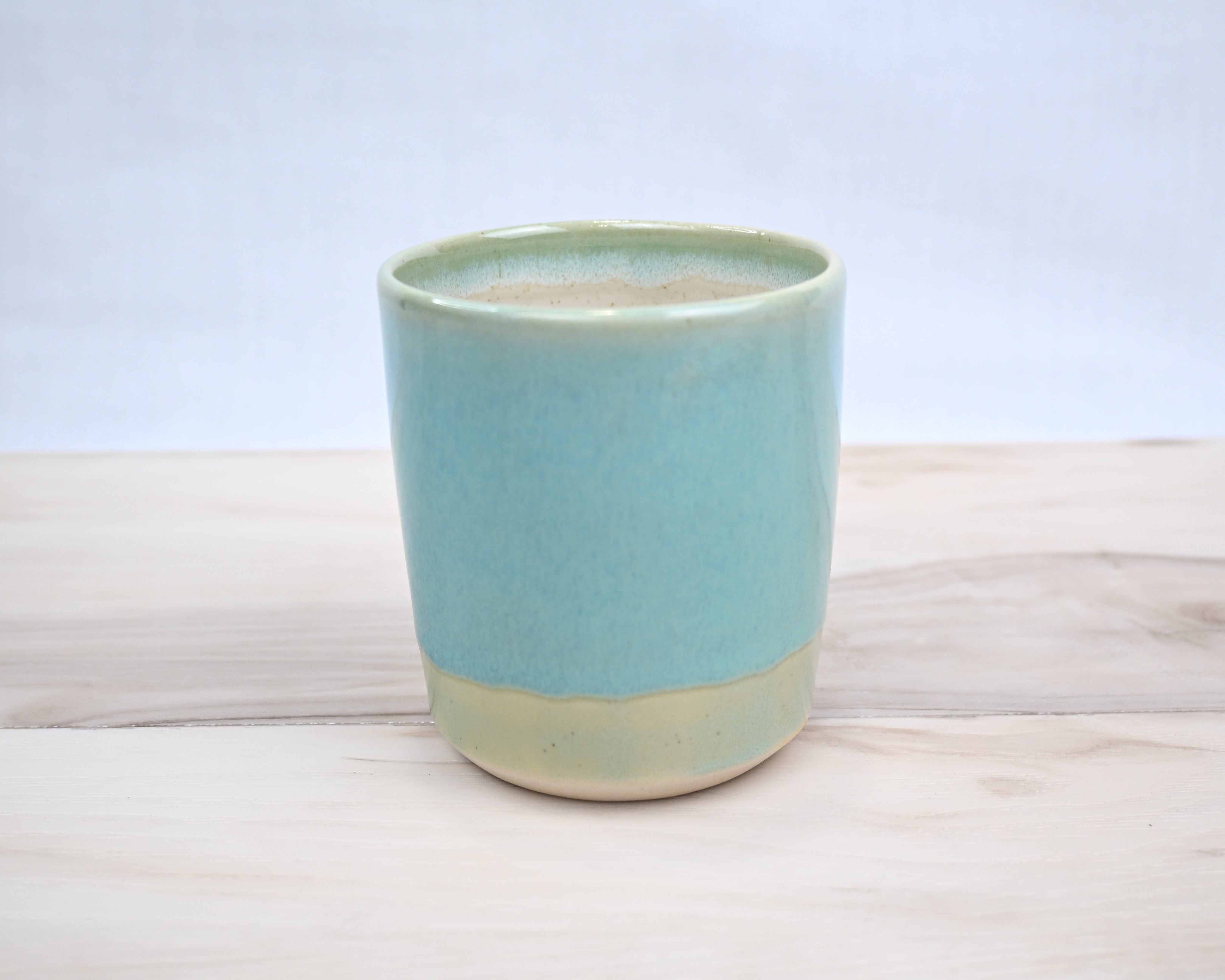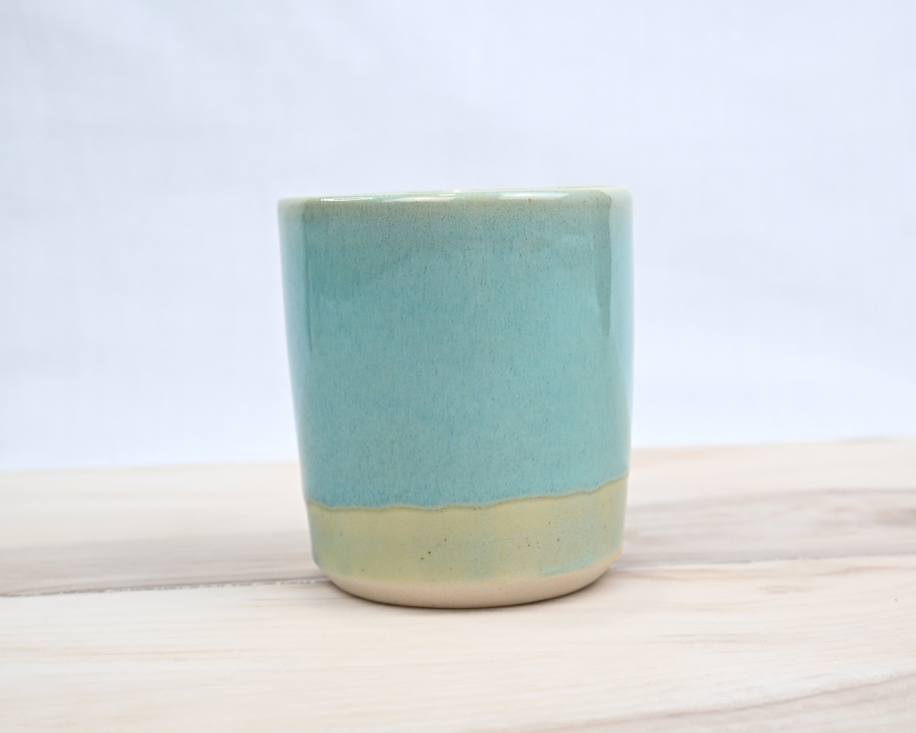 This versatile piece features a smooth coat of tranquil turquoise over soft cream, creating a fresh, calming look. Its simple form makes it perfect as a small cup, a trinket dish, or a decorative accent on any shelf or table. Not recommended for hot beverages.
