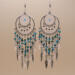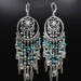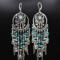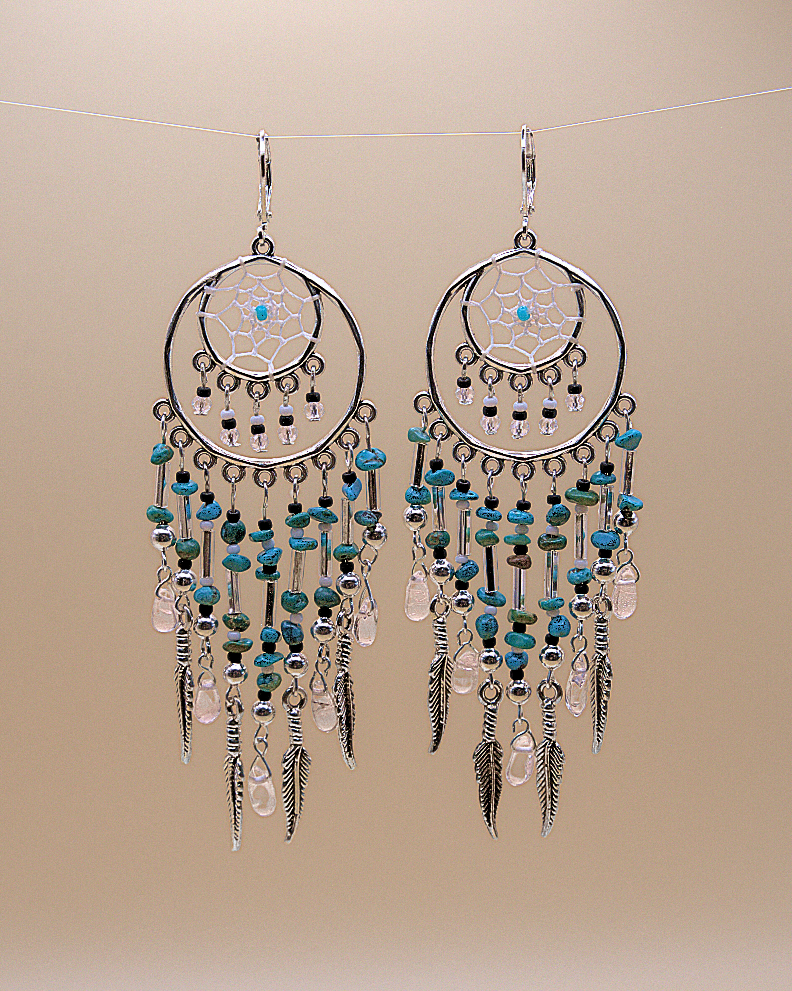 Beautiful two-tier Dangle Dream Catcher Statement Earrings made with very small turquoise chips, quartz teardrops, round faceted glass crystal beads, black & white seed beads, shiny silver bugle beads, round silver tone beads, silver tone feathers, round silver tone center piece, silver plated earring clasp and beading thread.