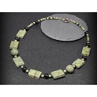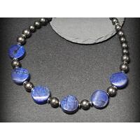 This statement contemporary necklace is made of big turquoise colors magnesite beads, black pearl beads (vintage, now old stock beads), and memory wire inside the rubber cord. The choker length is 18 inches+ extender chain.
