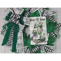 It is made with Poly burlap (which is weather resistant) on a Unique in the Creek frame. UITC Frames are made from 100% recycled plastic and are 100% recyclable. They have a solid plastic weather proof construction. Your wreath will have a sturdy and reliable frame that will not rust or warp.