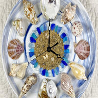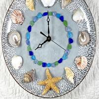 SHE SELLS SEASHELLS BY THE SEASHORE - inspired by collecting shells on the beach, these wall clocks feature an oyster shell with a real pearl at the 12 o’clock hour, starfish at 6 o'clock, and assorted seashells, set like the hours, around the plate rim with smaller seashells or sea glass lining plate bottom like minutes.