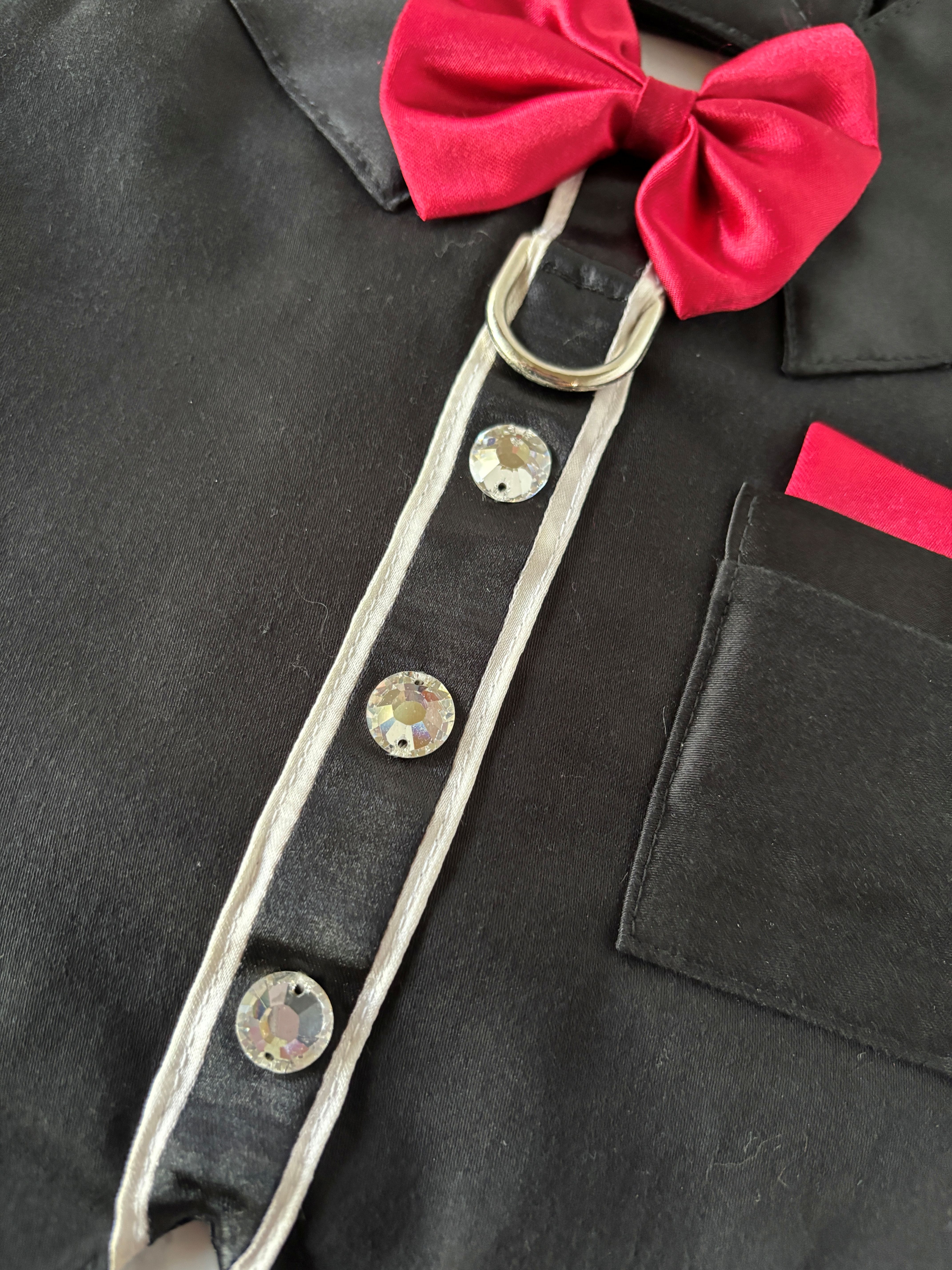 I made multiples of this harness for people's weddings, and the pups made the crowds ooh and ahh (almost more than some did when they saw the bride! LOL) The fabric, the gorgeous Austrian crystals including over-sized crystals as buttons, and the usable pocket! It is stunning! The harness has a solid cast D-ring to use for a leash, and is made this using pure Austrian Crystals (I can no longer use the name brand of the crystals because I am no longer a brand partner with them), and they are stunning and capture the light so beautifully.