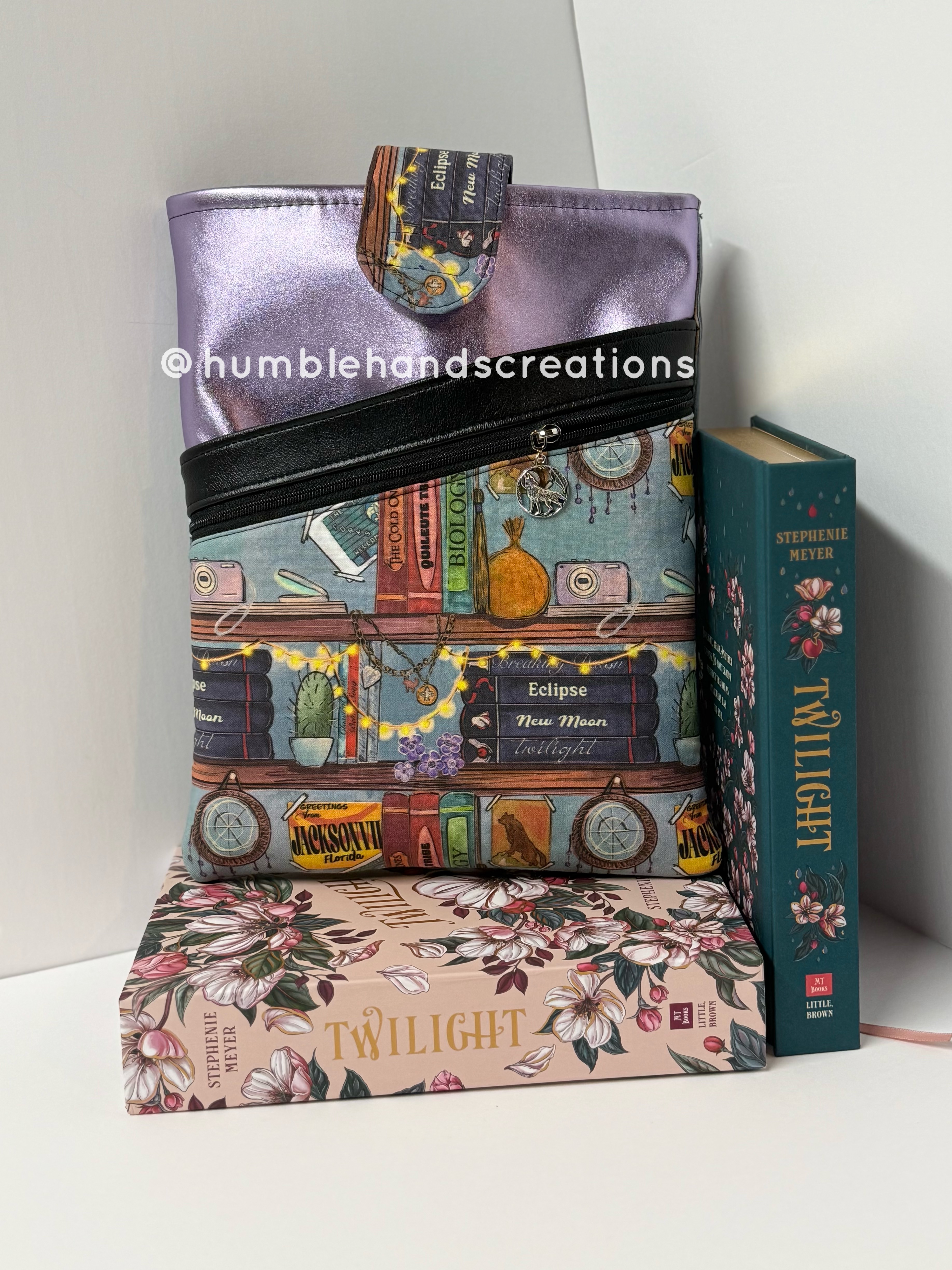 made with custom artist drawn focal print vinyl & materials from #womanownedbusinesses #shopsmallintheUSA #madeintheusa. Features all custom: outer print fan art inspired fabric of Bella’s Shelf & La Push Beach, Lavendar metallic faux leather, lined with purple waves material. Padded. Appx 10” x 8.5” x 2”. ONLY ONE AVAILABLE LIKE THIS. We never duplicate any of our creations exactly, so you can always be one of a kind with our creations. We can make a similar one, but you will know you have the ONLY one exactly like this. (While it lasts!) #shopsmall #madeingeorgia #madeintheusa #localmade #oneofakindbags #humblehandscreations #differentlyabledbusiness #neurodivergentartists
