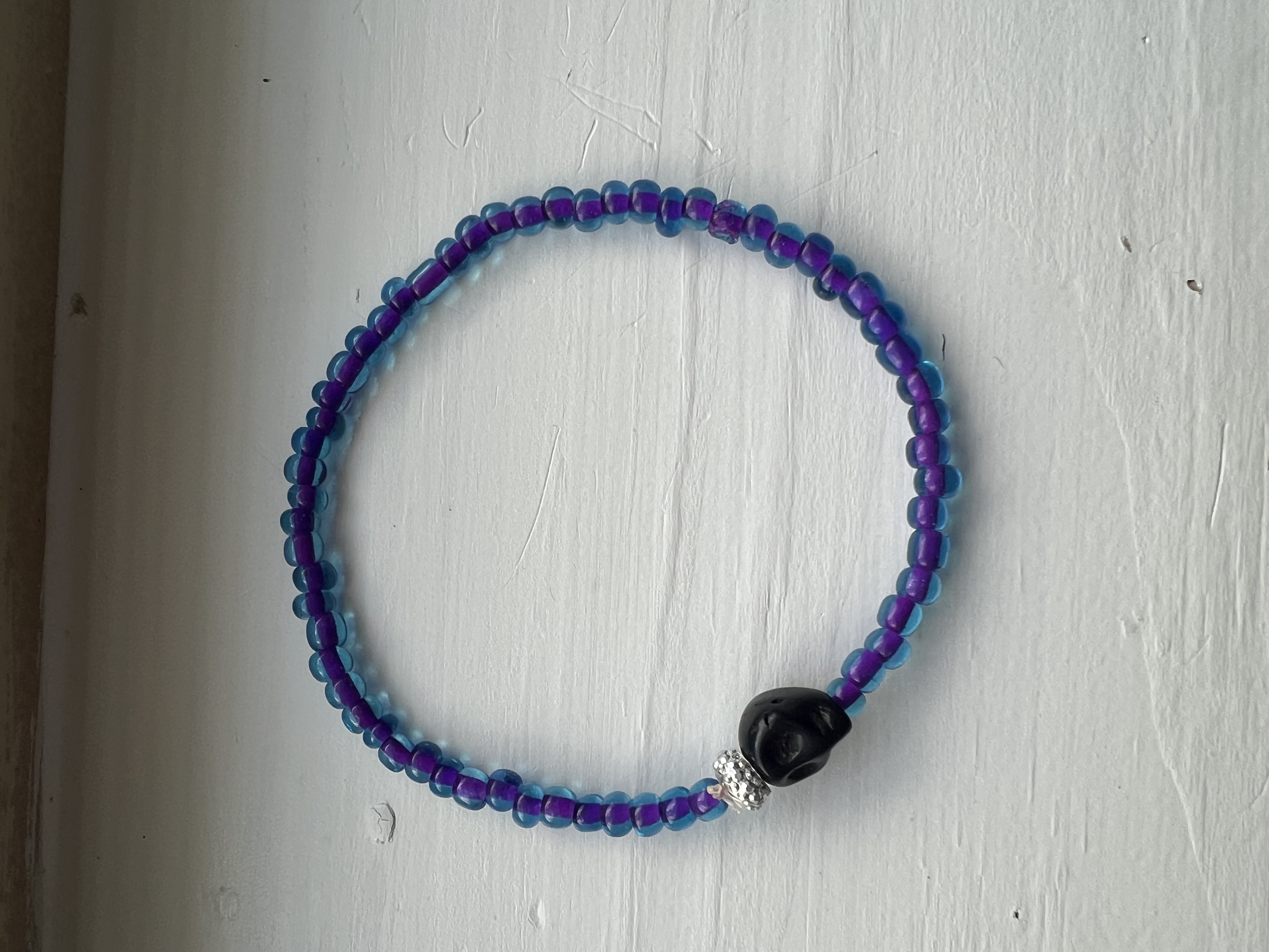 Each Twilight Skull Bracelet is handcrafted with alternating blue and purple seed beads, chosen for their twilight-inspired glow. A black skull bead serves as the focal point, balanced by a silver-toned rhinestone spacer for a touch of sparkle. Strung on durable elastic cord, this bracelet is lightweight, comfortable, and made in small batches to keep its enchanting character unique.