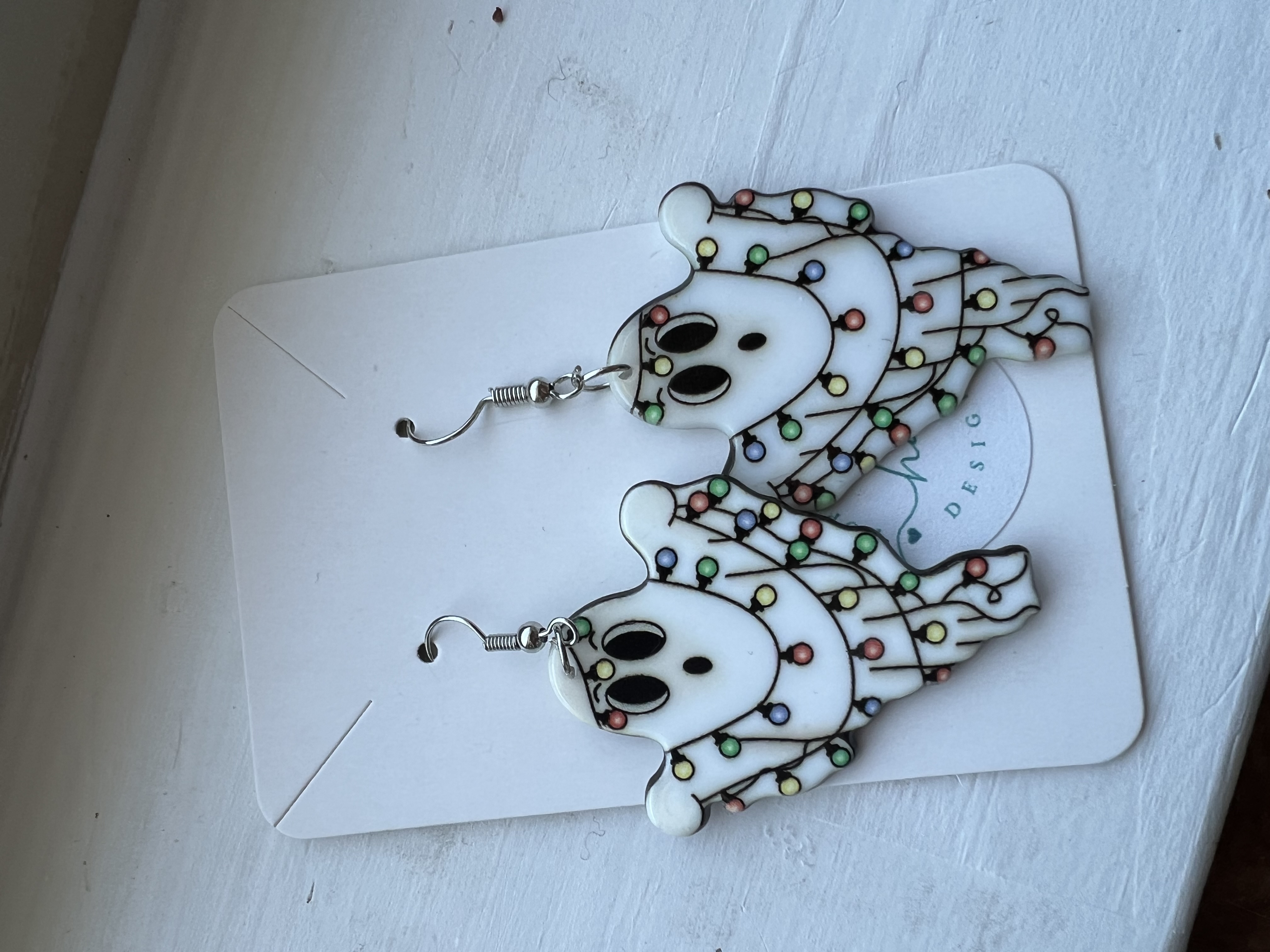 Each pair of Twinkle Boos is hand-assembled with care, featuring acrylic ghost charms printed with colorful holiday lights. They’re finished with stainless steel hooks for durability and comfort — and polished for that perfect twinkly shine.