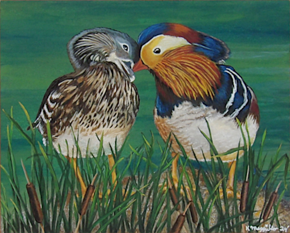 This original one-of-a-kind satin acrylic/oil-based gesso board Two Mallard Ducks painting is signed and dated. Titled: "This Is Love", it will make a great addition to your home or office. Ducks mate for life and these two snuggling birds love standing on a rock in front of cattails. It comes in a uniquely made rich black and brown mahogany wood shadow box style frame with rope trim, and black background. It's ready to hang. The back is a black wood board backing with an artist label. This will make a perfect gift for someone who loves ducks.