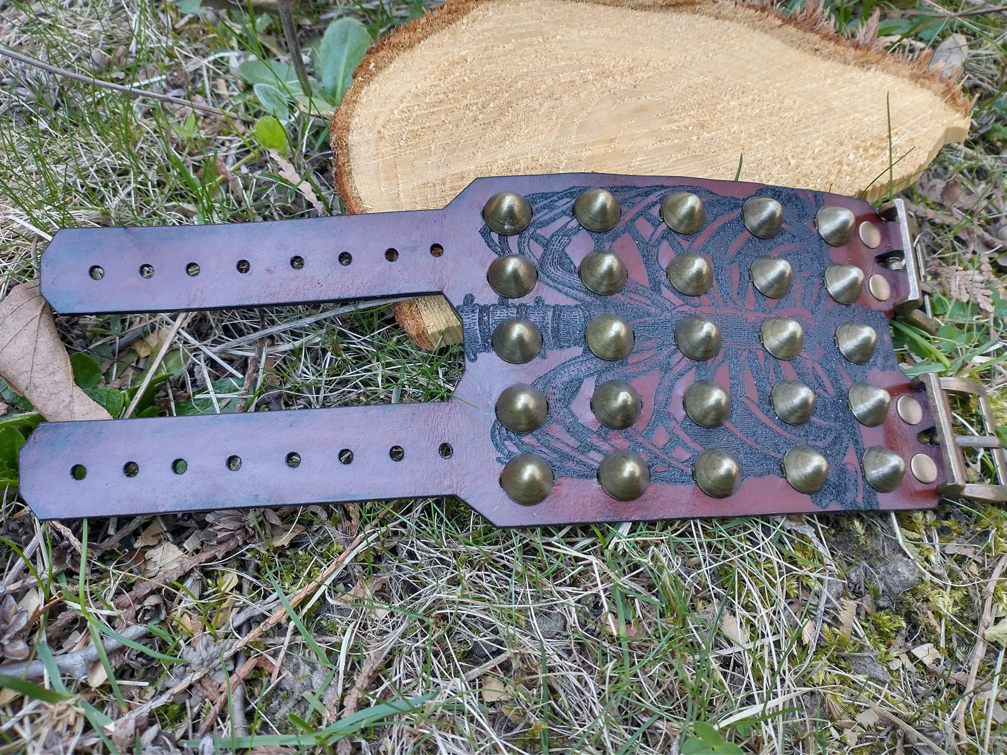 leather cuffs with a rib cage engraved onto it. may need to be broken in. 9 inches long, 3.5 inches wide. each one is hand made with some help from robots so they may not be entirely uniform.