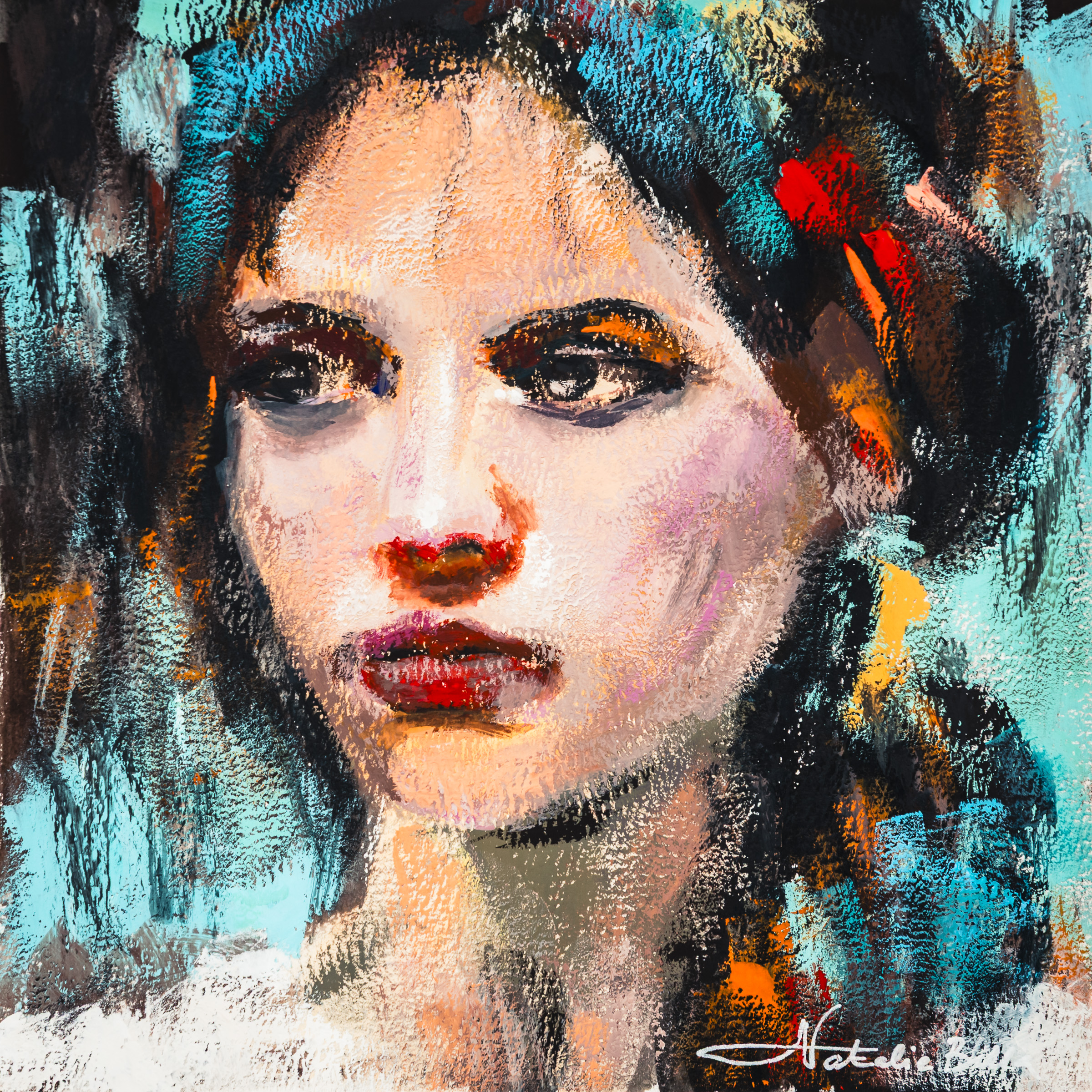 Each color is mixed fresh on my palette - no tube colors straight from the container. The skin tones are built from a complex mix of warm and cool notes, while the background uses bold, gestural strokes to create energy and movement around the subject's stillness.