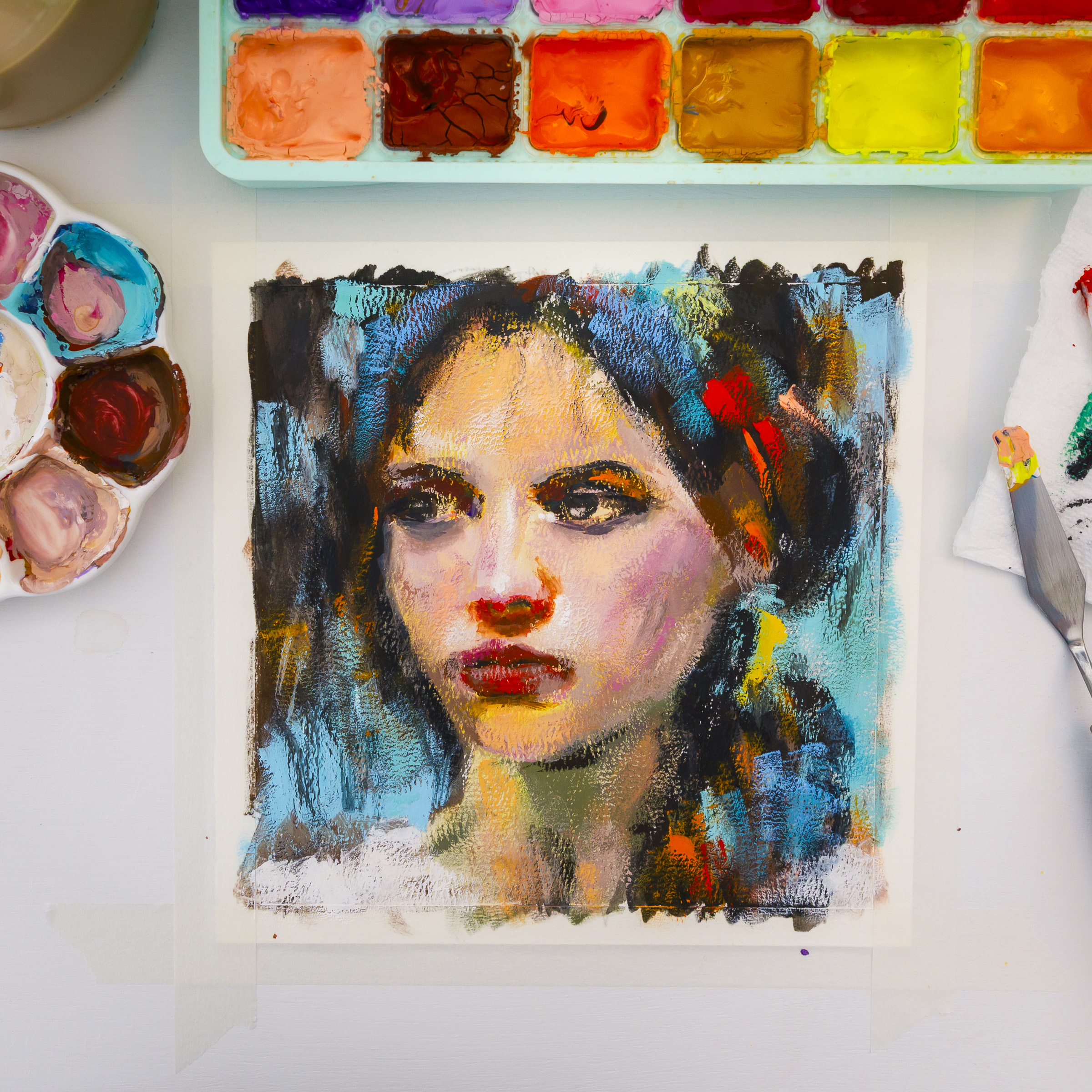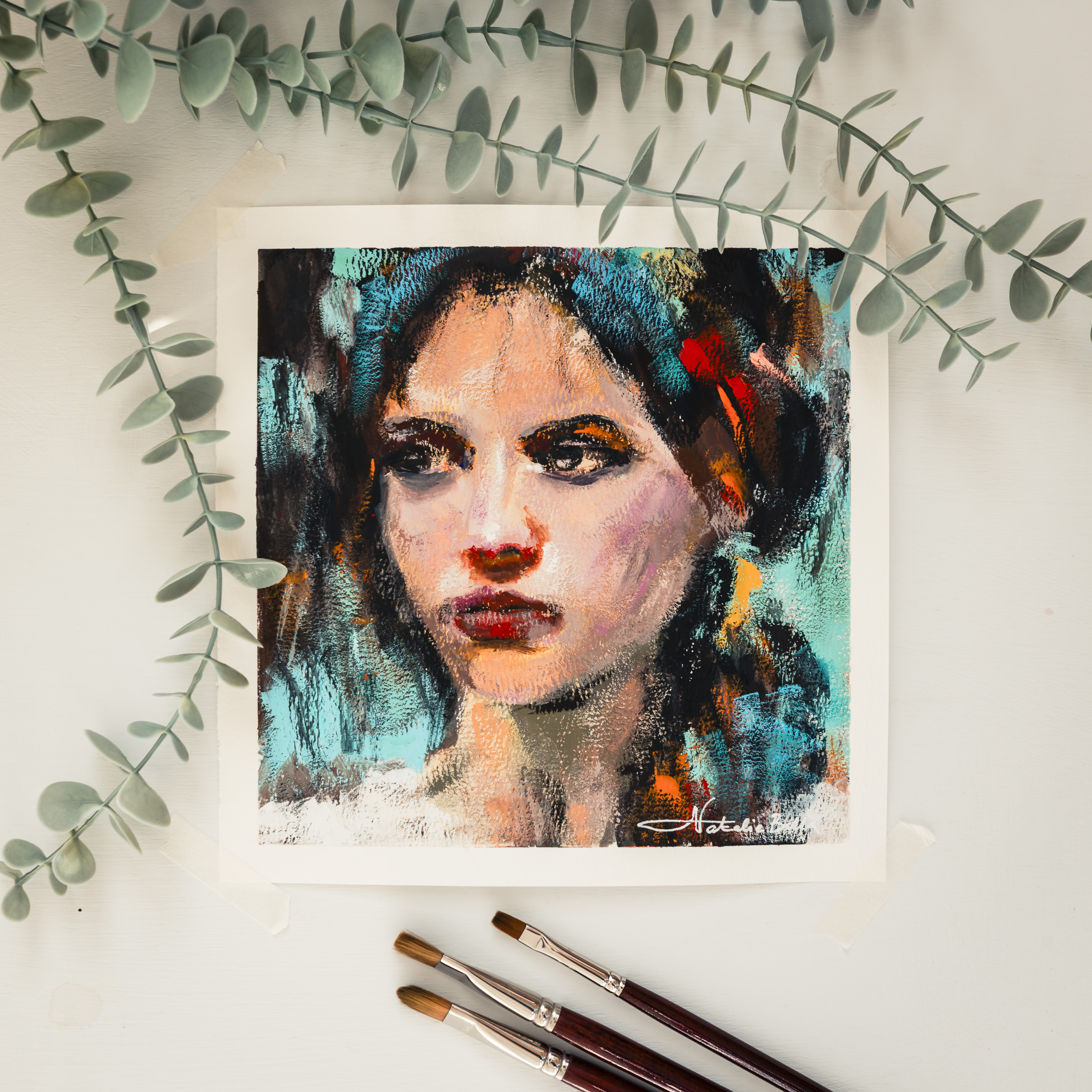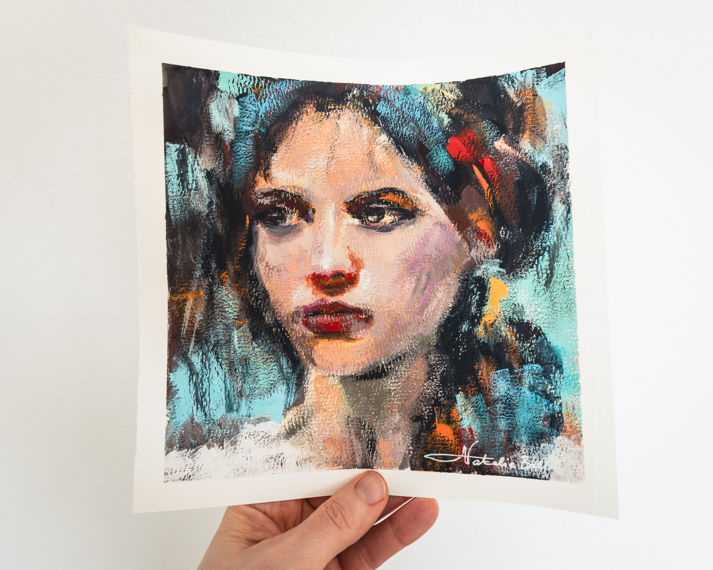 This portrait was painted with high-quality gouache paints on cold-pressed watercolor paper. I work wet-into-wet in some areas to create soft transitions, while using drier brush techniques for the more defined features. The process begins with loose washes of color to establish the overall mood, then I build up layers of opacity that gouache is known for.